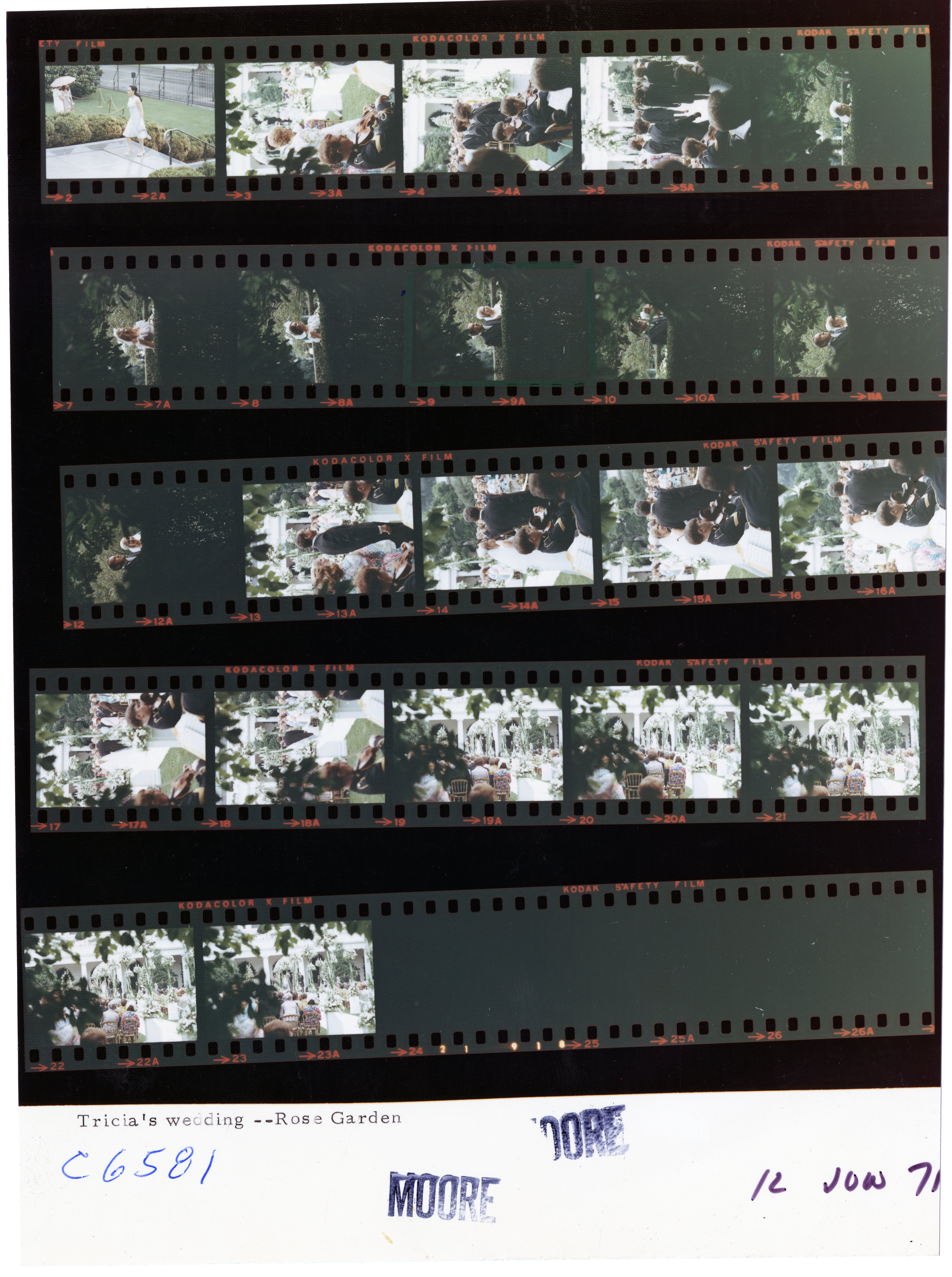 - Frame(s): WHPO-6561-13, View of Tricia Nixon and Ed Cox's ceremony from behind Rev. Dr. Edward Latch. 6/12/1971, Washington, D.C. White House, Rose Garden. Tricia Nixon, Ed Cox, Edward Latch, Julie Eisenhower, Howard Cox, Jr., guests.