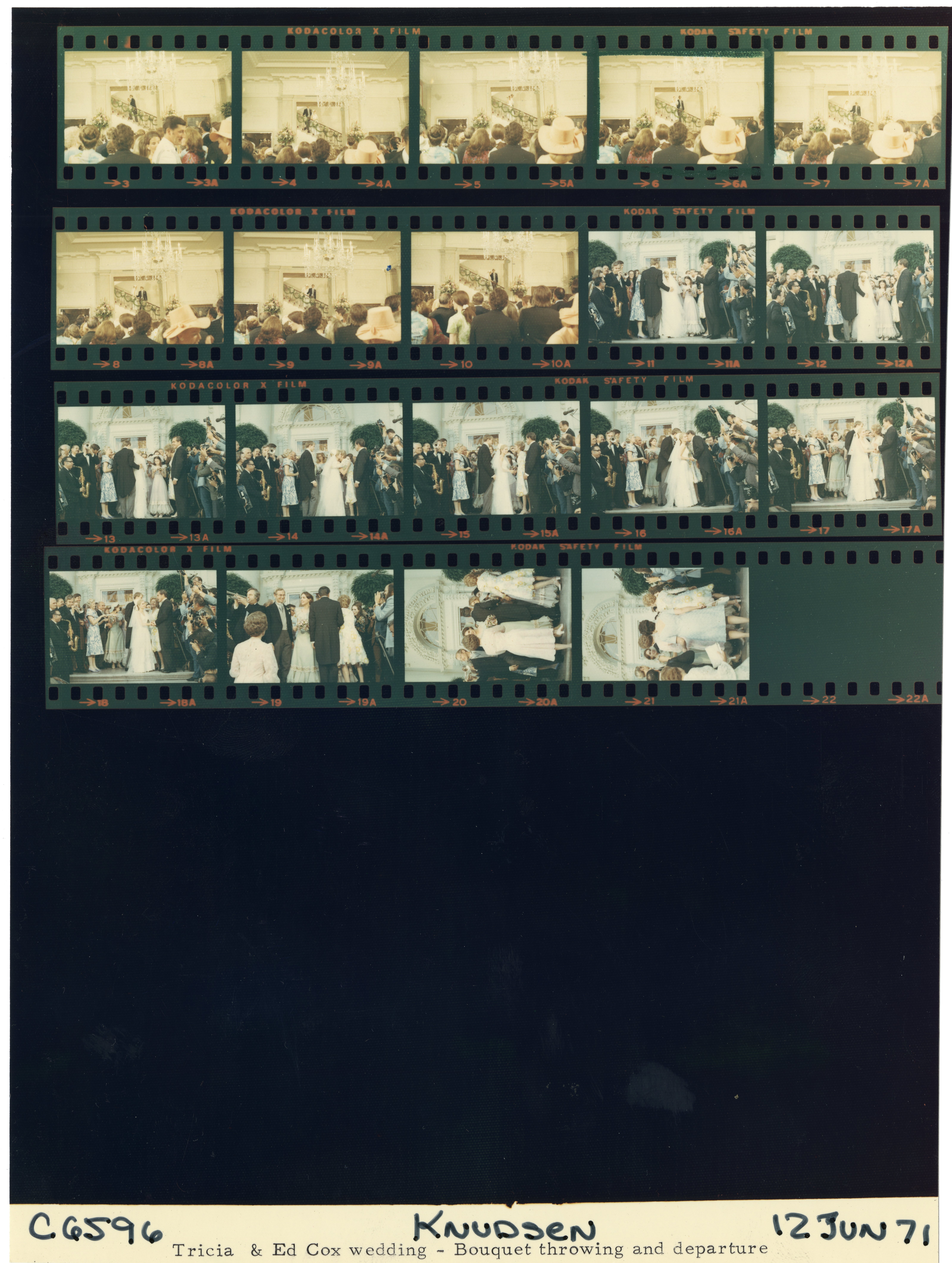 - Frame(s): WHPO-6594-16-22, Ed Cox and Tricia Nixon Cox admiring their wedding cake. 6/12/1971, Washington, D.C. White House, East Room. Ed Cox, Tricia Nixon Cox, wedding party members, unidentified man.