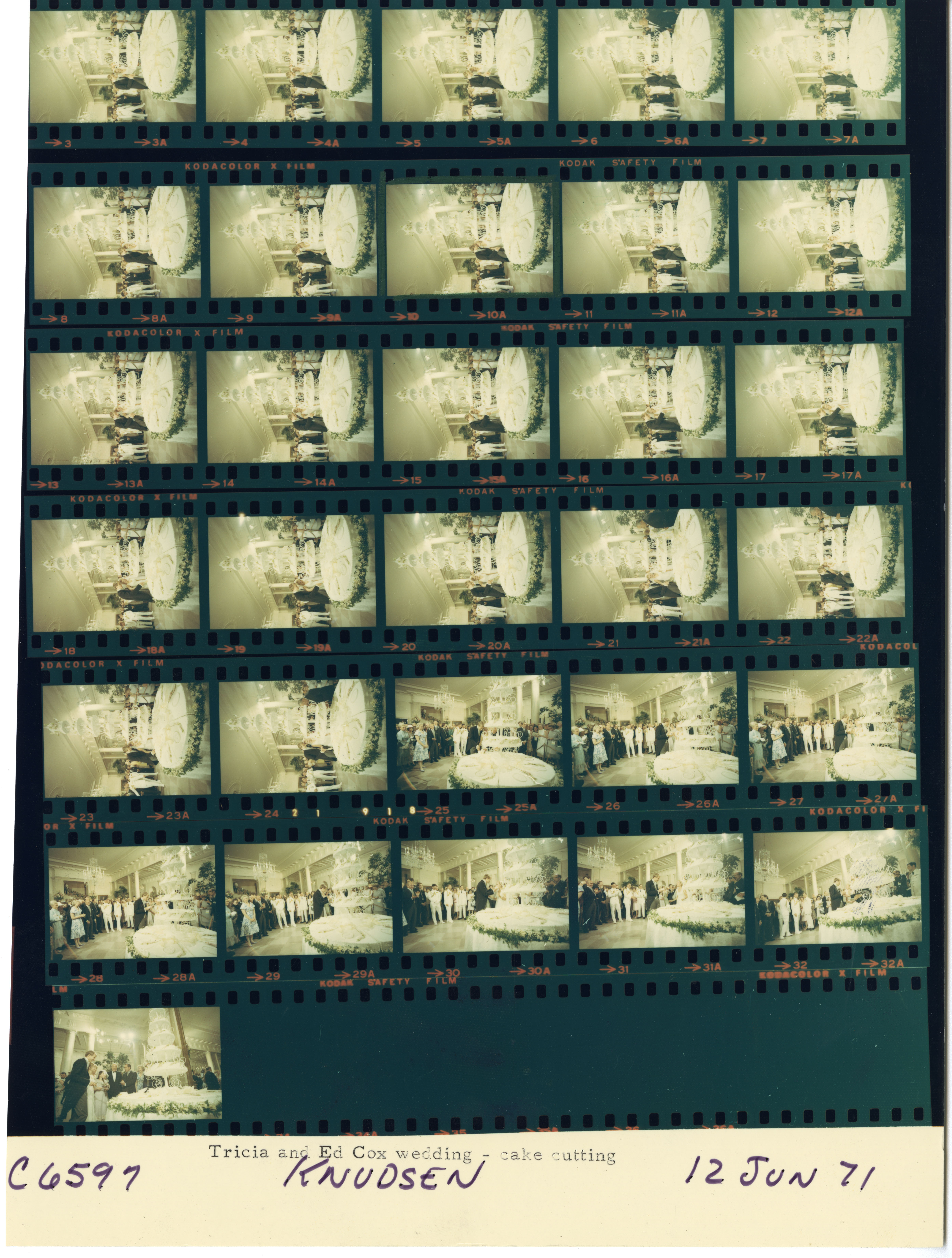 - Frame(s): WHPO-6597-03-33, Tricia Nixon Cox and Ed Cox cutting their wedding cake. 6/12/1971, Washington, D.C. White House, East Room. Tricia Nixon Cox, Ed Cox, President Nixon, wedding party members, guests.
