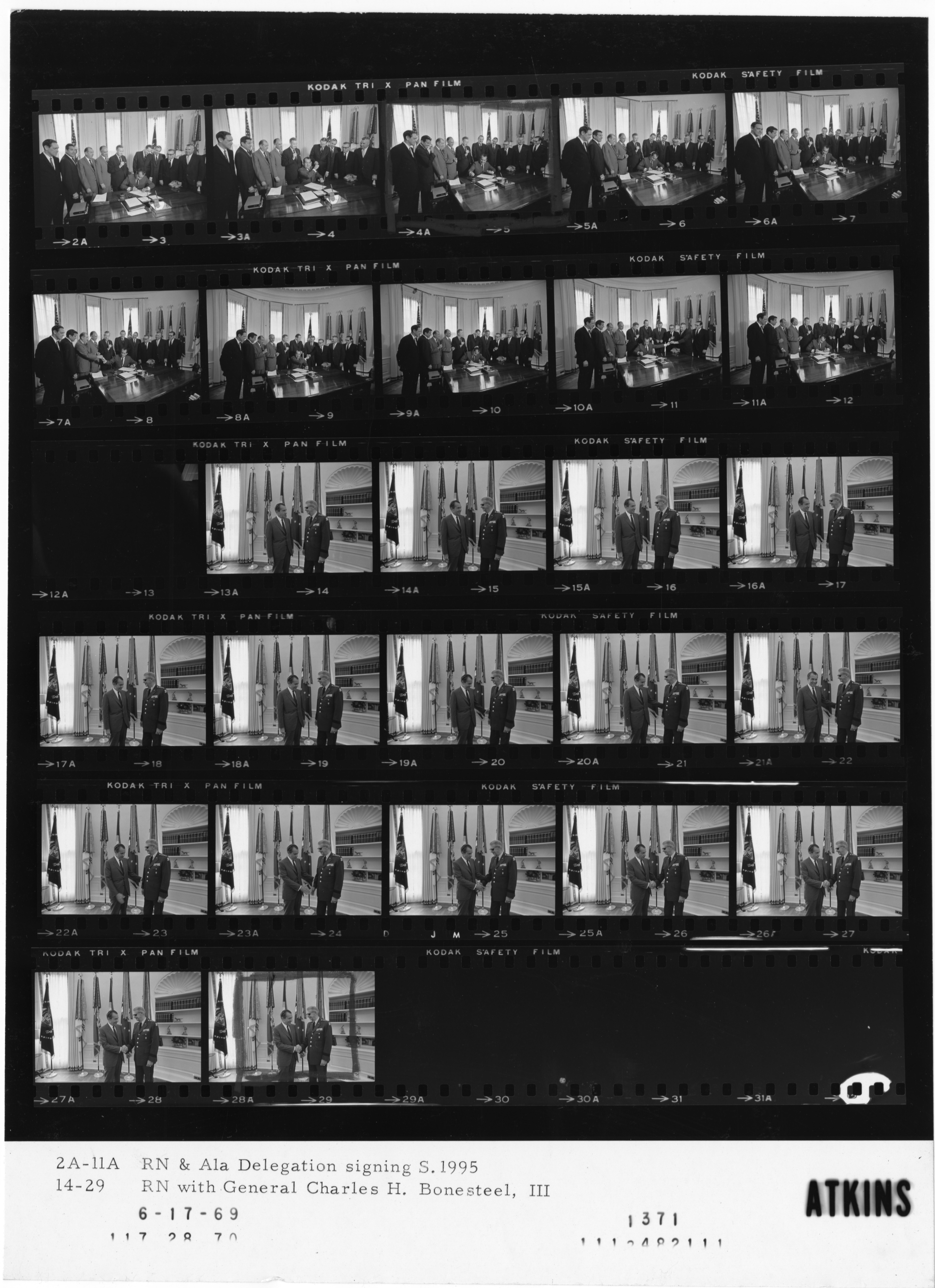 - Frame(s): WHPO-1371-02A-11A, President Nixon signing an act for a medal commemorating Alabama's 150th anniversary, surrounded by the Alabama Congressional delegation. 6/17/1969, Washington, D.C. White House, Oval Office. President Nixon, Sens. John Sparkman and James Allen, Reps. Jack Edwards, William Dickinson, George Andrews, William Nichols, Walter Flowers, John Buchanan, Tom Bevill, and Robert Jones.