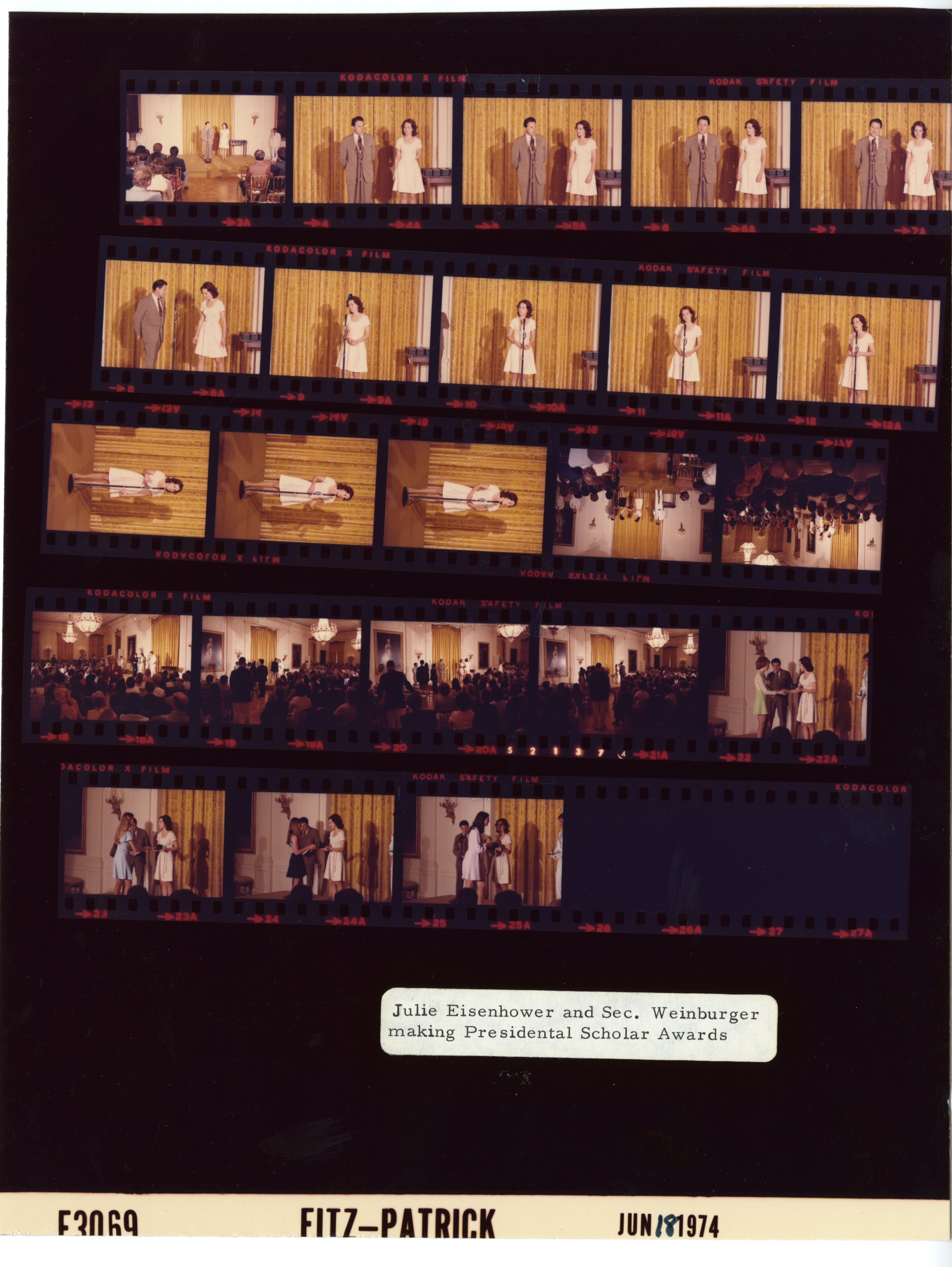 - Frame(s): WHPO-E3069-, Julie Eisenhower and Secretary Weinberger presenting the 1974 Presidential Scholar Awards. 6/17/1974, Washington, D.C. White House, East Room. Julie Eisenhower, Caspar Weinberger, Dr. John Ottina (Assistant Secretary of HEW), Dr. Edwin Martin (Deputy Commissioner of the Bureau of the Handicapped).