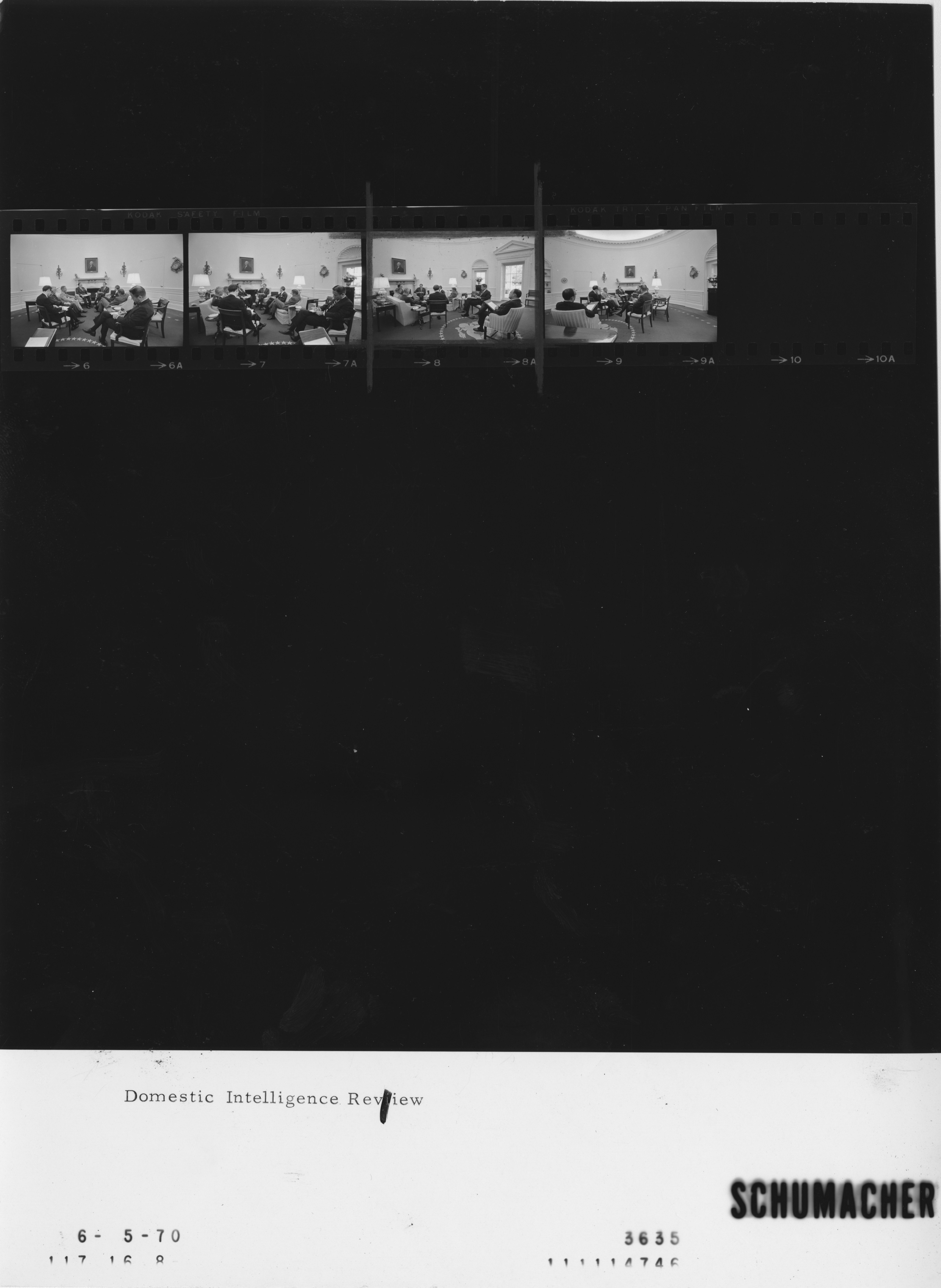 - Frame(s): WHPO-3635-06-09, President Nixon meeting with Henry A. Kissinger, Robert H. Finch (Secretary of HEW), John D. Ehrlichman, H. R. Haldeman, Richard M. Helms (Director of the CIA), and J. Edgar Hoover (Director of the FBI) as a part of the Domestic Intelligence Review. 6/5/1970, Washington, D.C. White House, Oval Office. President Nixon, Henry A. Kissinger, Robert H. Finch, John D. John Ehrlichman, H.R. Haldeman, Richard M. Helms, J. Edgar Hoover.