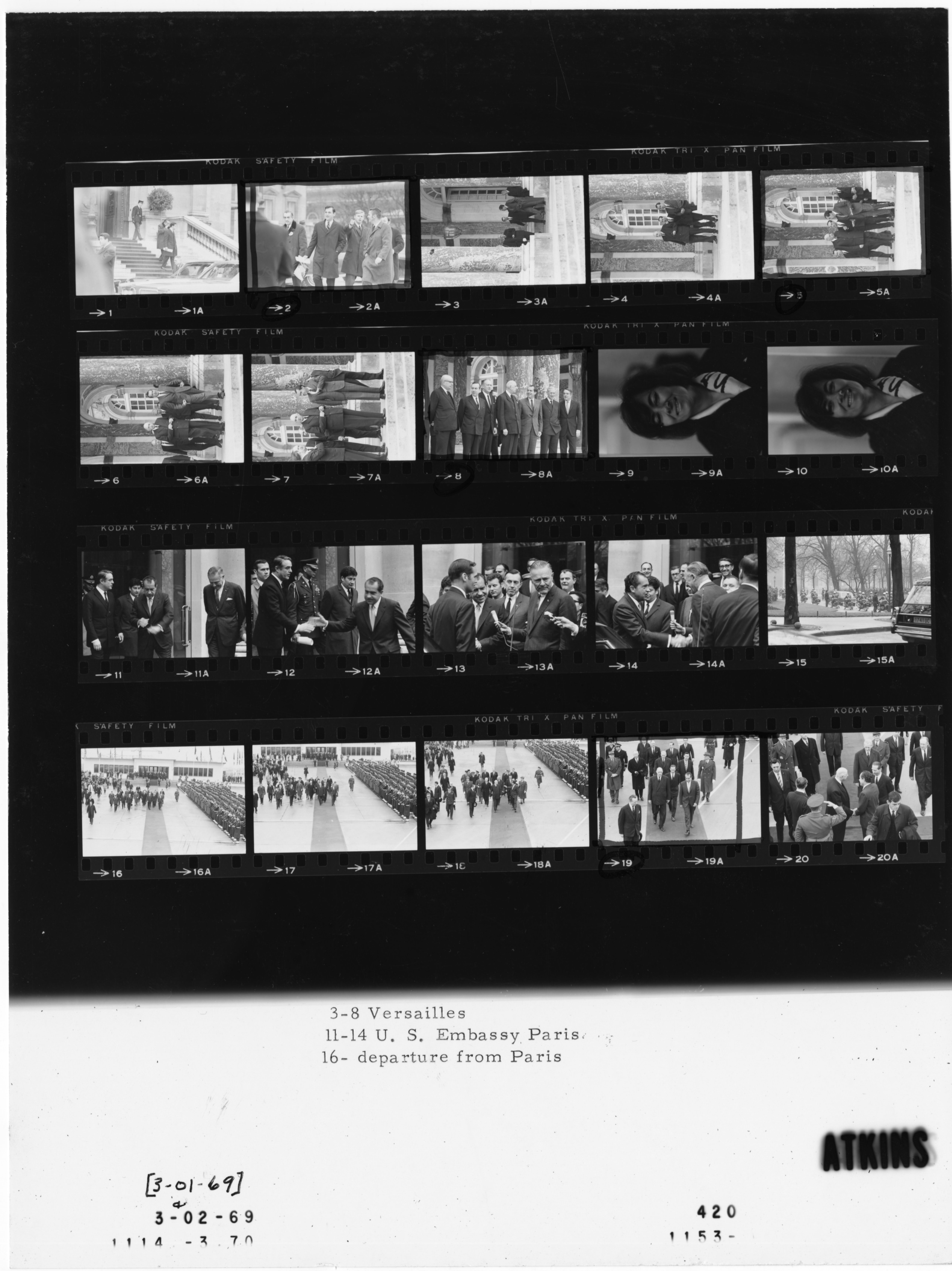 - Frame(s): WHPO-0416-, President Nixon arriving at the American Embassy. Nixon greeting invited French citizens and sitting with them around a conference table. Nixon shaking hands with Embassy employees and Marine guard. 3/1/1969, Paris, France American Embassy. President Nixon, Henry Kissinger, American officials, French citizens.