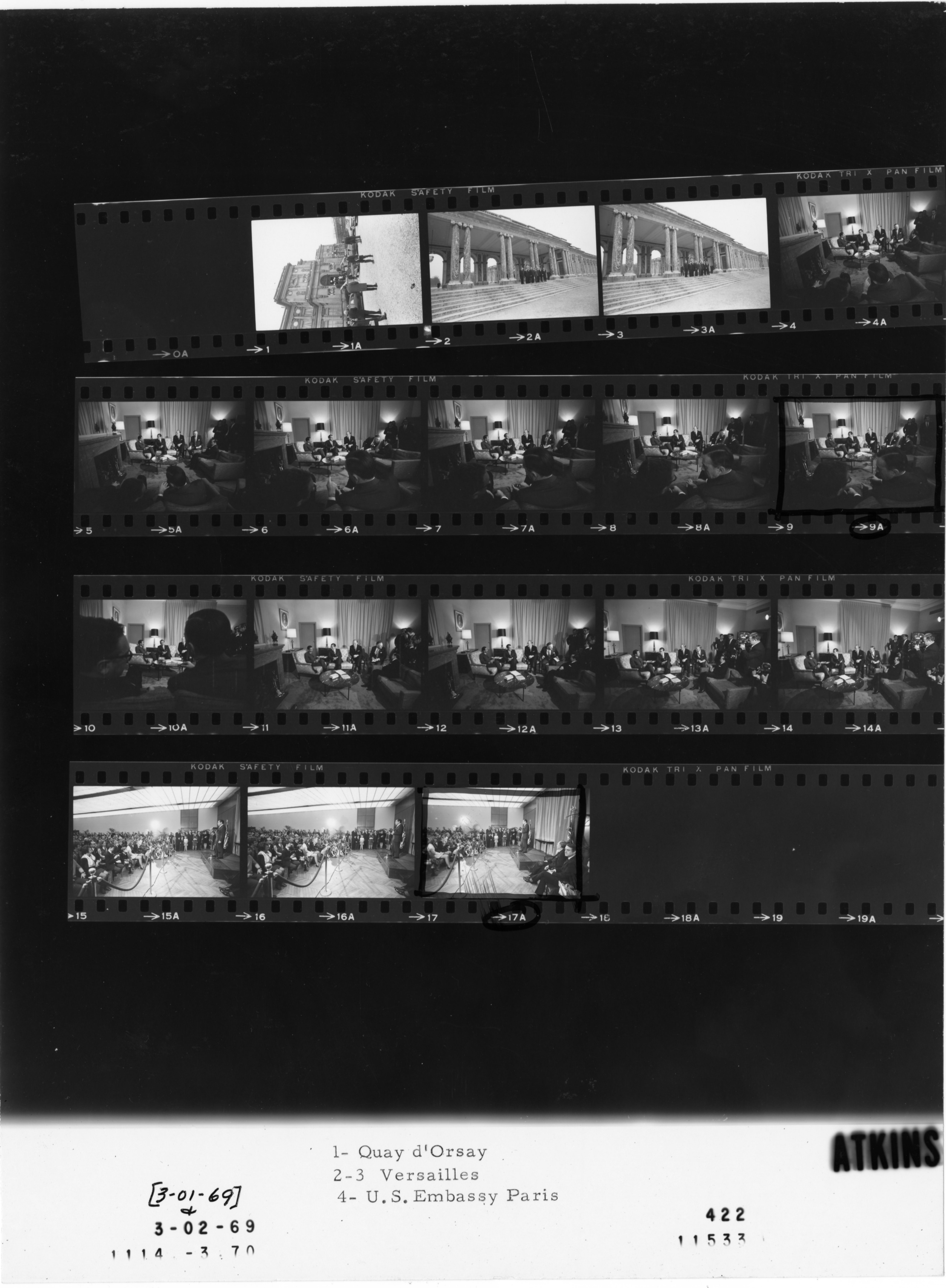 - Frame(s): WHPO-0417-02-10, President Nixon meeting with French citizens around a conference table. 3/1/1969, Paris, France American Embassy. President Nixon, Henry Kissinger, French citizens, American officials.