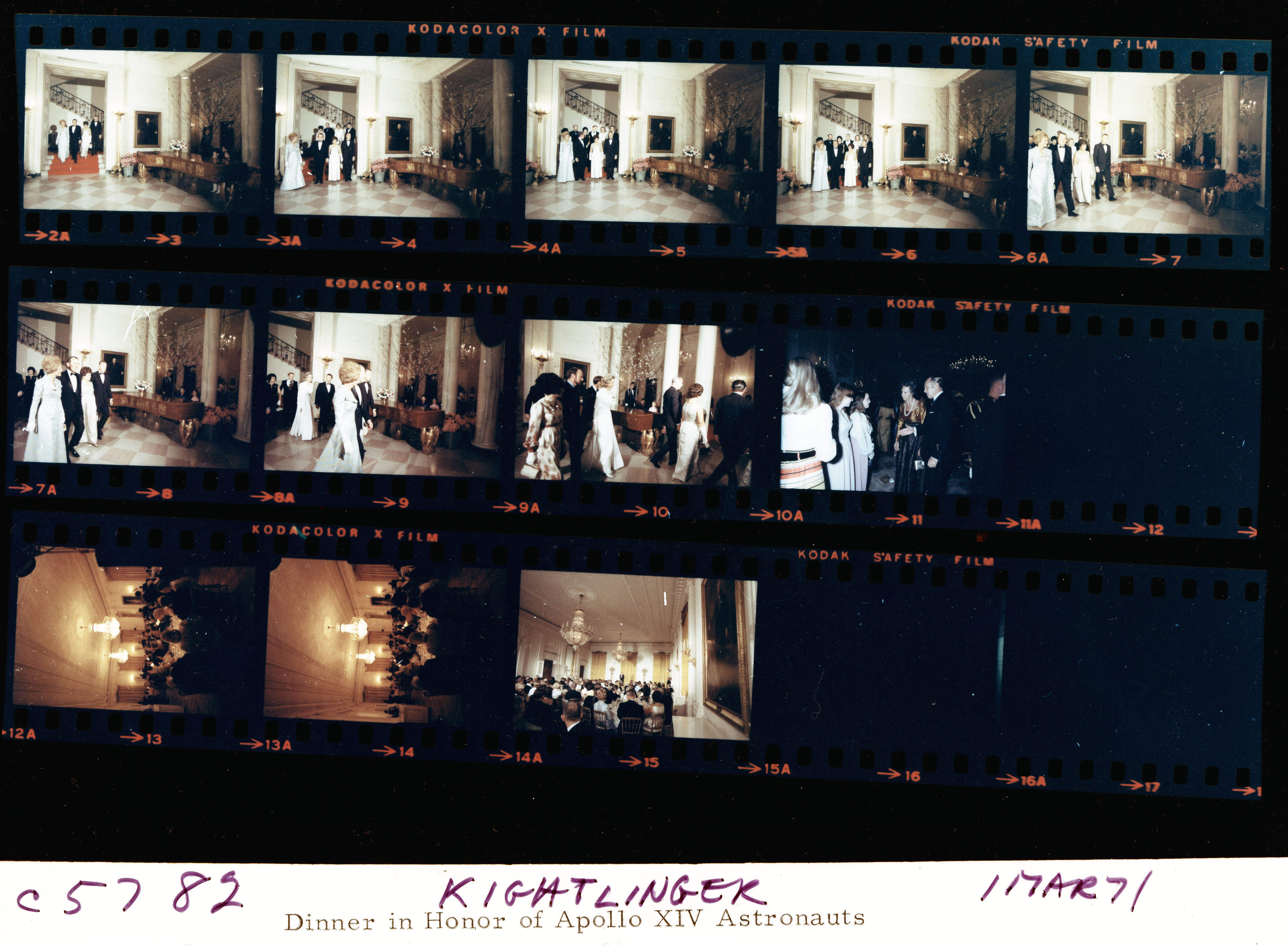 - Frame(s): WHPO-5782-, President Nixon, Pat Nixon, and the Apollo 14 astronauts before and during the dinner in honor of the astronauts. 3/1/1971, Washington, D.C. Grand Stairway, Grand Hall, White House, East Room. President Nixon, Pat Nixon, Spiro Agnew, Judy Agnew, Captain & Mrs. Alan Shepard, Captain & Mrs. Edgar Mitchell, Lt. Col. & Mrs. Stuart Roosa, guests.