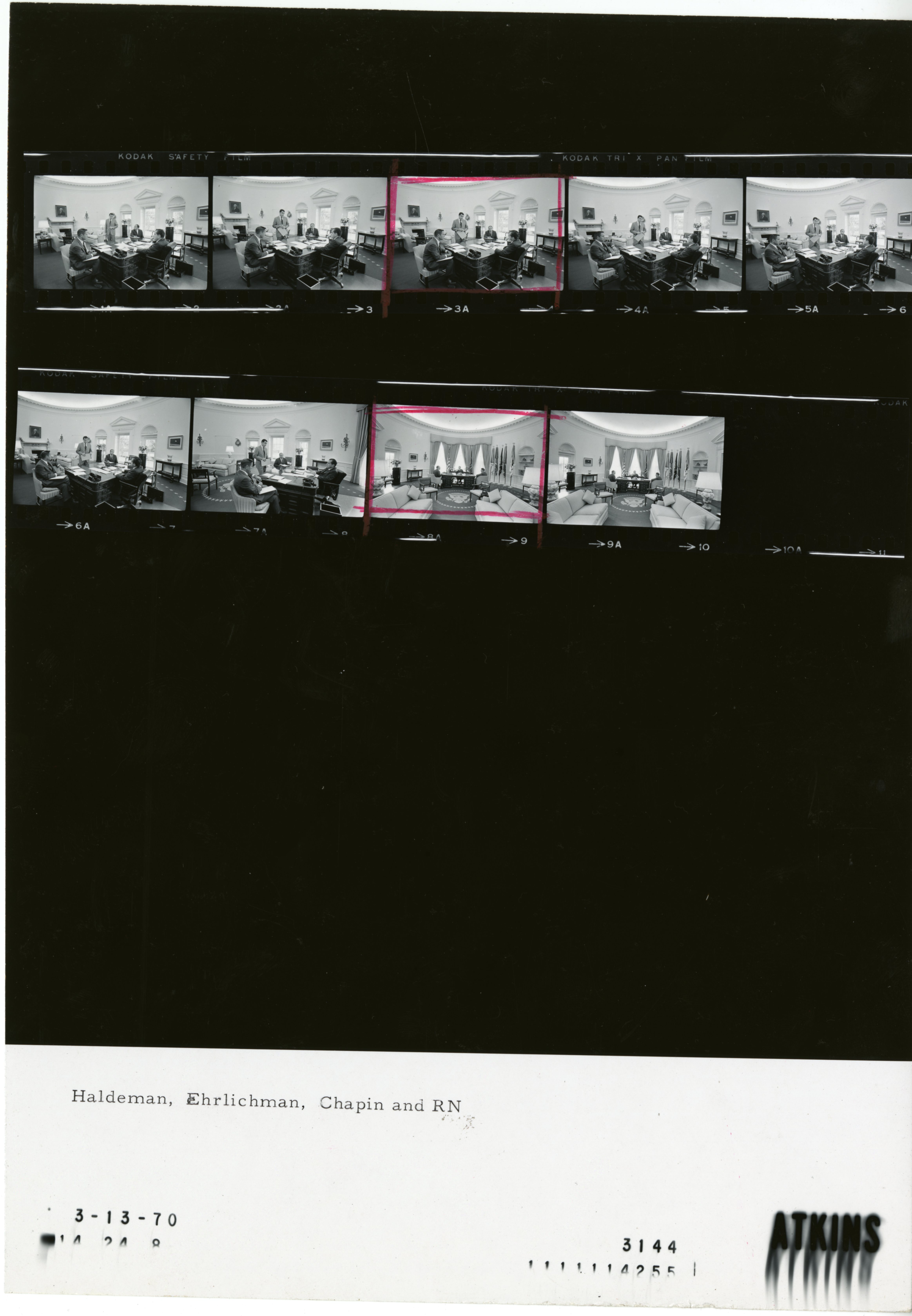 - Frame(s): WHPO-3144-01A-09A, President Nixon seated at his Oval Office desk during a meeting with John Ehrlichman, H. R. Haldeman and Special Assistant Dwight Chapin. 3/13/1970, Washington, D.C. White House, Oval Office. President Nixon, John D. Ehrlichman, H. R. Haldeman, Dwight Chapin.
