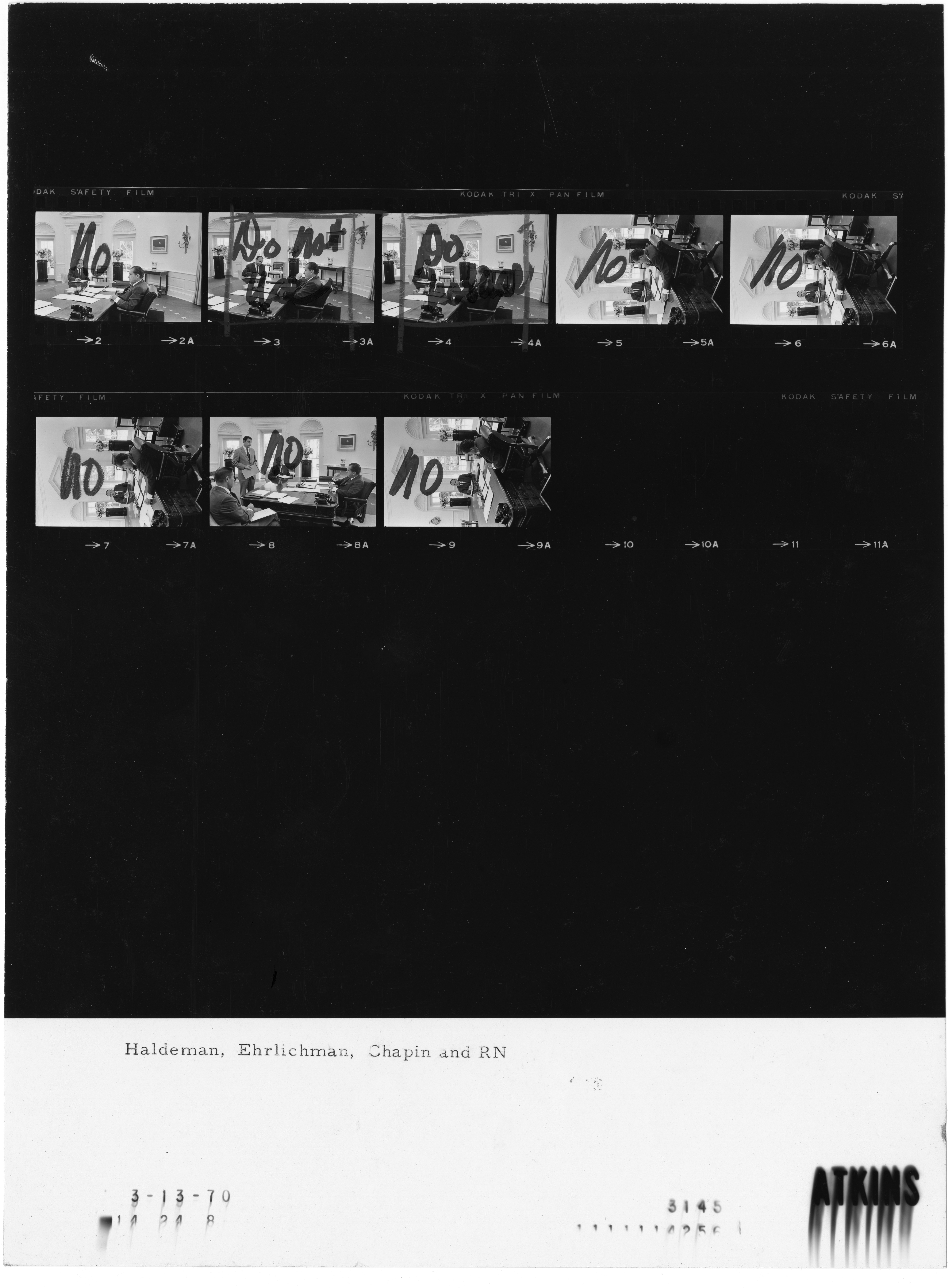 - Frame(s): WHPO-3145-02-09, President Nixon meeting with Assistants John D. Ehrlichman, H. R. Haldeman and Special Assistant Dwight Chapin. 3/13/1970, Washington, D.C. White House, Oval Office. President Nixon, John D. Ehrlichman, H. R. Haldeman and Dwight Chapin.