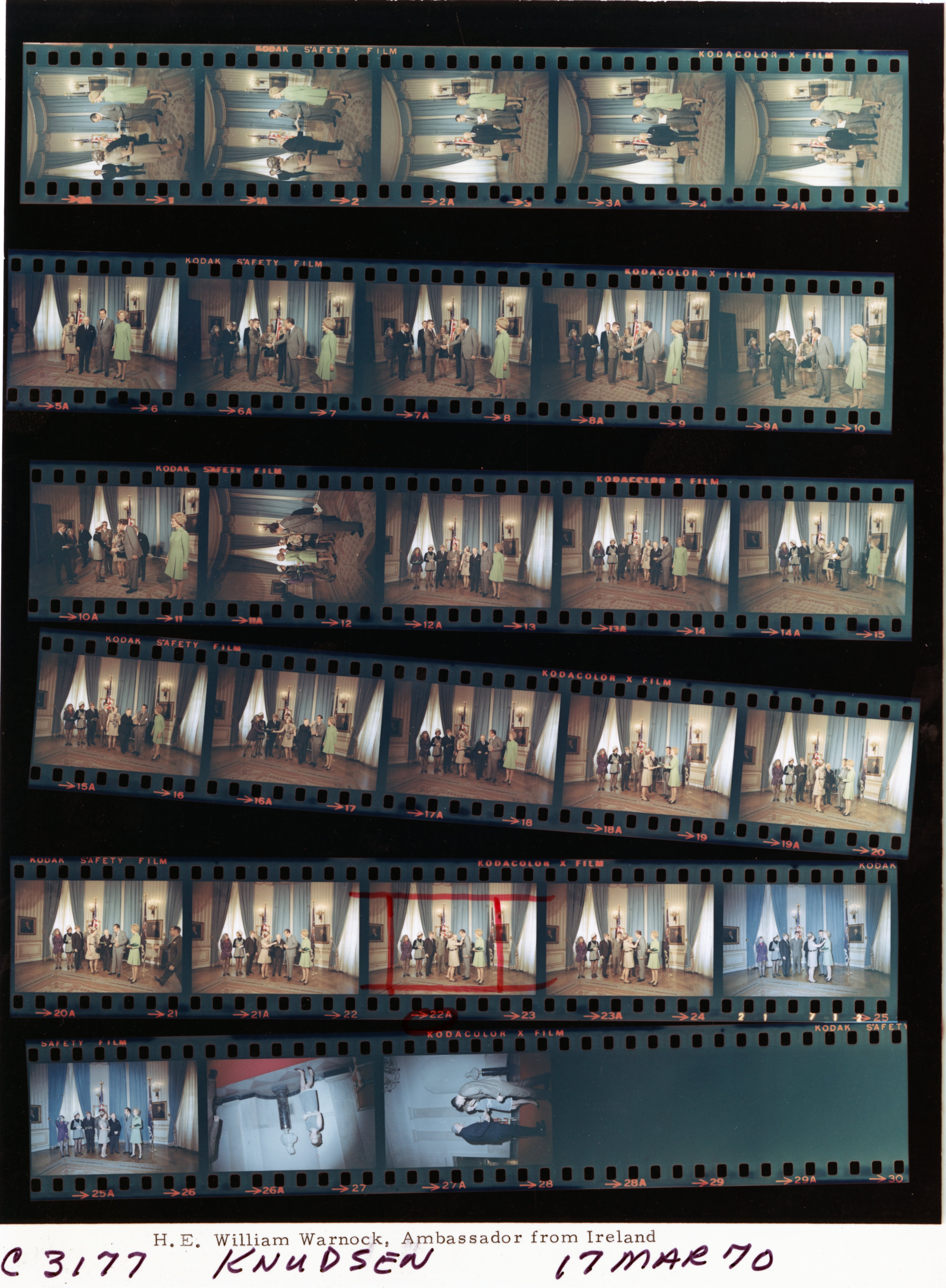 - Frame(s): WHPO-3177-00A-27A, President Nixon receiving diplomatic credentials from Ambassador William Warnock of Ireland. 3/17/1970, Washington, D.C. White House, Blue Room. President Nixon, Pat Nixon, Emil B. Mosbacher, Ambassador and Mrs. Warnock, children.