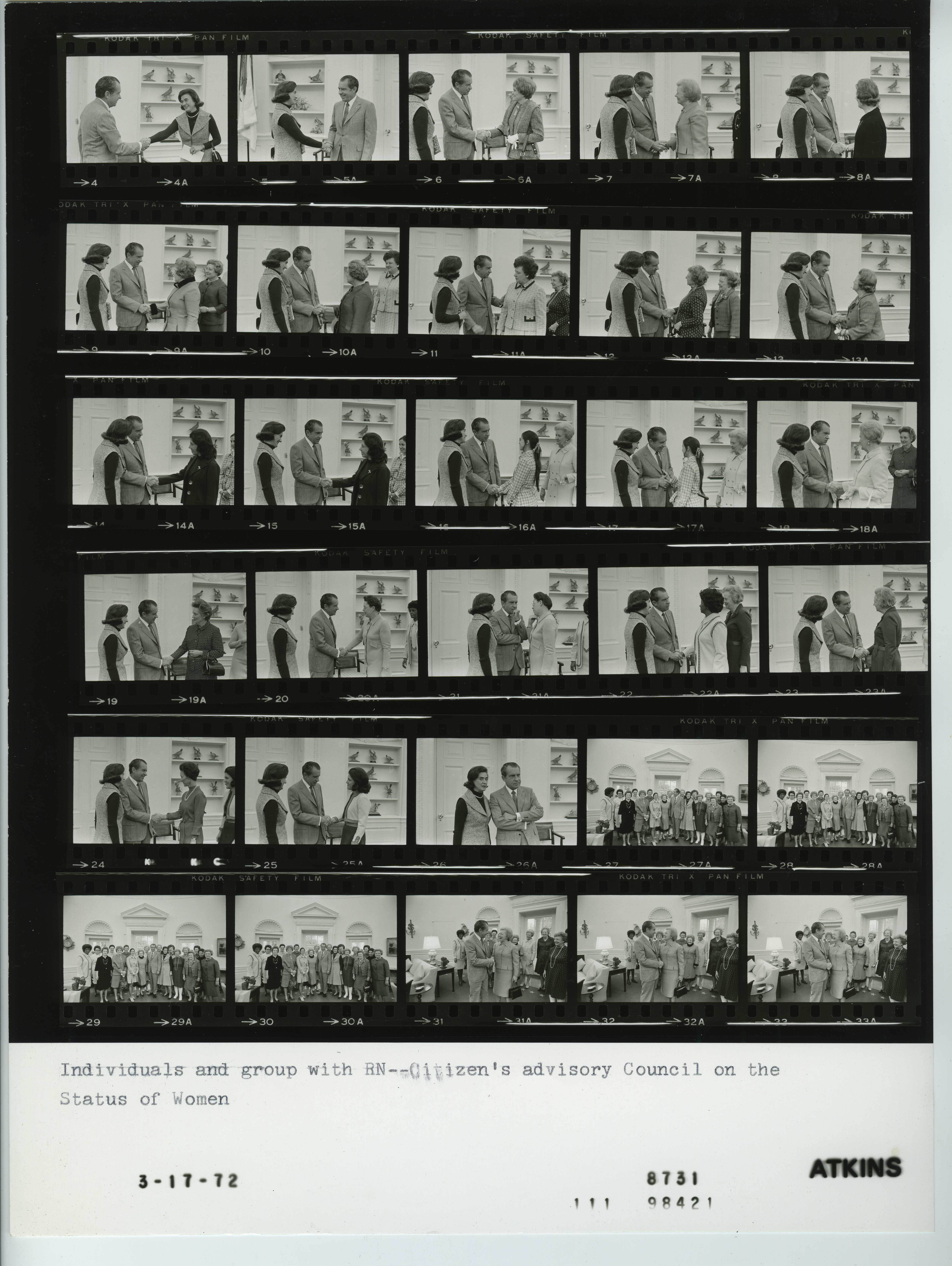 - Frame(s): WHPO-8731-04-26, President Nixon greeting individual members of the Citizen's Advisory Council on the Status of Women in the Oval Office. 3/17/1972, Washington, D.C. White House, Oval Office. President Nixon, advisory council members: Mrs. Elizabeth D. Koontz (Deputy Assistant Secretary of Labor Women's Bureau), Miss Hazel Palmer (Attorney), Irene Wischer (President Paladin Pipeline Co.), Julie Casterman Connor (school teacher), Dr. Margeret Long Arnold (President General Federation of Women's Clubs New York), Mrs. Jacqueline G. Gutwillig (Chairman, Arizona), Mrs. Lorraine L. Blair (President, Lorraine Blair, Inc., Investments; Illinois), Mrs. Chapman Revercomb (Civic Leader, West Virginia), Mrs. Daniel H. Wasserman (Civic Leader; Ohio), Second Row: Mrs. Catherine East (Advisory Council Executive Secretary), Sarah Jane Cunningham (Attorney; Nebraska), Mrs. Robert A. Griffin (Civic Leader; North Carolina), Mrs. Charles M. Hamel, (Vice President, Hamel's Dairy & Ice Cream Company, Inc.; Louisiana), Miss Nola A. Allen (Attorney; Indiana), Miss Maxine R. Hacke (Warren Petroleum Corporation; Oklahoma), Miss Margaret J. Mealey (Executive Director, National Council of Catholic Women; Washington, D. C.), Mrs. Bertha Whittaker (Deputy to Catherine East), Mrs. Paul Bethel (U. S. Citizens' Committee for Free Cuba: Florida).