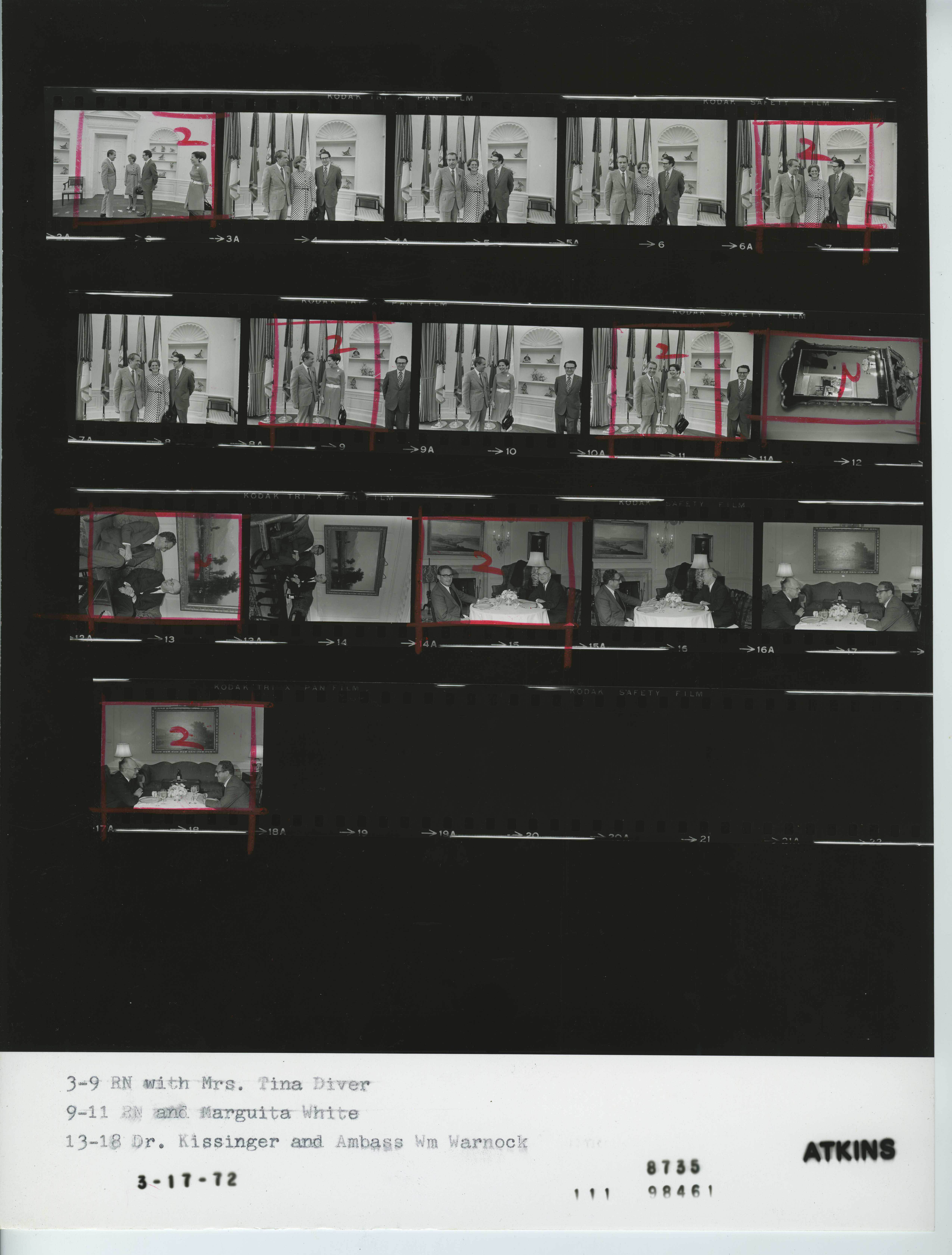 - Frame(s): WHPO-8735-02-12, President Nixon standing with Tina Diver, Neil Diver, and Margita White in various shots. 3/17/1972, Washington, D.C. White House, Oval Office; unknown. President Nixon, Tina Diver, Neil Diver, Margita White, Kissinger, William Warnock.