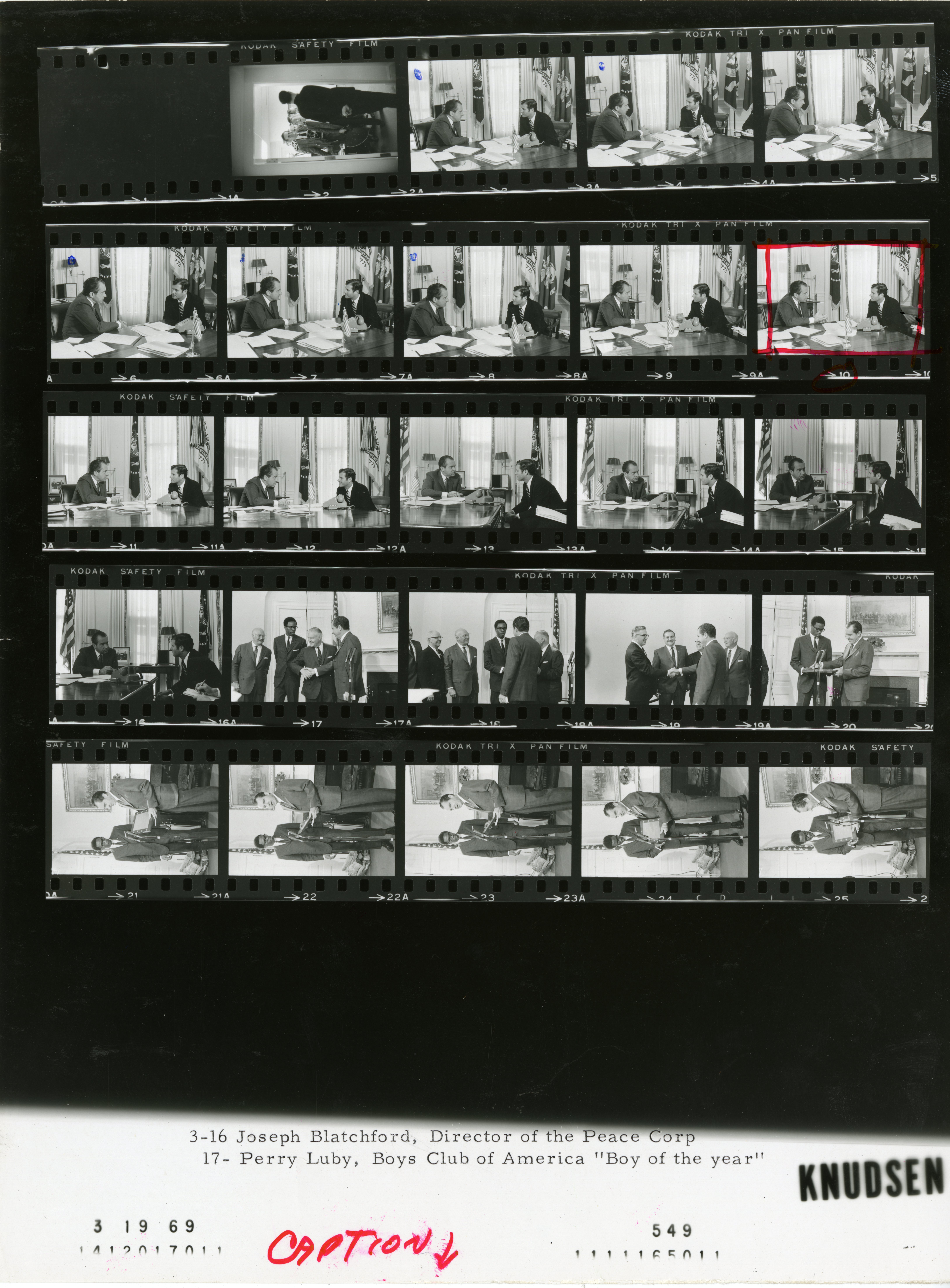 - Frame(s): WHPO-0549-10, President Nixon conferring with Joseph Blatchford, Peace Corps Director, seated at President Nixon's desk. 3/19/1969, Washington, D.C. White House, Oval Office. President Nixon, Joseph Blatchford.