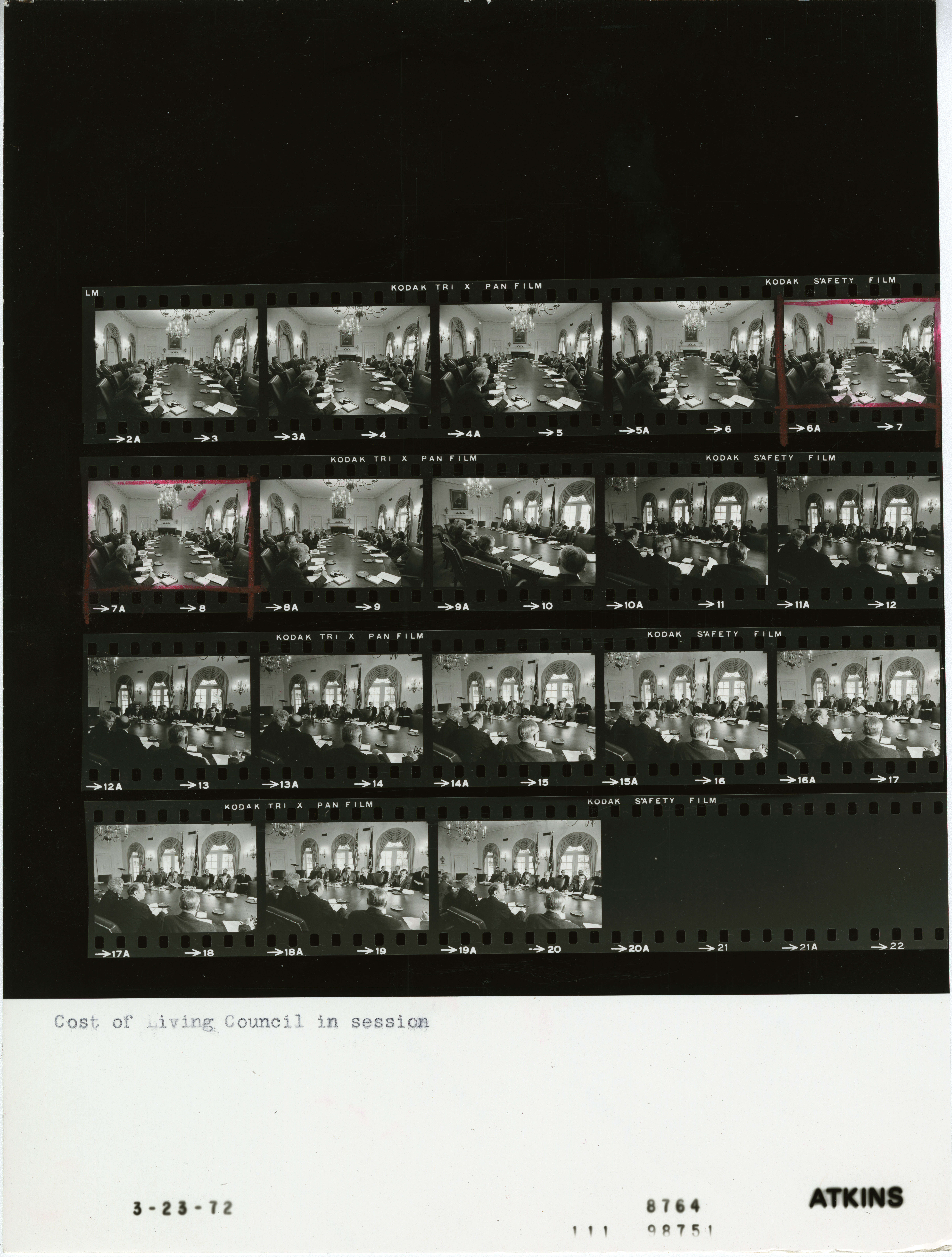- Frame(s): WHPO-8764-, President Nixon meeting with the Cost of Living Council members President Nixon, John B. Connally Secretary of the Treasury, Herbert Stein Chairman of the Council of Economic Advisers, Donald Rumsfeld Counsellor, J. Phil Campbell, Jr. Under Secretary of Agriculture, Peter G. Peterson Secretary of Commerce, James D. Hodgson Secretary of Labor, George W. Romney Secretary of HUD, George P. Shultz Director of the OMB, George A. Lincoln Director of the Office of Emergency Planning, Virginia Knauer Special Consultant, Arthur F. Burns Director of the Board of Governors of the Federal Reserve System, James W. McLane Deputy Director, Albert E. Abrahams Assistant Director, Joseph Mullaney General Counsel, Marvin Kosters Assistant Director, Richard DICK Cheney Assistant Director, James Connor Assistant Director, Richard Alfultis Assistant Director, Donald P. Smith Executive Secretariat, Clark MacGregor Counsel, William Gifford Special Assistant Department of Labor, Charles Perry Staff Associate Director OMB. 3/23/1972, Washington, D.C. White House, Cabinet Room. President Nixon, John B. Connally, Herbert Stein, Donald Rumsfeld Counsellor, J. Phil Campbell, Jr, Peter G. Peterson, James D. Hodgson, George W. Romney, George P. Shultz, George A. Lincoln, Virginia Knauer, Arthur F. Burns, James W. McLane, Albert E. Abrahams, Joseph Mullaney, Marvin Kosters, Richard (Dick) Cheney, James Connor, Richard Alfultis, Donald P. Smith, Clark MacGregor, William Gifford, Charles Perry Staff Associate Director OMB.