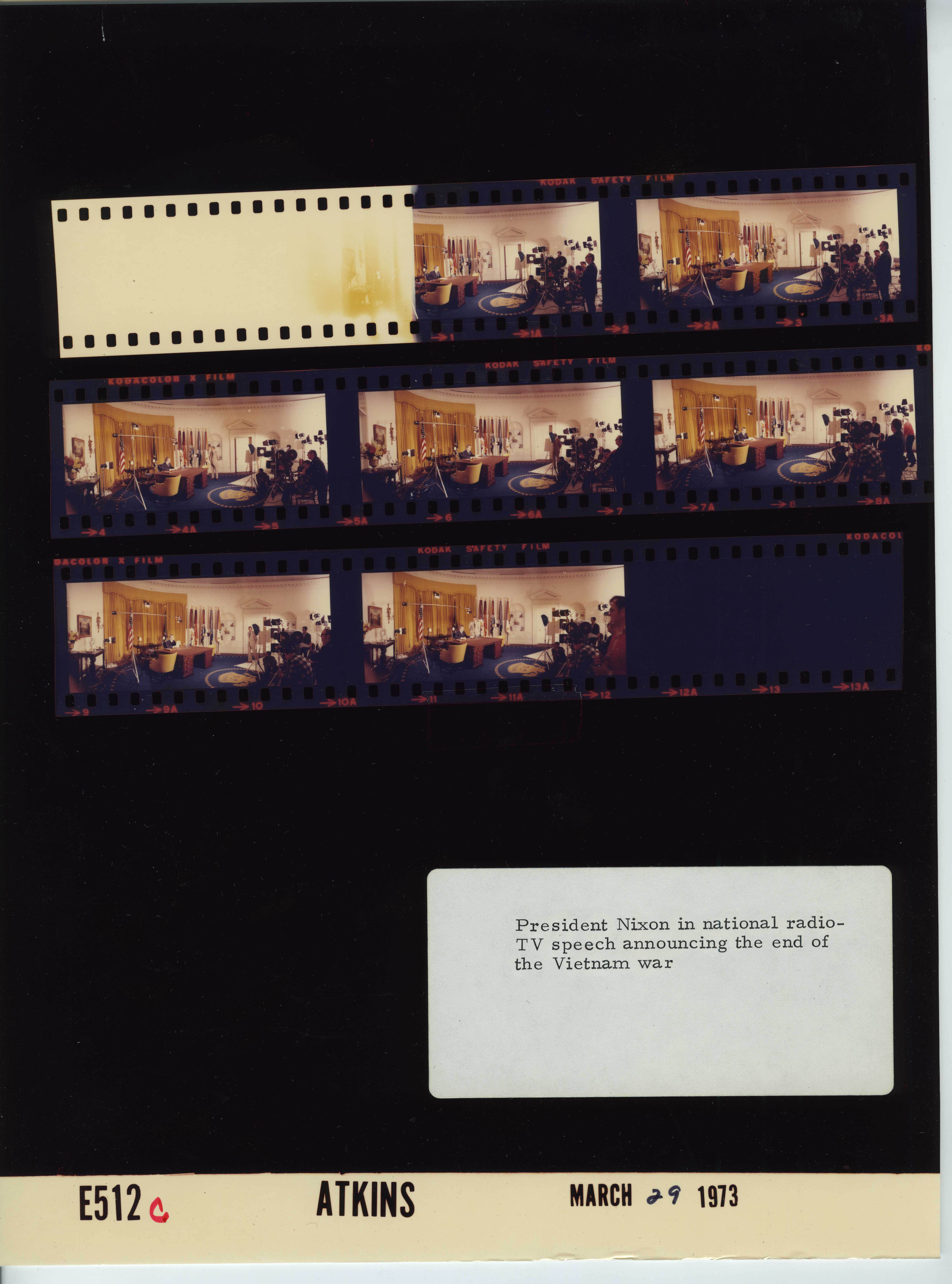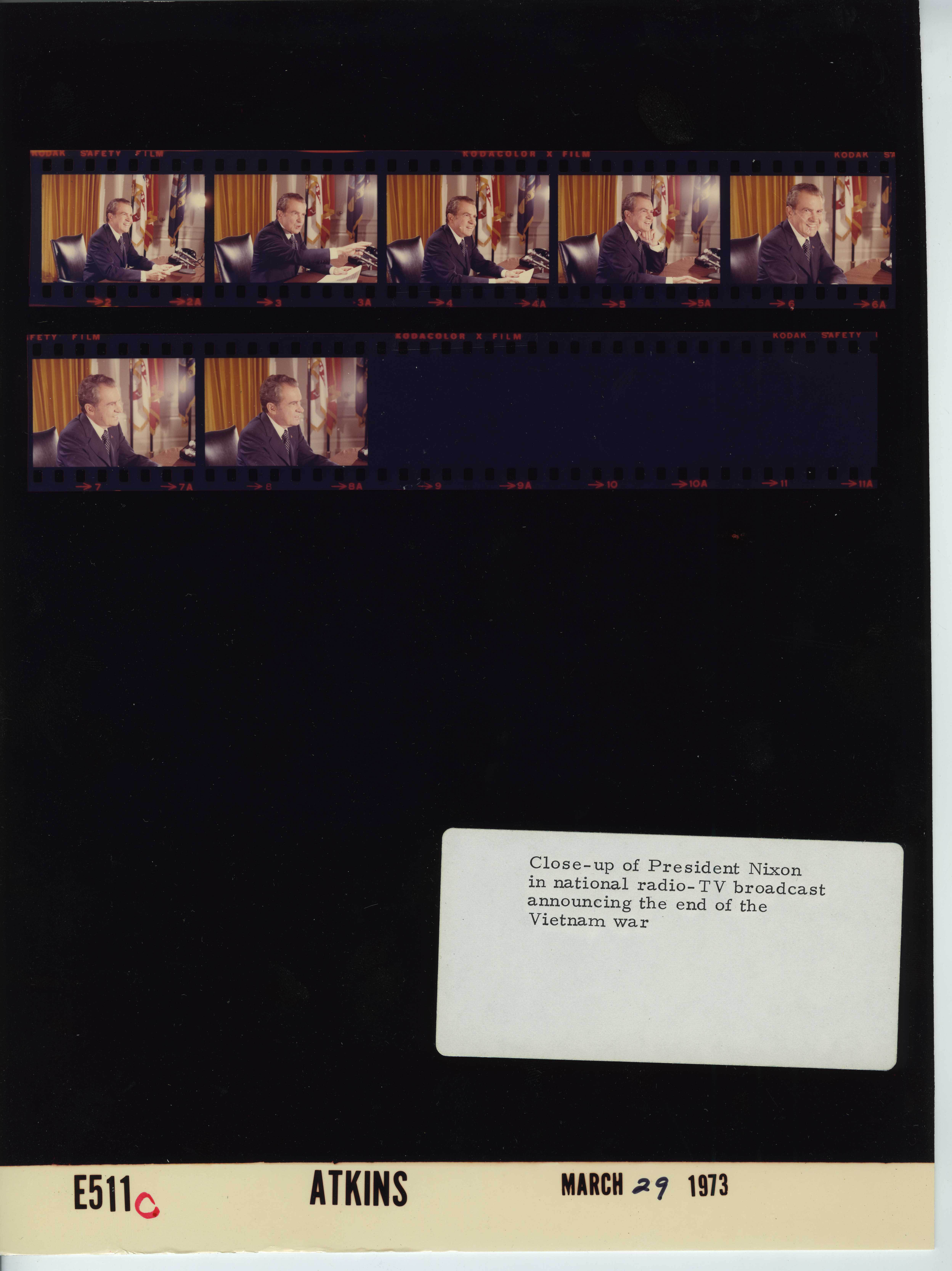 - Frame(s): WHPO-E0511-, President Nixon during national radio-TV broadcast announcing end of Vietnam War and ceiling on meat prices. 3/29/1973, Washington, D.C. White House, Oval Office. President Nixon.