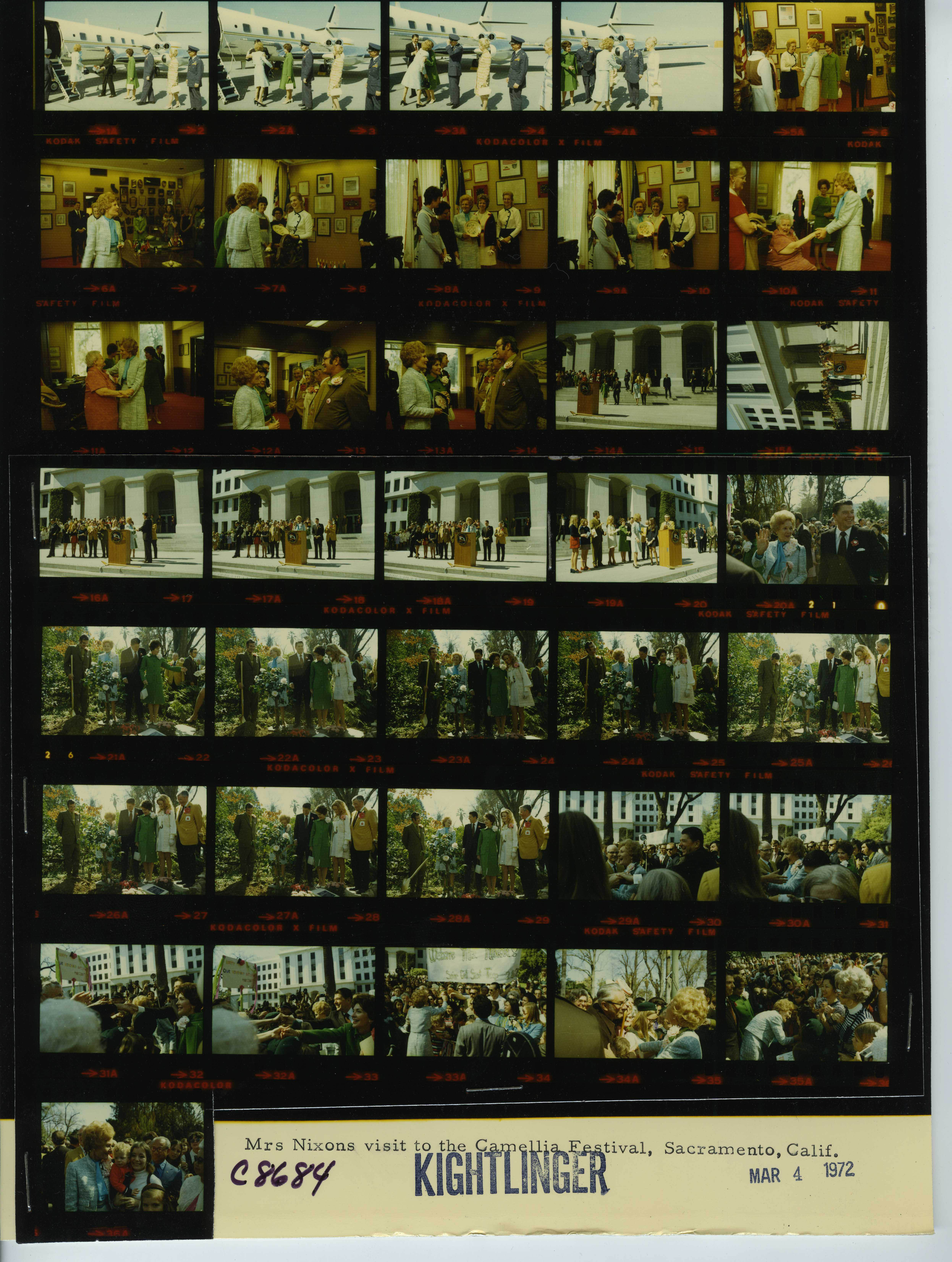 - Frame(s): WHPO-8681-02-31, Pat Nixon at a podium officially opening the Camellia Festival. Pat Nixon visiting some of the Camellia Festival international exhibits. 3/4/1972, Sacramento, California steps, basement, Camellia Festival Auditorium; tarmac, McClellan Air Field. Pat Nixon, Nancy Reagan, officials, exhibitors, unidentified women, officials.