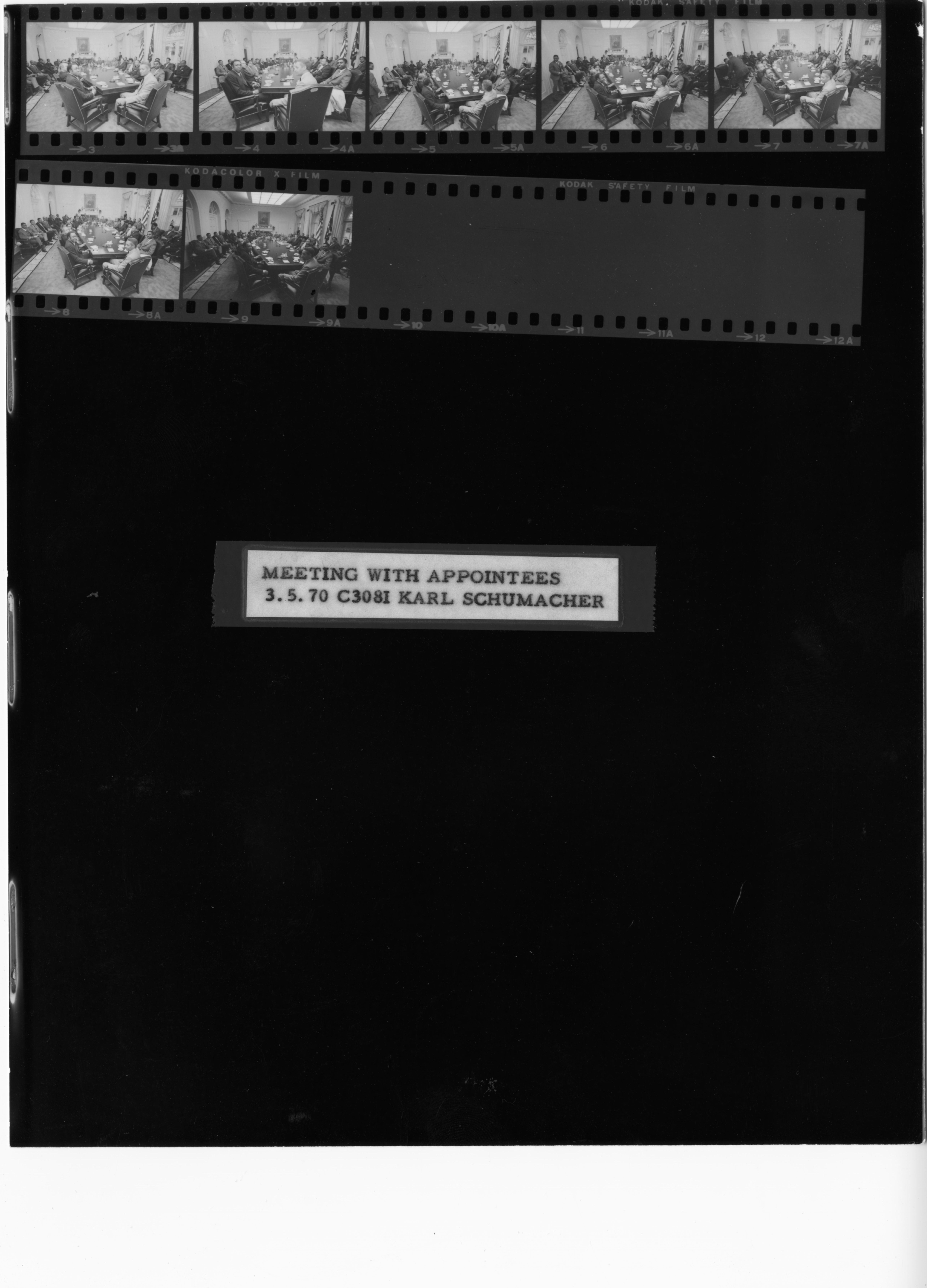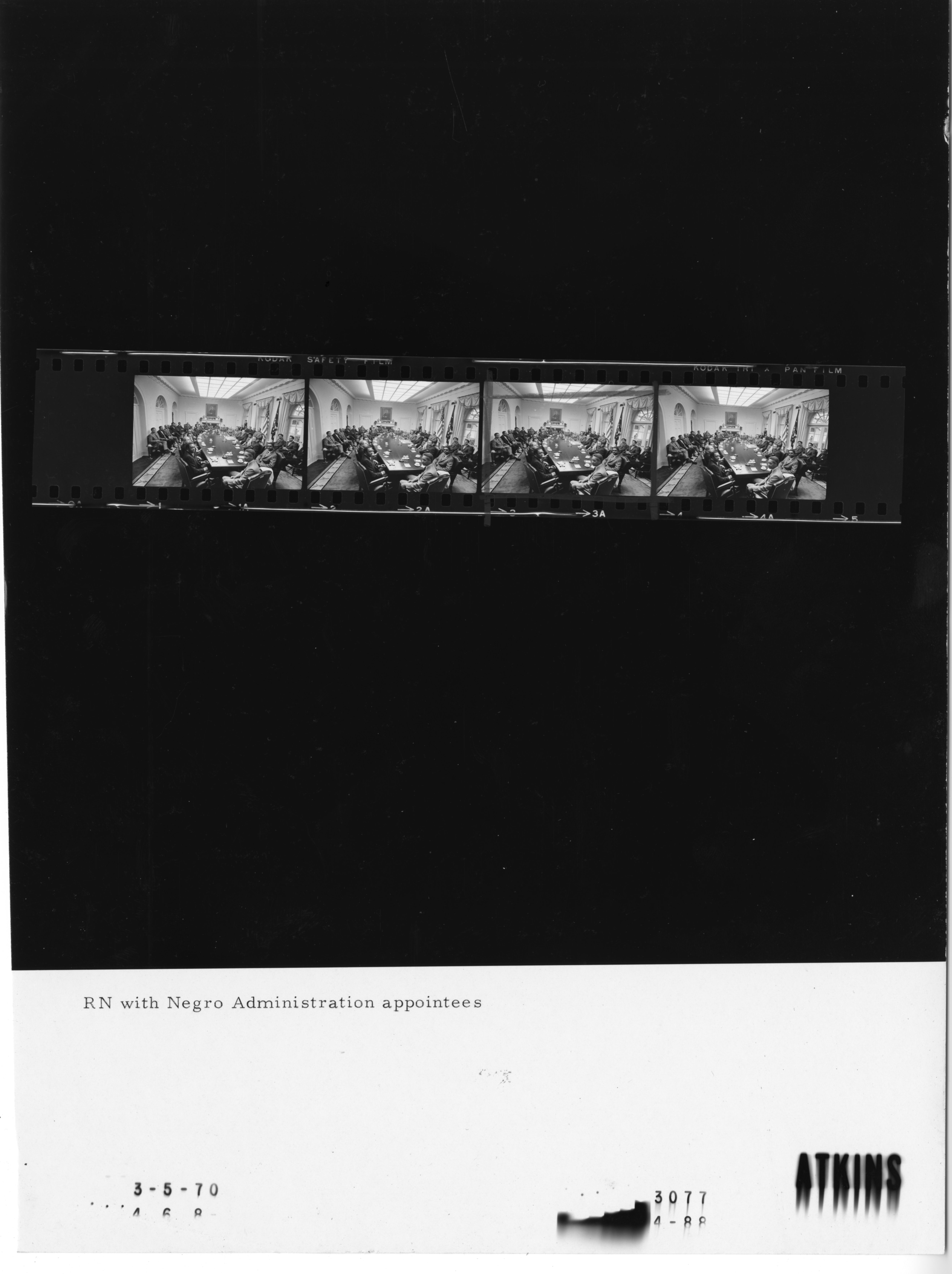 - Frame(s): WHPO-3077-01A-04A, President Nixon meeting with top level administration appointees from the Black community. Photo credit card reads: Top Negro appointees. See also WHPO 3081. 3/5/1970, Washington, D.C. White House, Cabinet Room. President Nixon, Leonard, Samuel Adams Jr., Robert J. Brown, William Brown III, Beverly Carter, Clay Claiborne, Jack Crawford, Joseph Daniels, Frank DeCosta, Alfred L. Edwards, Arthur Fletcher, James Farmer, William Greene, George Haley, Benjamin Holman, Samuel Jackson, Howard Jenkins, Charles C. Johnson Jr., James Johnson, Frank Kent, Elizabeth Koontz, Donald B. Lee, Colston A. Lewis, Dr. Vincent McCrea, Arthur McZier, Edward Mitchell, Chris Roggerson, William Sharp, Joseph J. Simmons III, Samuel Simmons, Morris Sorrell, Stanley B. Thomas, William Thompson, Abraham S. Venable, Thaddeus V. Ware, (mayor) Walter Washington, James Washington, John Wilkes.