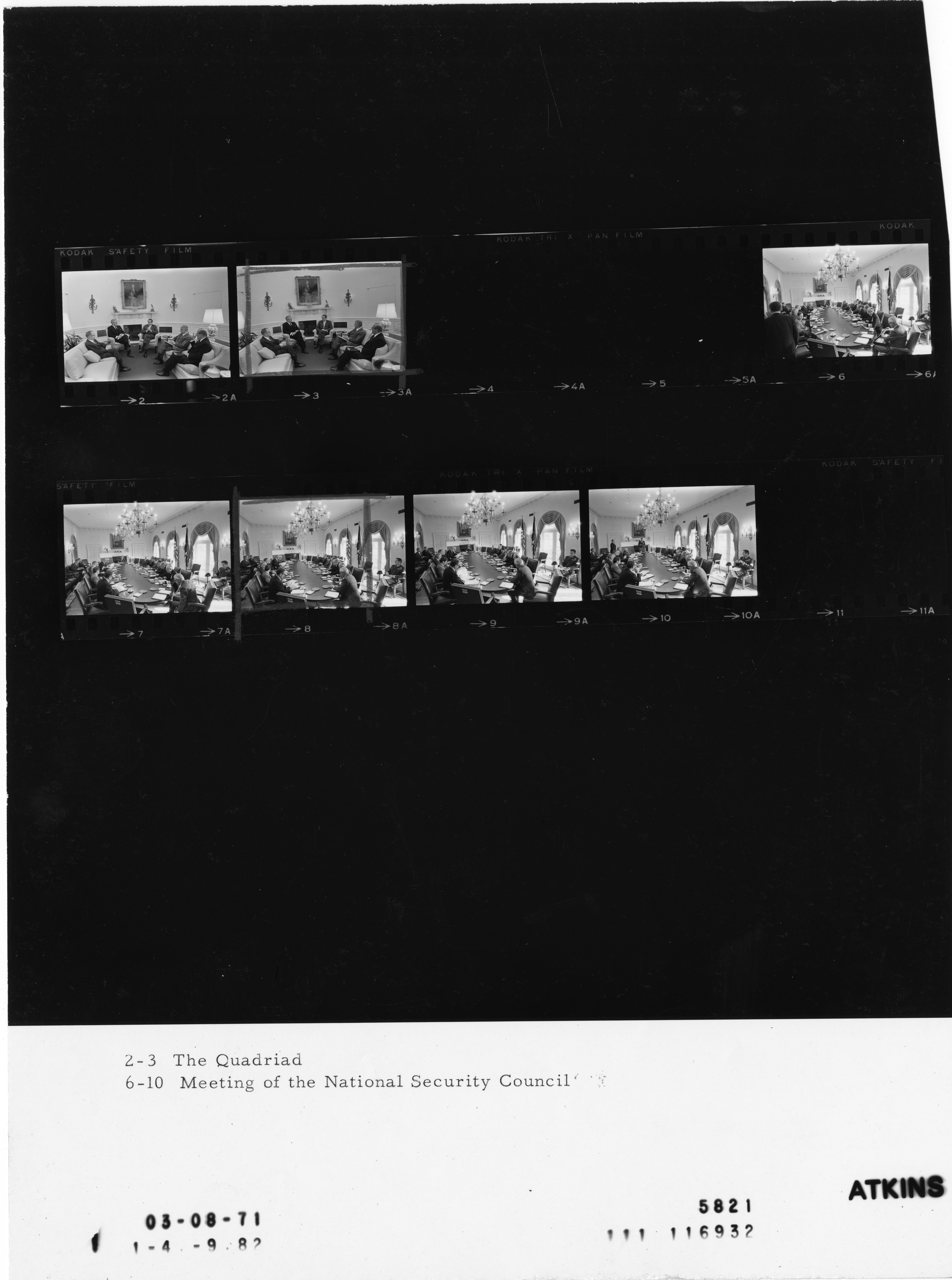 - Frame(s): WHPO-5821-06-10, President Nixon attends the National Security Council (NSC) meeting. 3/8/1971, Washington, D.C. White House, Cabinet Room. President Nixon, Spiro Agnew, Melvin Laird, Henry Kissinger, John Mitchell, unidentified officials.