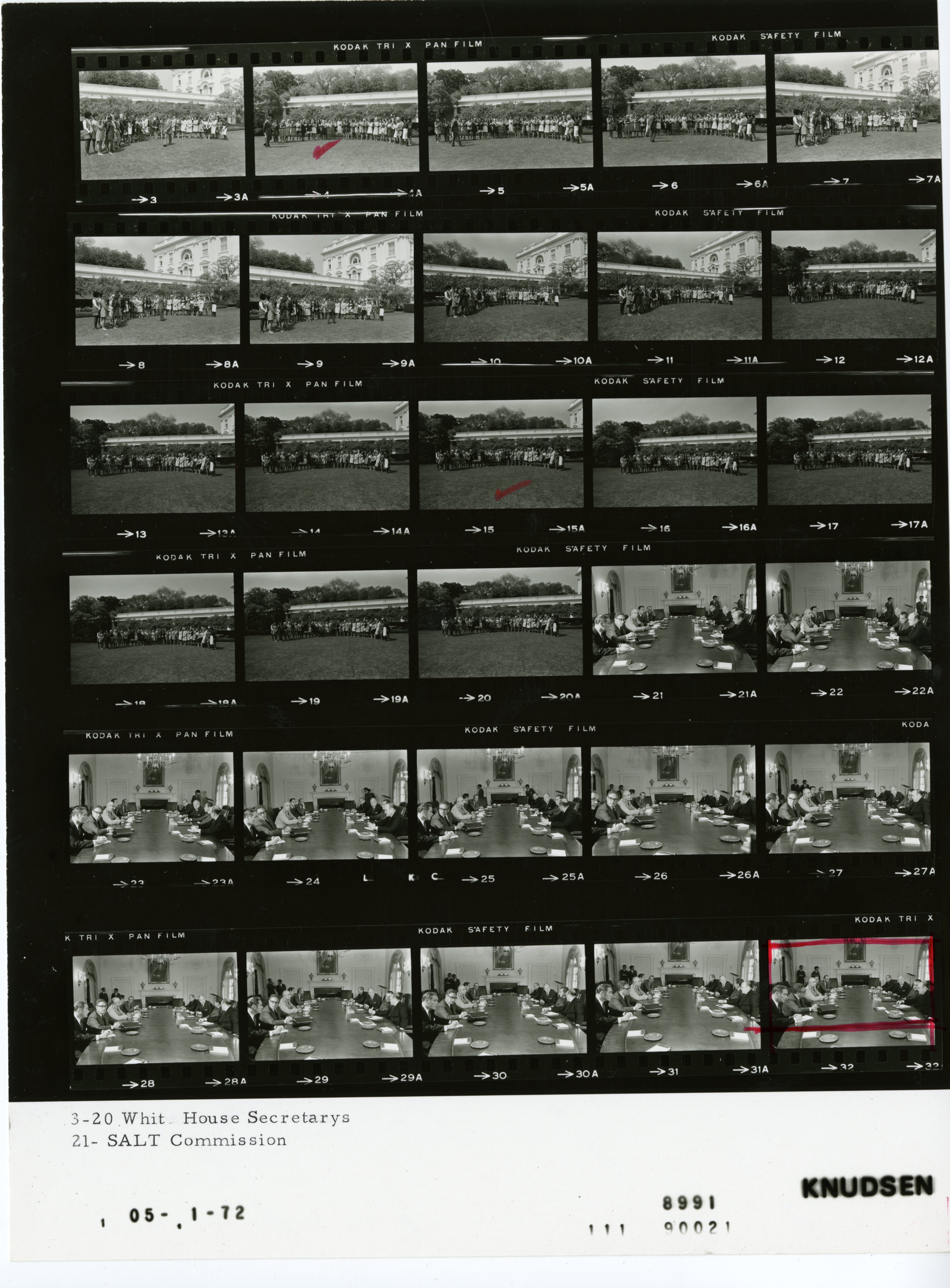 - Frame(s): WHPO-8991-21-32, President Nixon at a meeting concerning the SALT talks. 5/1/1972, Washington, D.C. White House, Cabinet Room. President Nixon, Gerard C. Smith, William Rogers, Melvin Laird, Admiral Thomas H. Moorer, Richard Helms, Lt. General Royal B. Allison, Henry Kissinger, Ronald Ziegler.