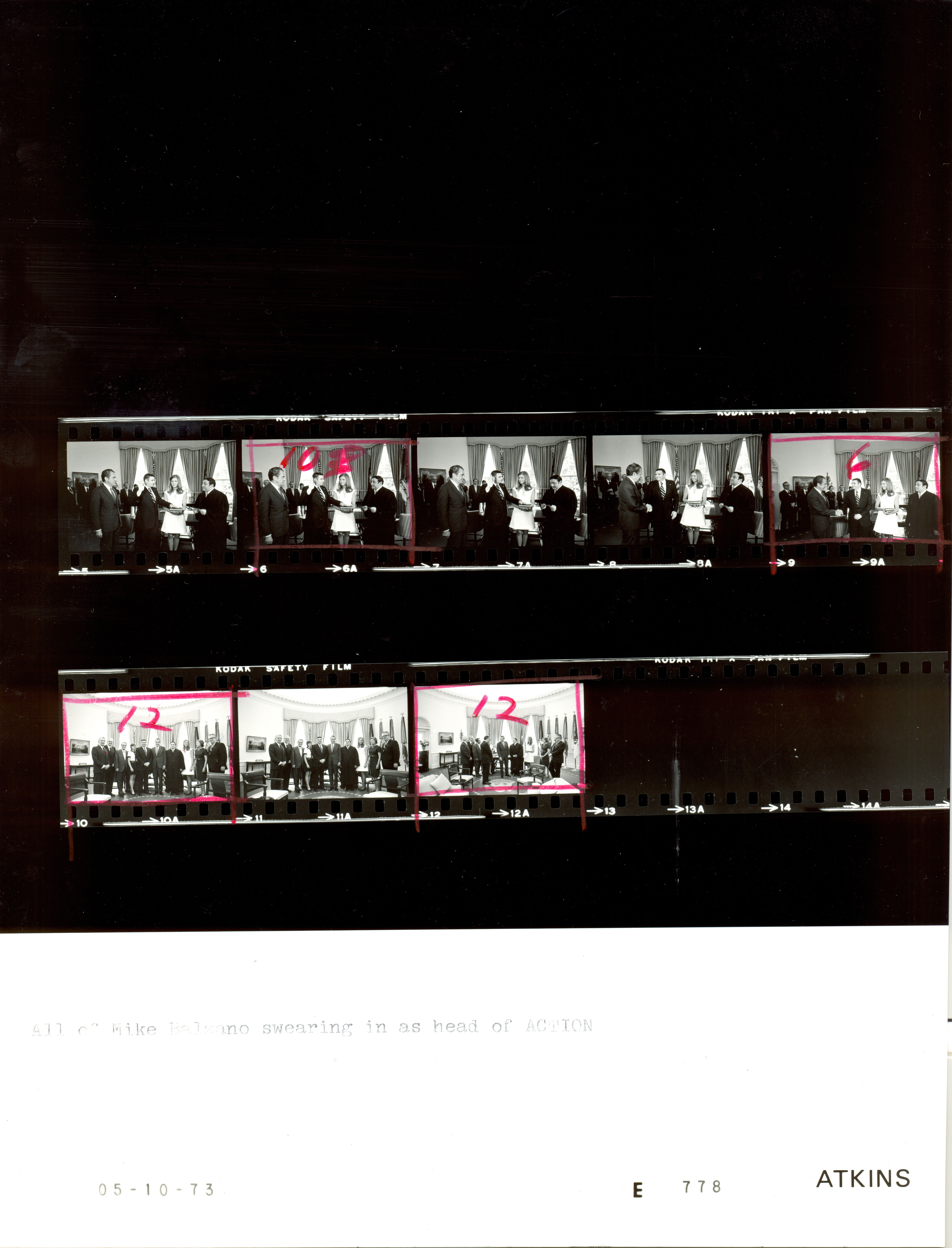 - Frame(s): WHPO-E0778-, President Nixon attends Mike Balzano's swearing in ceremony as head of ACTION, officiated by Superior Court Judge Nicholas S. Nunzio. 5/10/1973, Washington, D.C. Oval office, White House. President Nixon, Michael P, Balzano Jr., Mrs. Balzano, Superior Court Judge Nicholas S. Nunzio.