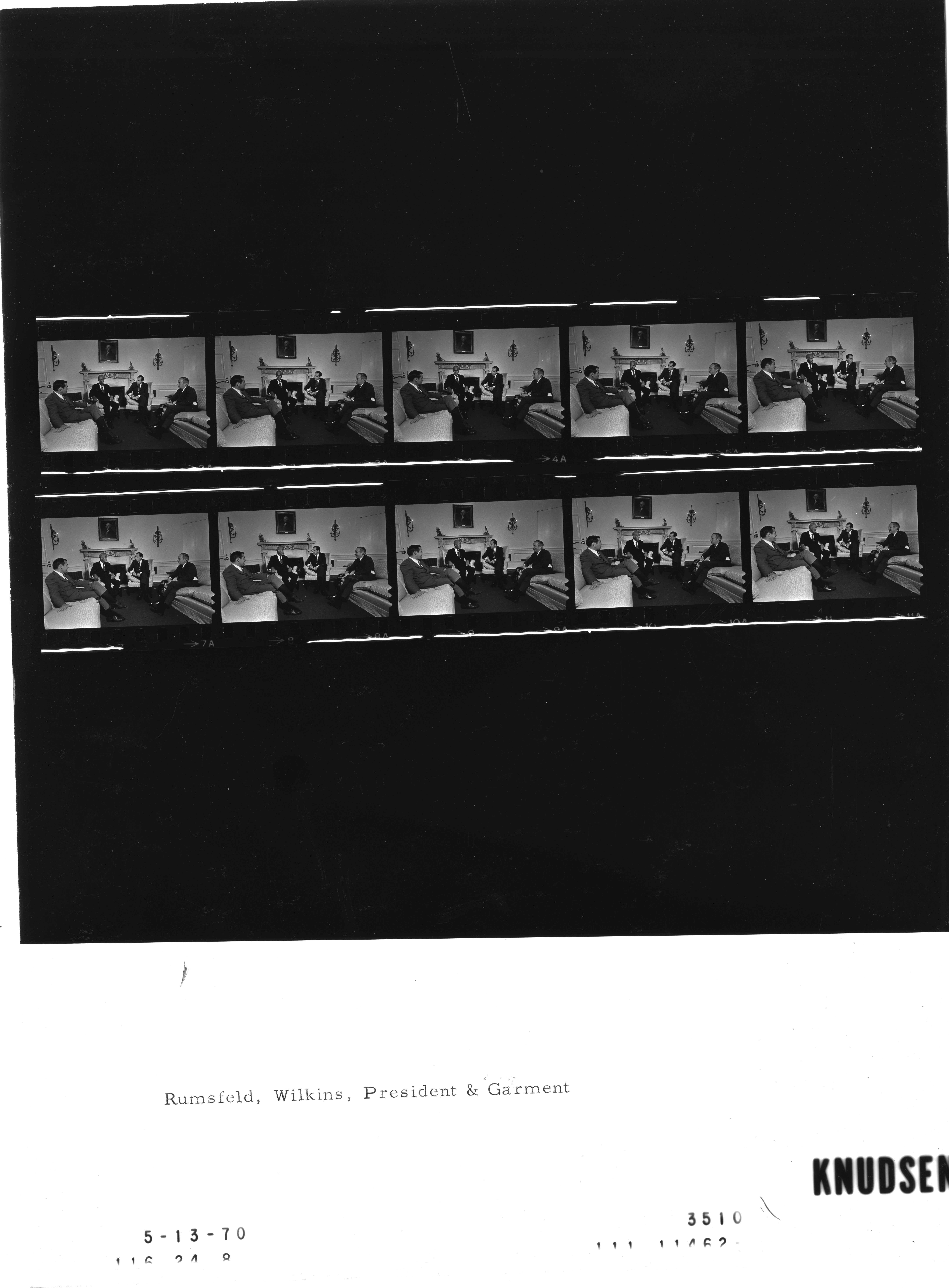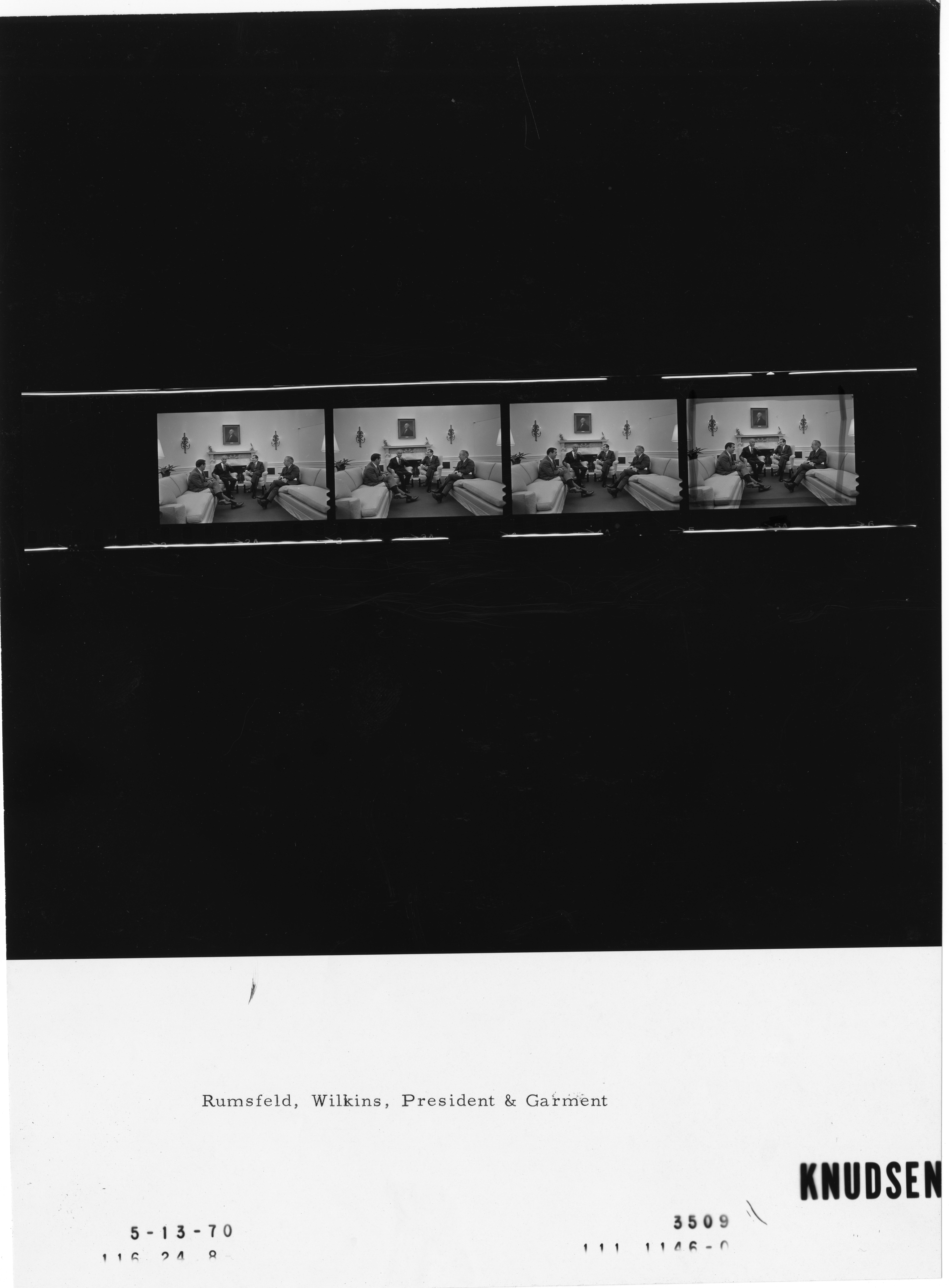 - Frame(s): WHPO-3509-05A, President Nixon seated informally during a meeting with Donald Rumsfeld, Director, OEO, Leonard Garment, Special Consultant and Roy Wilkins, Executive Director, NAACP. 5/13/1970, Washington, D.C. White House Oval Office. President Nixon, Mr. Rumsfeld, Mr. Garment, Mr. Wilkins.