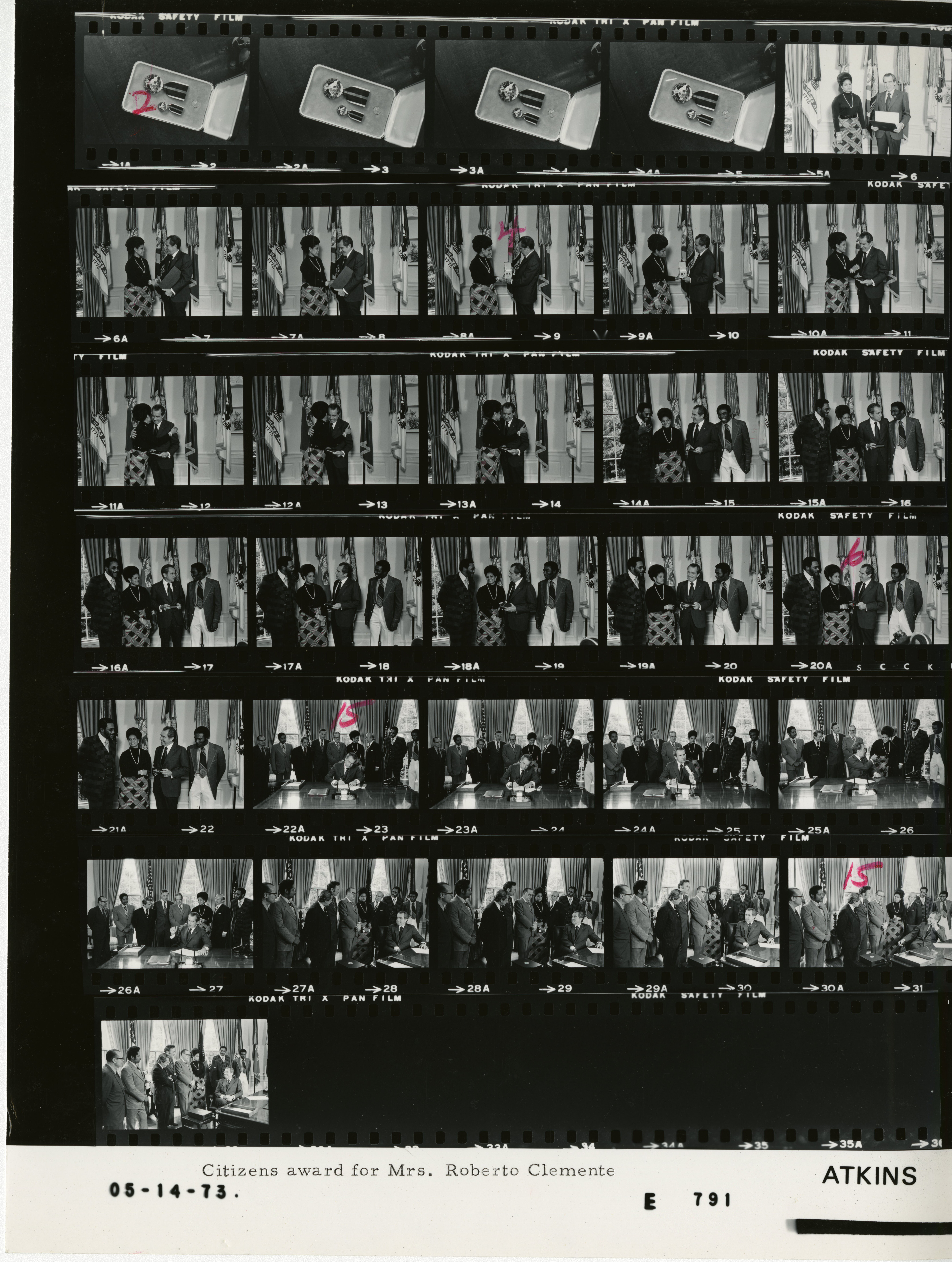 - Frame(s): WHPO-E0791-, President Nixon at his Oval Office desk, while Mrs. Roberto Clemente accepts the Presidential Citizen's Medal given posthumously to professional baseball player Roberto Clemente, and to sign H.R. 3841 bill providing for the striking of medals in commemoration of Mr. Clemente. 5/14/1973, Washington, D.C. White House, Oval Office. President Nixon, Mrs. Roberto Clemente, Senate Minority Leader Hugh Scott and his Special Assistant Kenneth Davis, Rep. William Moorhead, Senator Richard Schweiker, Commissioner Jaime Benitez the House Delegate from Puerto Rico, baseball players William Stargell and Manny Sanguillen, Orlando Zabala the brother of Mrs. Clemente, Kenneth Davis Special Assistant, Paul Nieves.