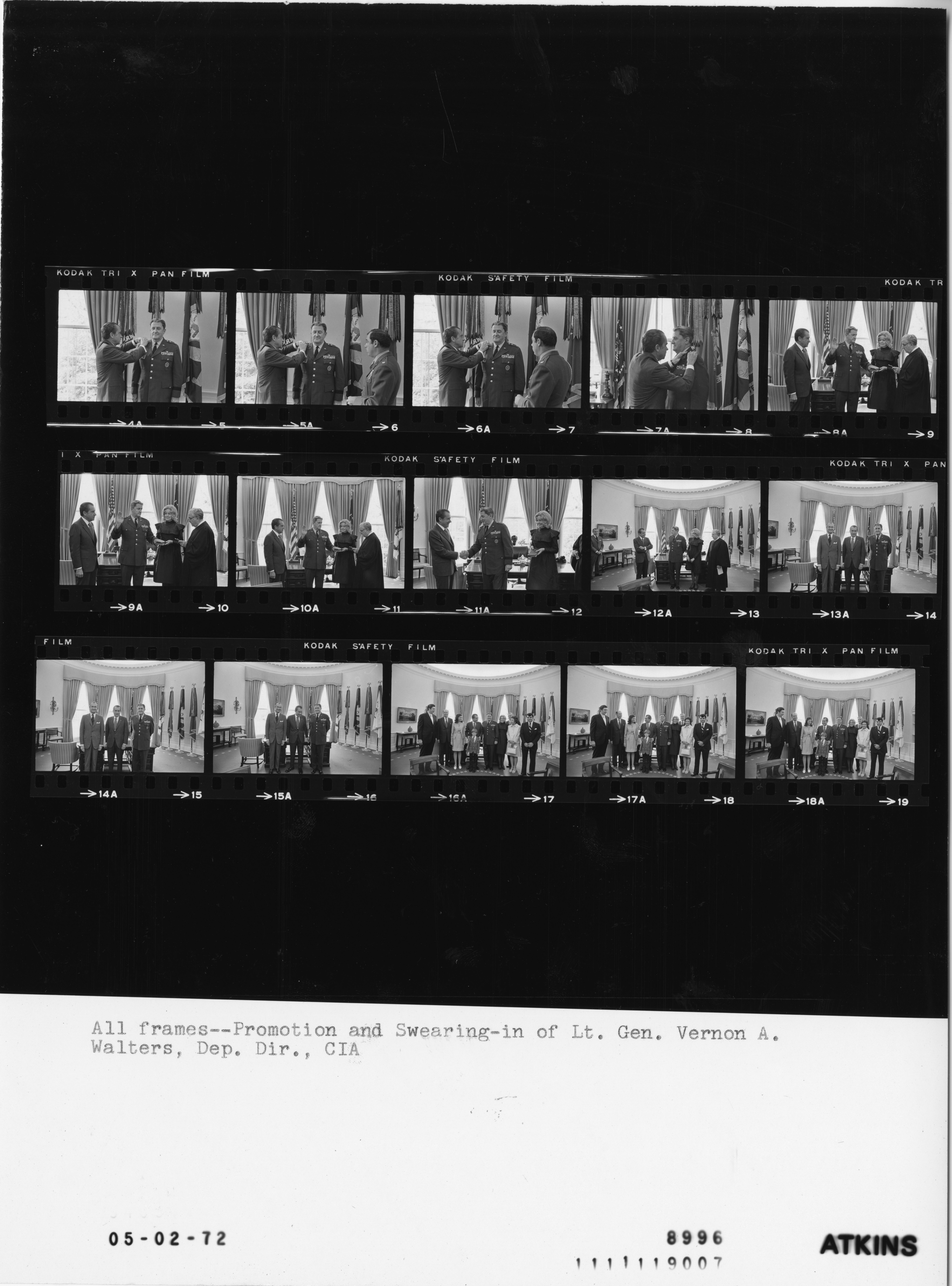 - Frame(s): WHPO-8996-, President Nixon promoting Maj. Gen. Vernon Walters to Lieutenant General, and witnessing Walters's swearing-in ceremony as Central Intelligence Agency (CIA) Deputy Director. 5/2/1972, Washington, D.C. White House, Oval Office. President Nixon, Vernon Walters, Walters family members, Haig, Judge Edward Tamm.