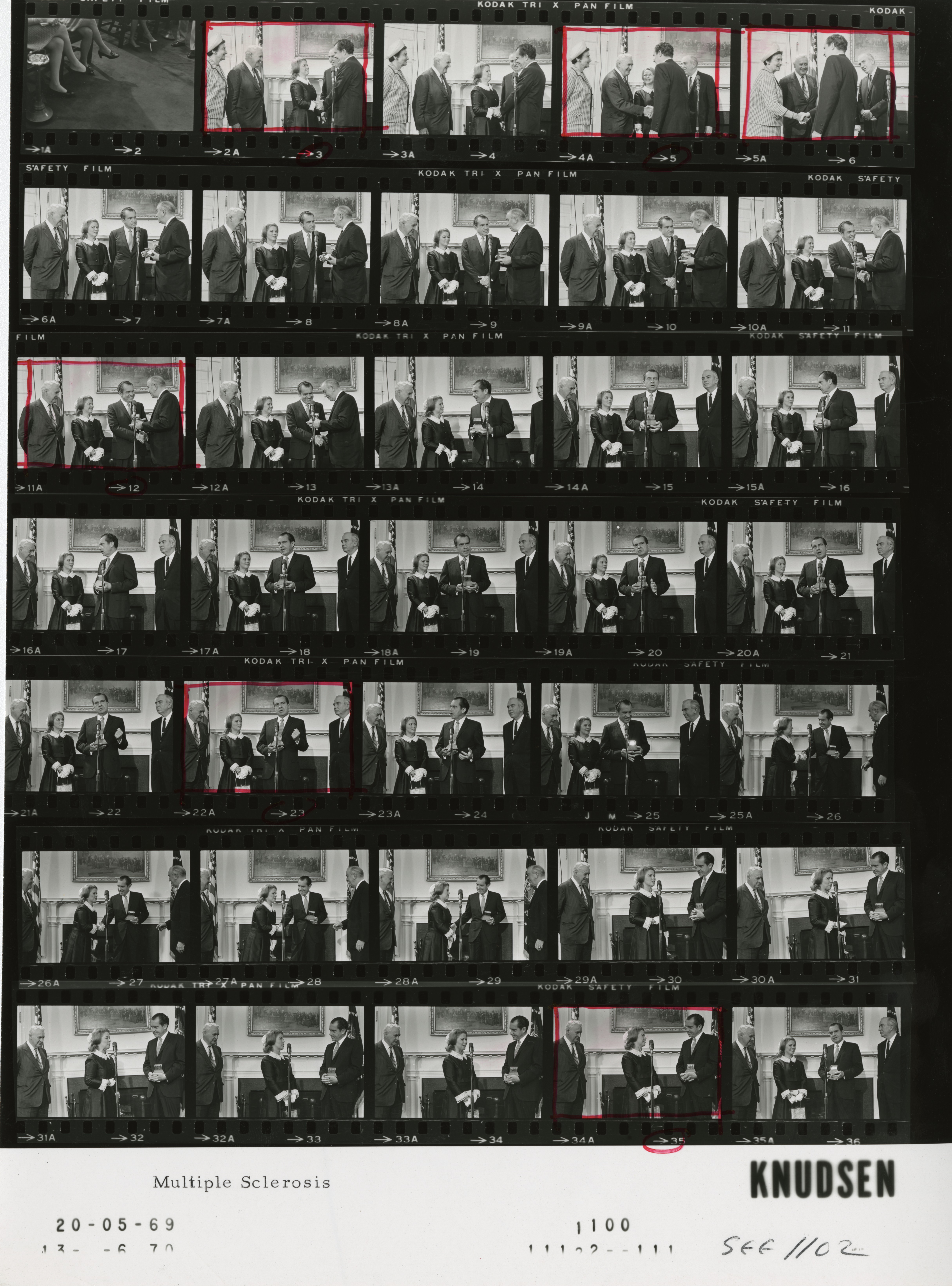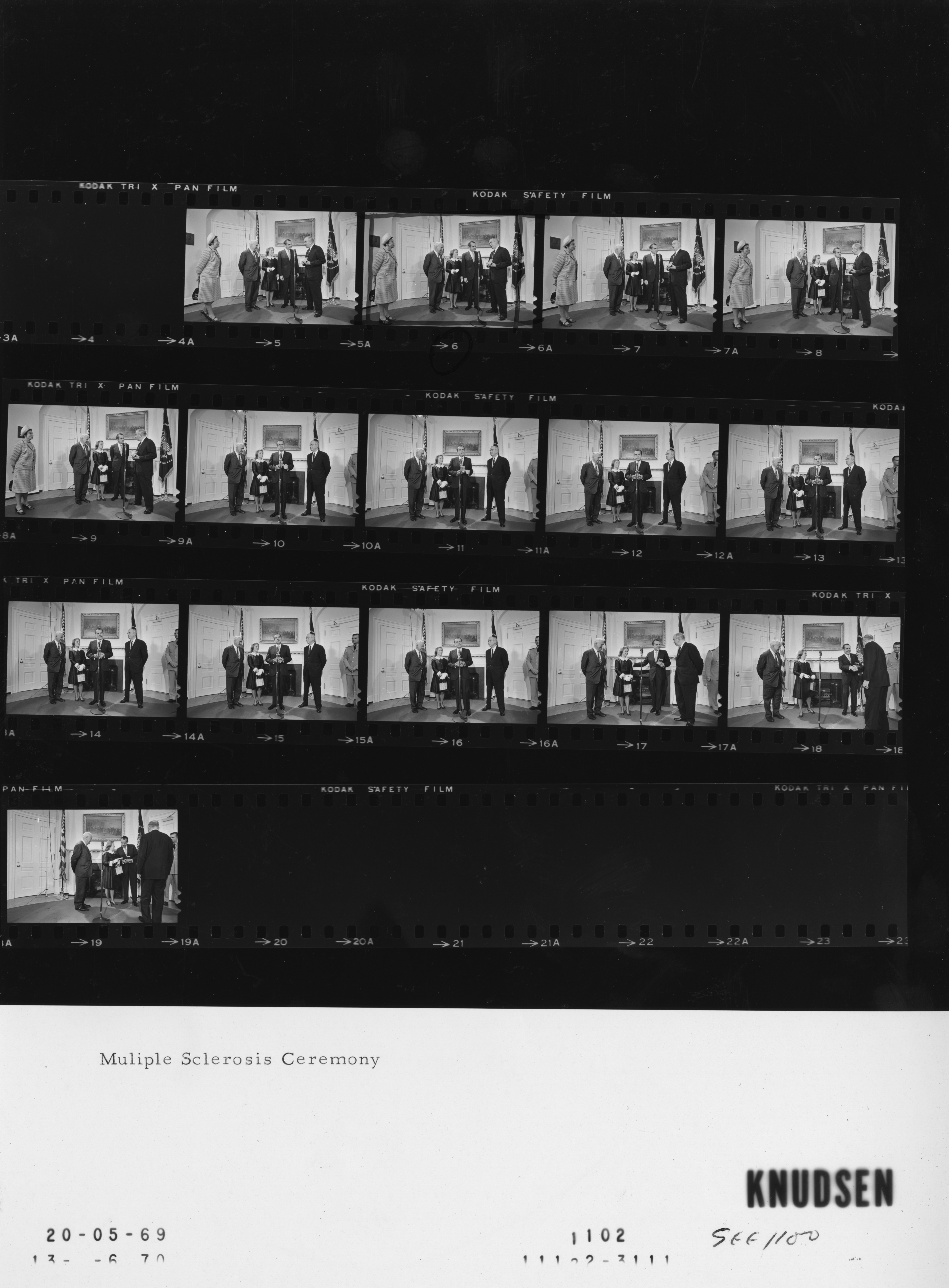 • Frame(s): WHPO-1100-02A-35A, President Nixon receiving a bronze "Hope Chest" from Mr. D. J. Haughton, President of the National Multiple Sclerosis Society, Shirley Temple Black, Silvia Lawry, and other Society representatives. 5/20/1969, Washington, D.C. White House, Roosevelt Room. President Nixon, Shirley Temple Black, D. J. Haughton, Silvia Lawry, unidentified guests.