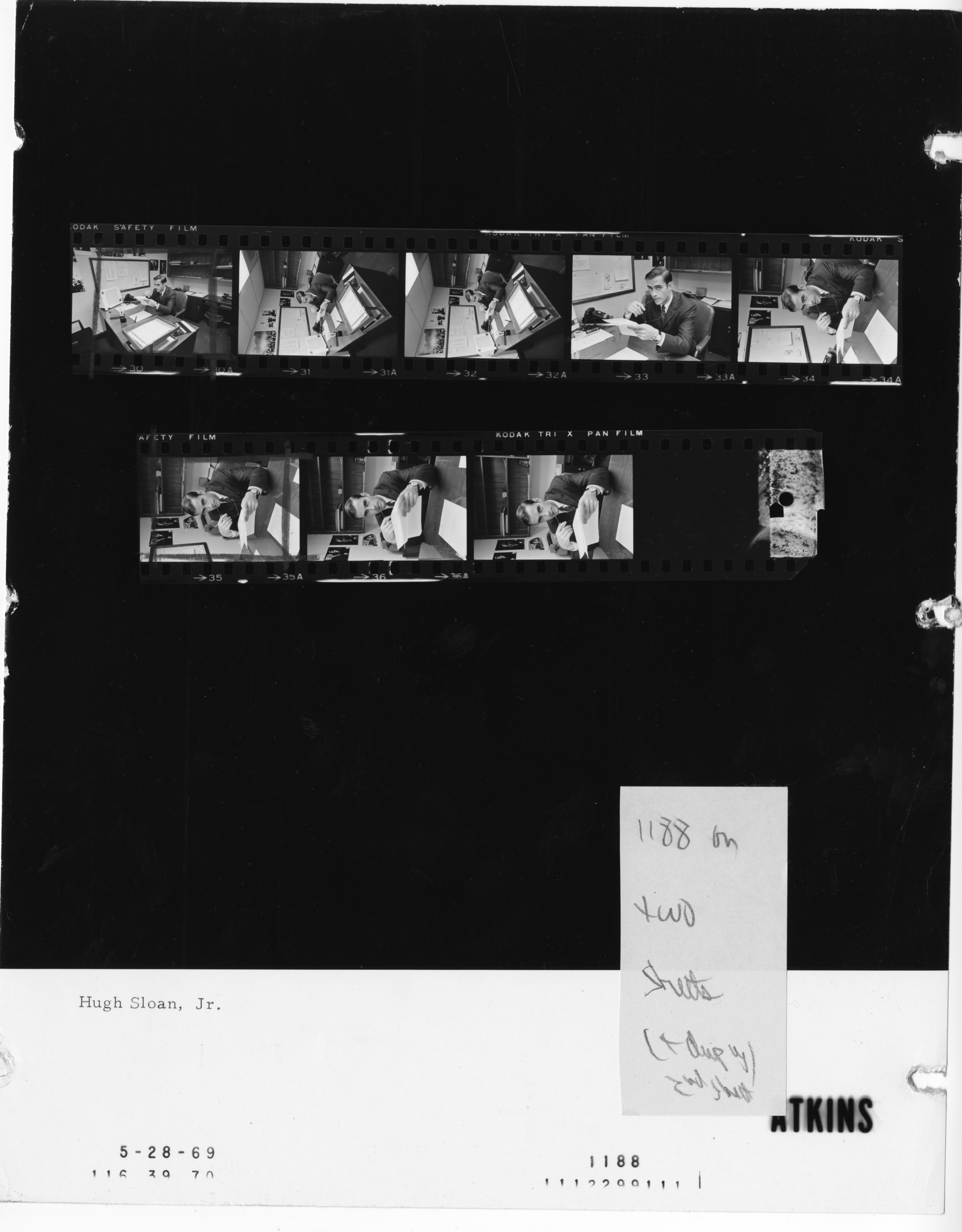- Frame(s): WHPO-1188-06-10, 22-37, Hugh Sloan Jr. working. 5/28/1969, Washington, D.C. White House. Hugh Sloan.