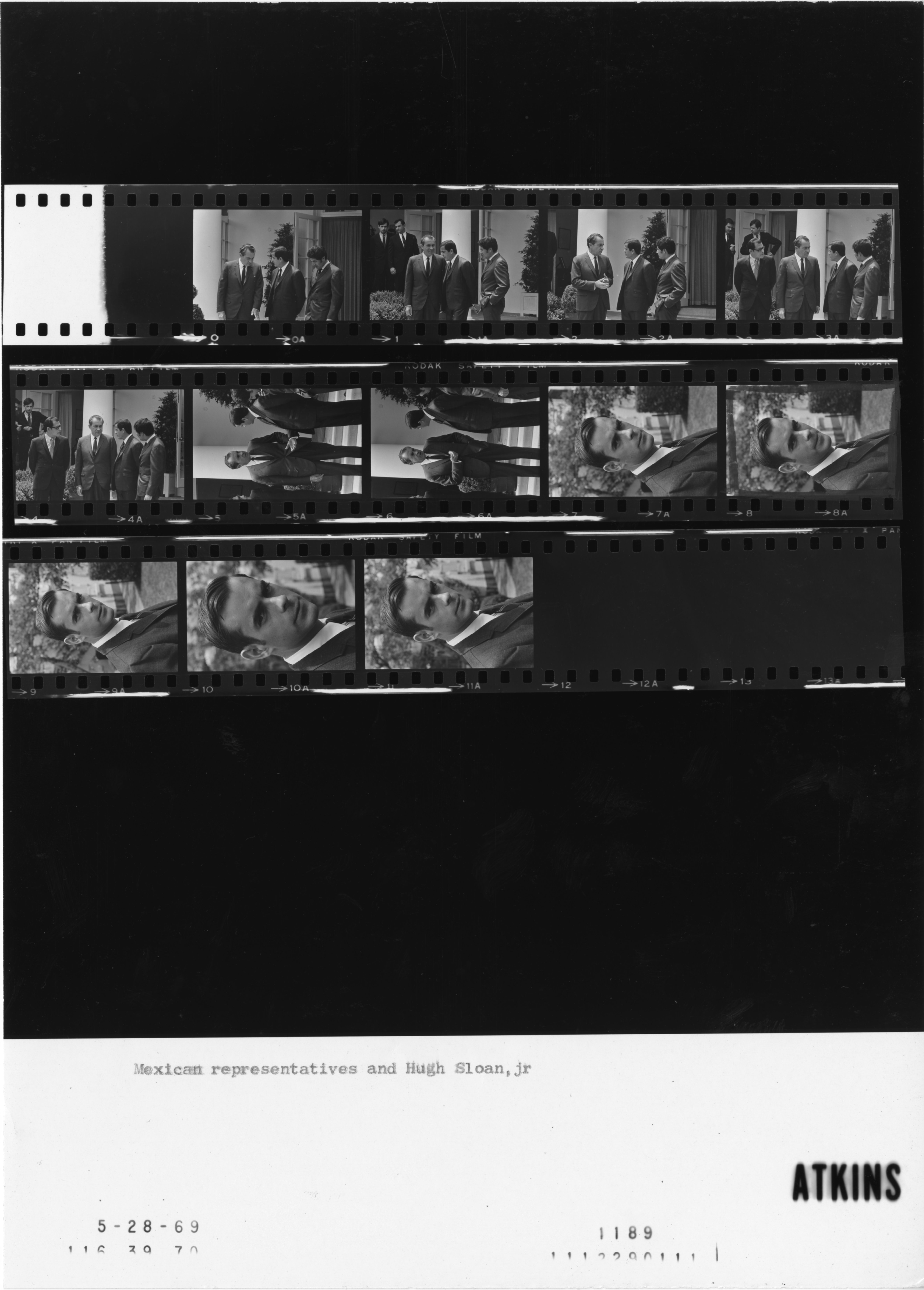 - Frame(s): WHPO-1189-00A-06A, President Nixon with Martin Castillo, Chairman of the Interagency Community for Mexican-American Affairs, Hank Queveda, its Executive Director, and Uraldo Palmares. 5/28/1969, Washington, DC White House, Rose Garden. President Nixon, Martin Castillo, Hank Queveda, Uraldo Palmares, unidentified aides.