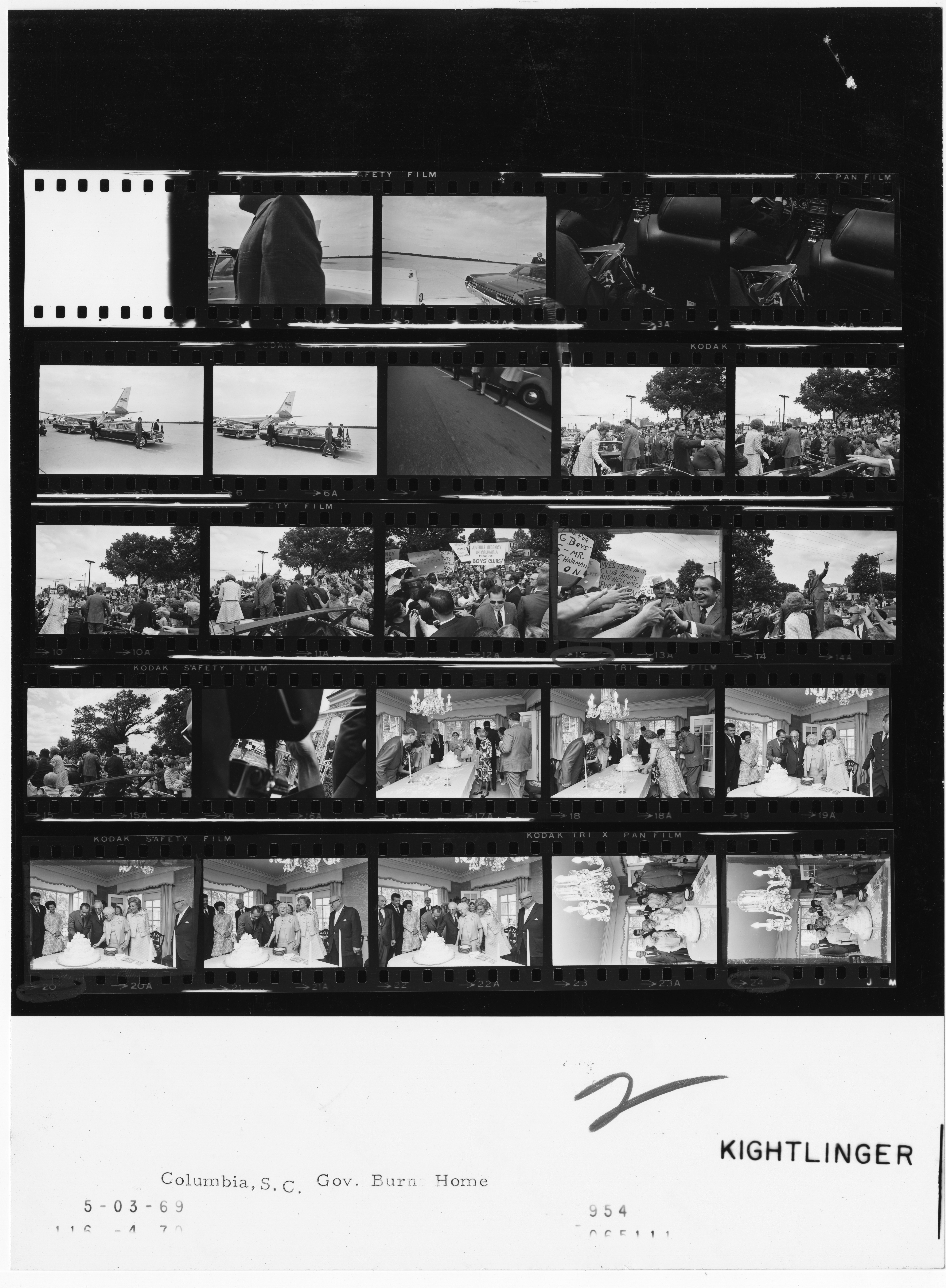 • Frame(s): WHPO-0953-03-10, President Nixon and Pat Nixon arriving at the Columbia, South Carolina airport. 5/3/1969, Columbia, South Carolina Airport, local street, Byrnes home. President Nixon, Pat Nixon, James Byrnes, Mrs. Byrnes, unidentified officials, crowd.