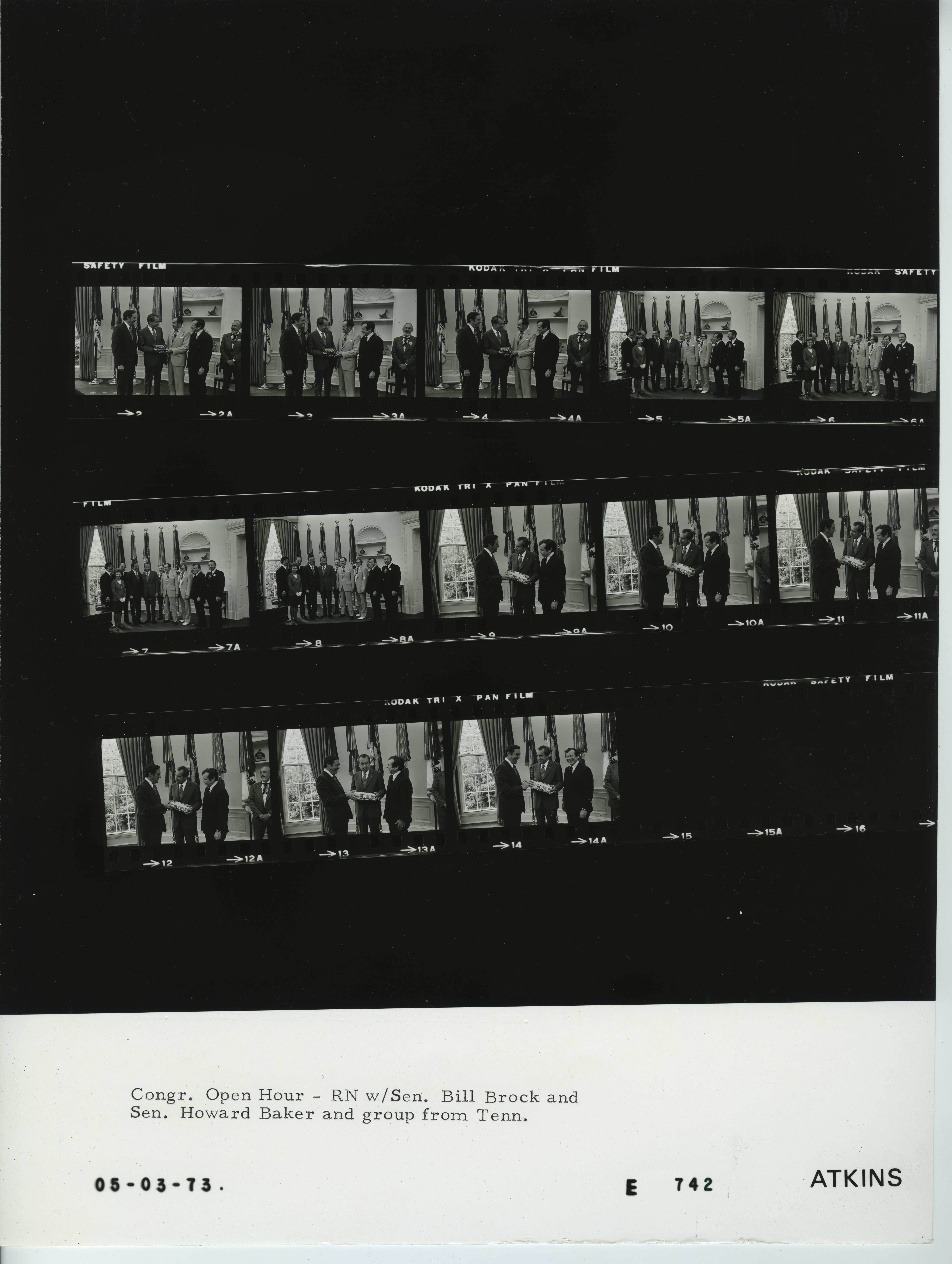 - Frame(s): WHPO-E0742-14, Congressmen Open Hour. President Nixon standing in the Oval office with Tennessee Senators Bill Brock and Howard Baker. 5/3/1973, Washington, D.C. White House, Oval Office. President Nixon, Senator William E. Brock III (R-Tennessee), Senator Howard H. Baker, Jr. (R-Tennessee).
