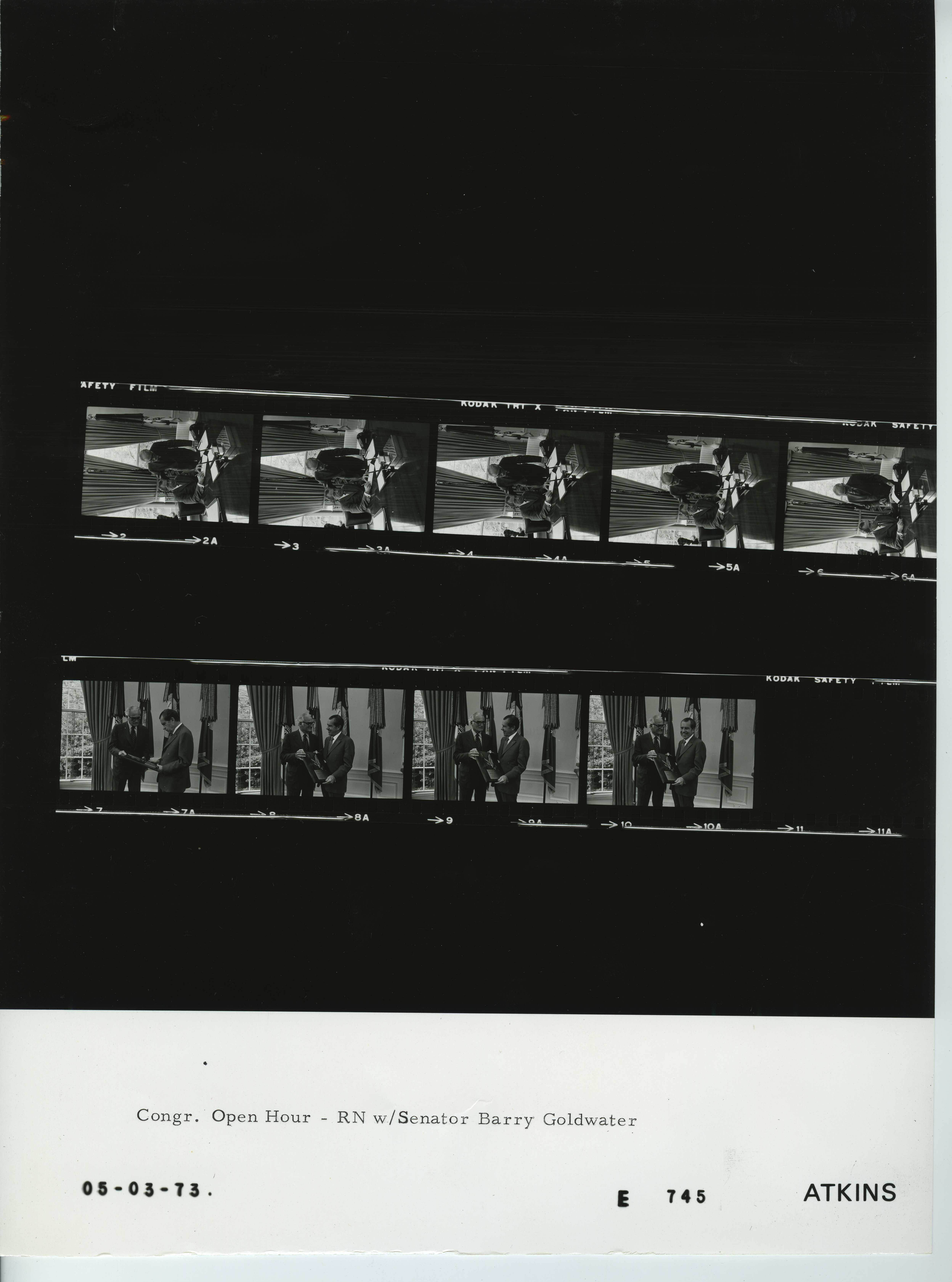 - Frame(s): WHPO-E0745-08A, President Nixon standing with Senator Barry Goldwater in the Oval Office while both hold a large gift plaque, featuring an embossed eagle. (possibly the Capt. Eddie Rickenbacker Americanism Award in appreciation of the President's efforts to achieve peace.). 5/3/1973, Washington D.C. White House, Oval Office. President Nixon, Senator Barry Goldwater.