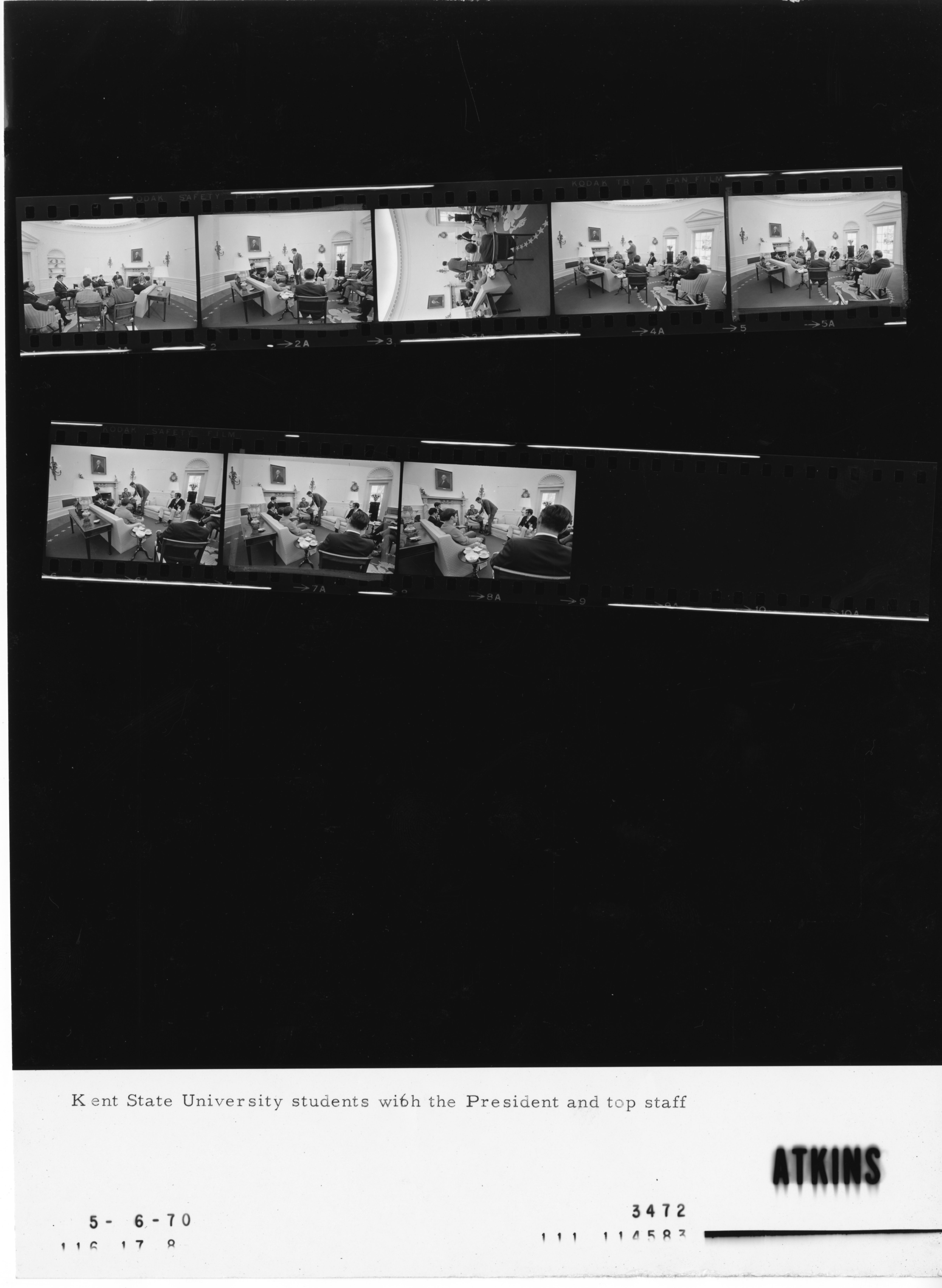 - Frame(s): WHPO-3472-01A-08A, President Nixon meeting with Kent State University students Thomas Rall, (President of Kent State University Alumnae Association in Washington, D.C.), Tom Brumbach, Richard Cutler, Don Grant, Dean Powell, Don Tretinik, Sam Trezo, Ron Ziegler, Ohio Congressman William Stanton. 5/6/1970, Washington, D.C. White House, Oval Office. President Nixon, H.R. Haldeman, John Ehrlichman, William Stanton, Ronald L. Ziegler, Thomas Rall, Tom Brumbach, Richard Cutler, Don Grant, Dean Powell, Don Tretinik, Sam Trezo.