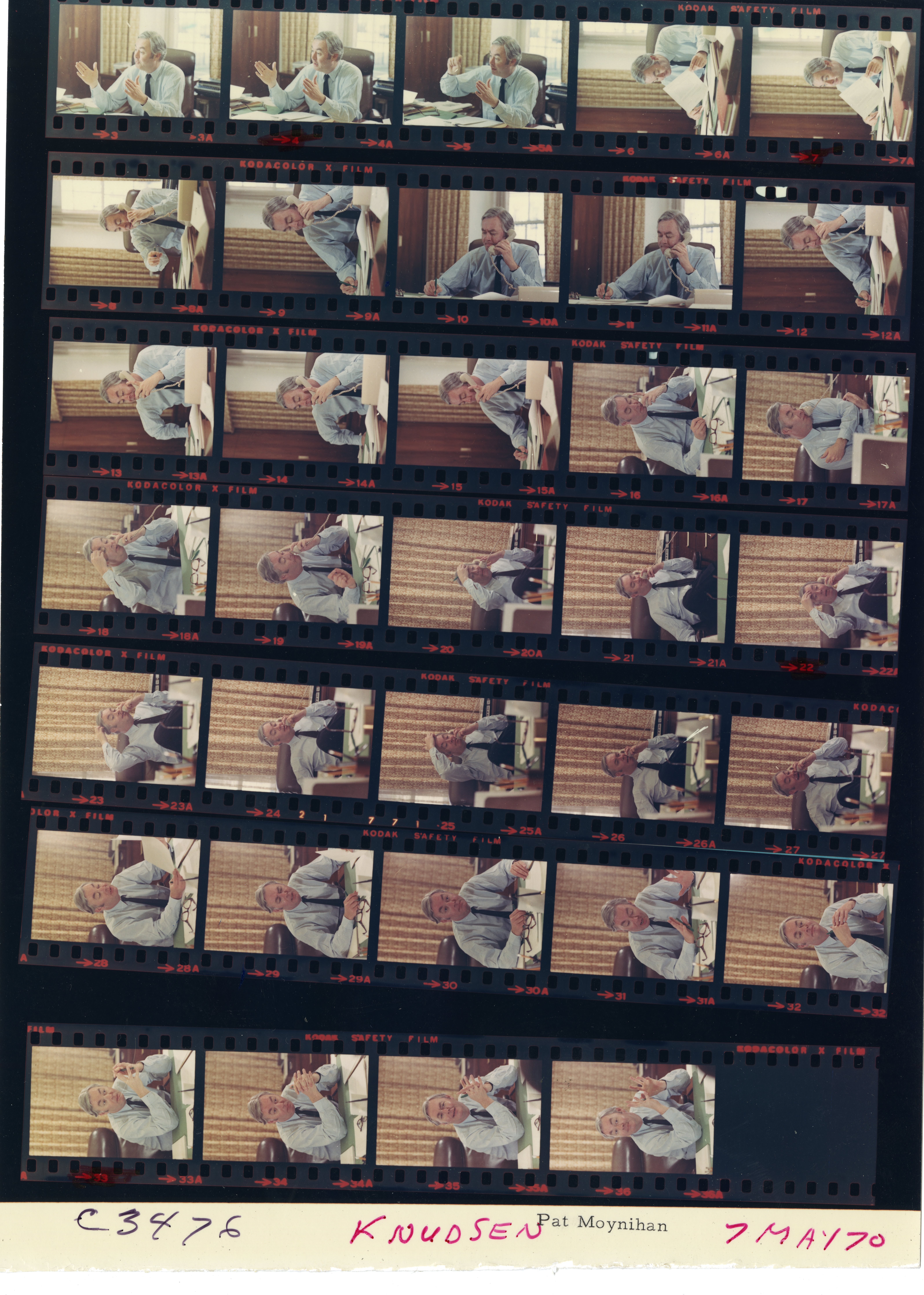 - Frame(s): WHPO-3476-03-36, Presidential Assistant Daniel Patrick Moynihan sitting at his desk. 5/7/1970, unknown White House, office of Mr. Moynihan. Daniel Patrick Moynihan.