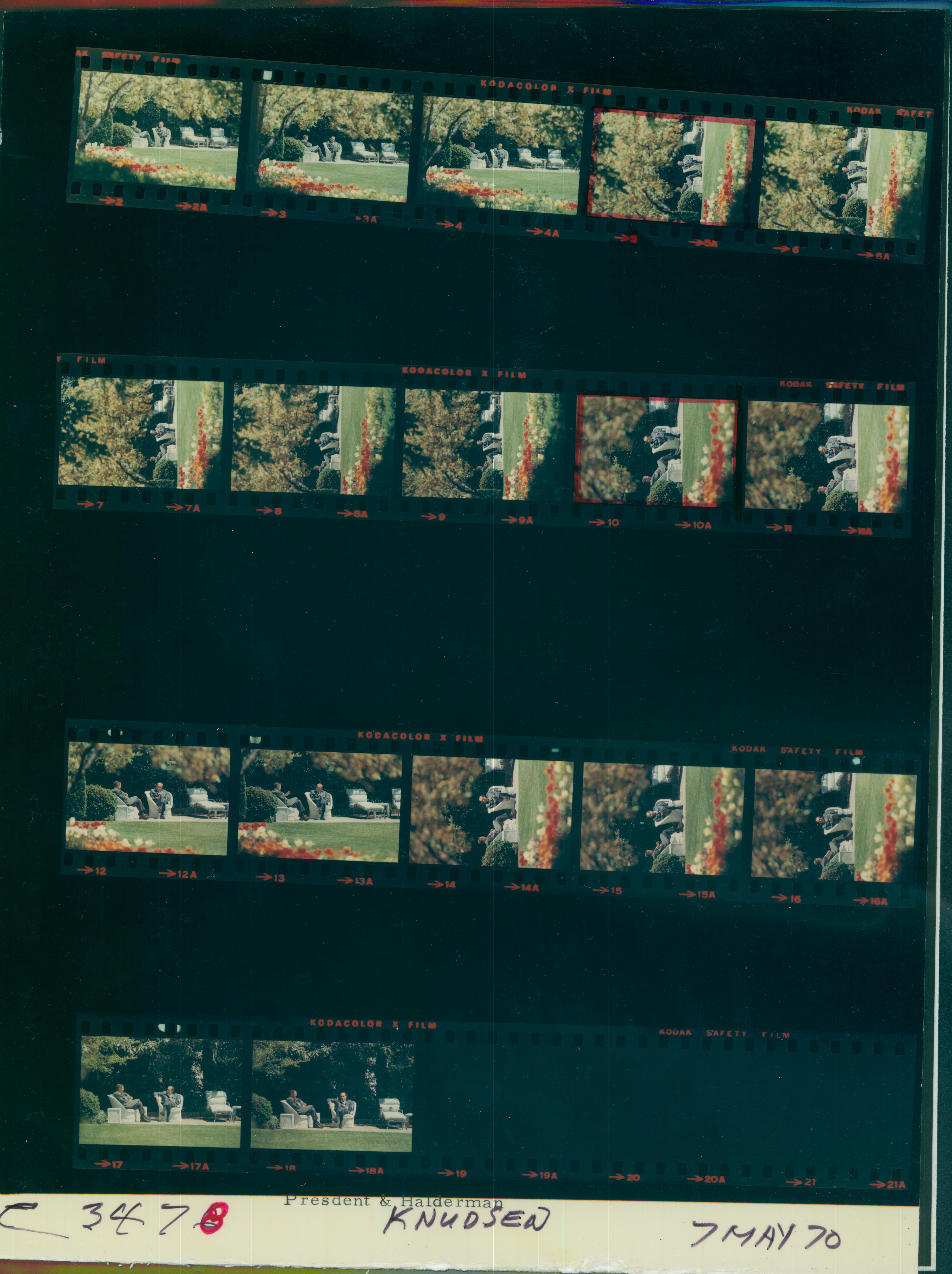 - Frame(s): WHPO-3478-10, President Nixon and H. R. Haldeman seated outside on garden lawn whicker chairs, during a meeting. Flowers in bloom in foreground. 5/7/1970, Washington, D.C. White House, Rose Garden Patio. President Nixon, H.R. Haldeman.