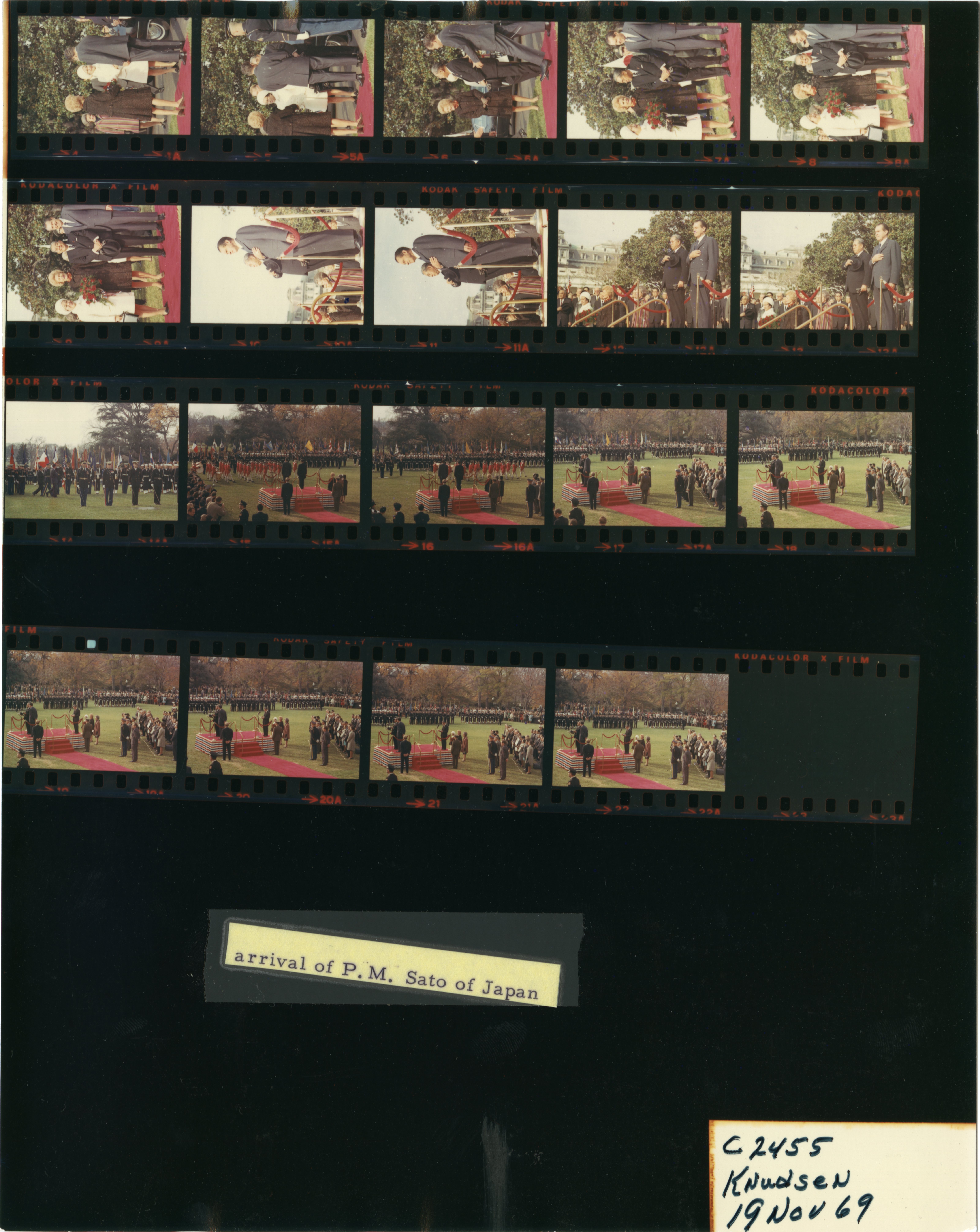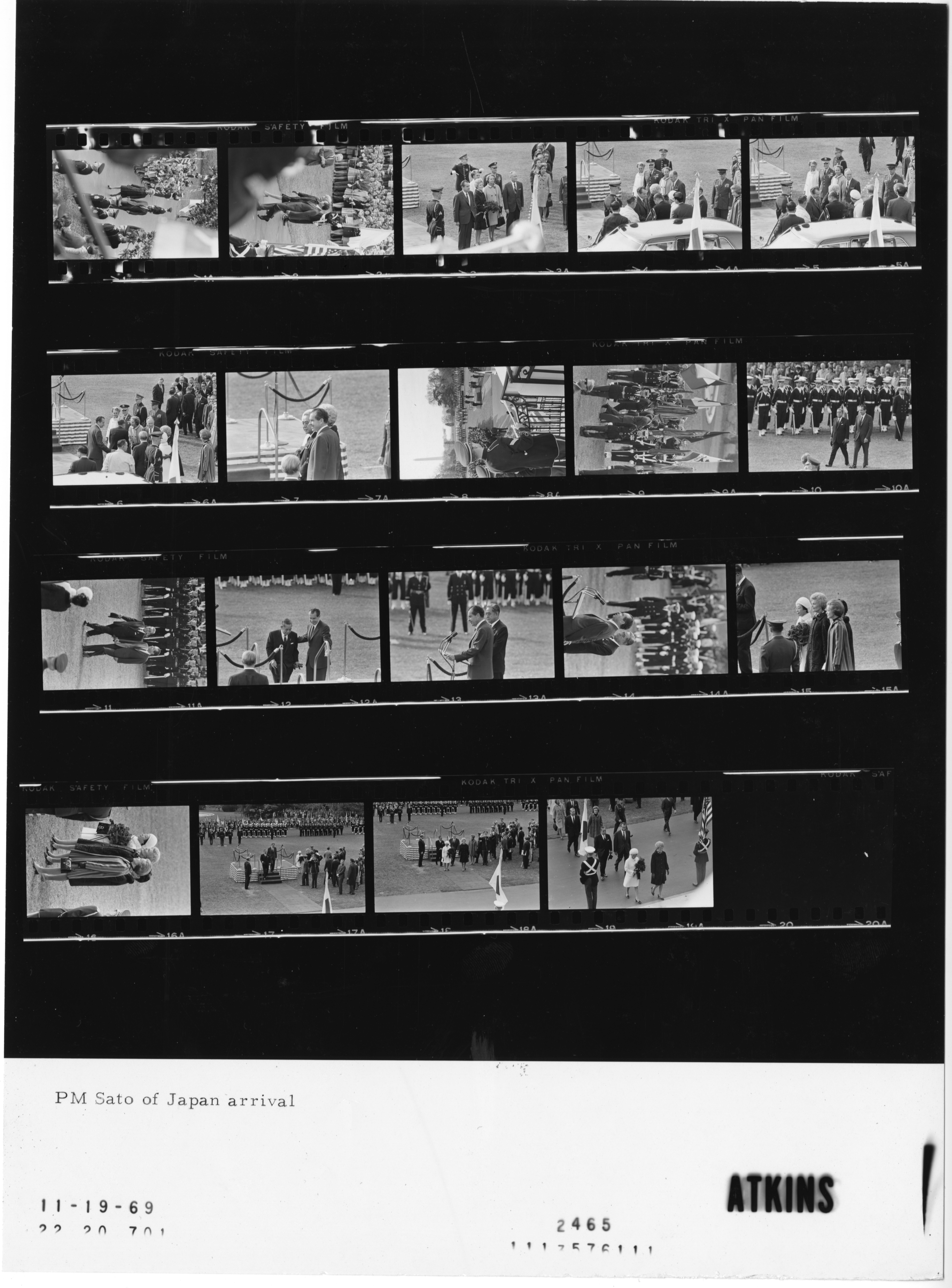 - Frame(s): WHPO-2455-, President Nixon at the arrival ceremony for Japanese Prime Minister Eisaku Satō. 11/19/1969, Washington, D.C. White House, South Lawn. President Nixon, Pat Nixon, Eisaku Satō, Mrs. Satō, officials, military personnel, guests.