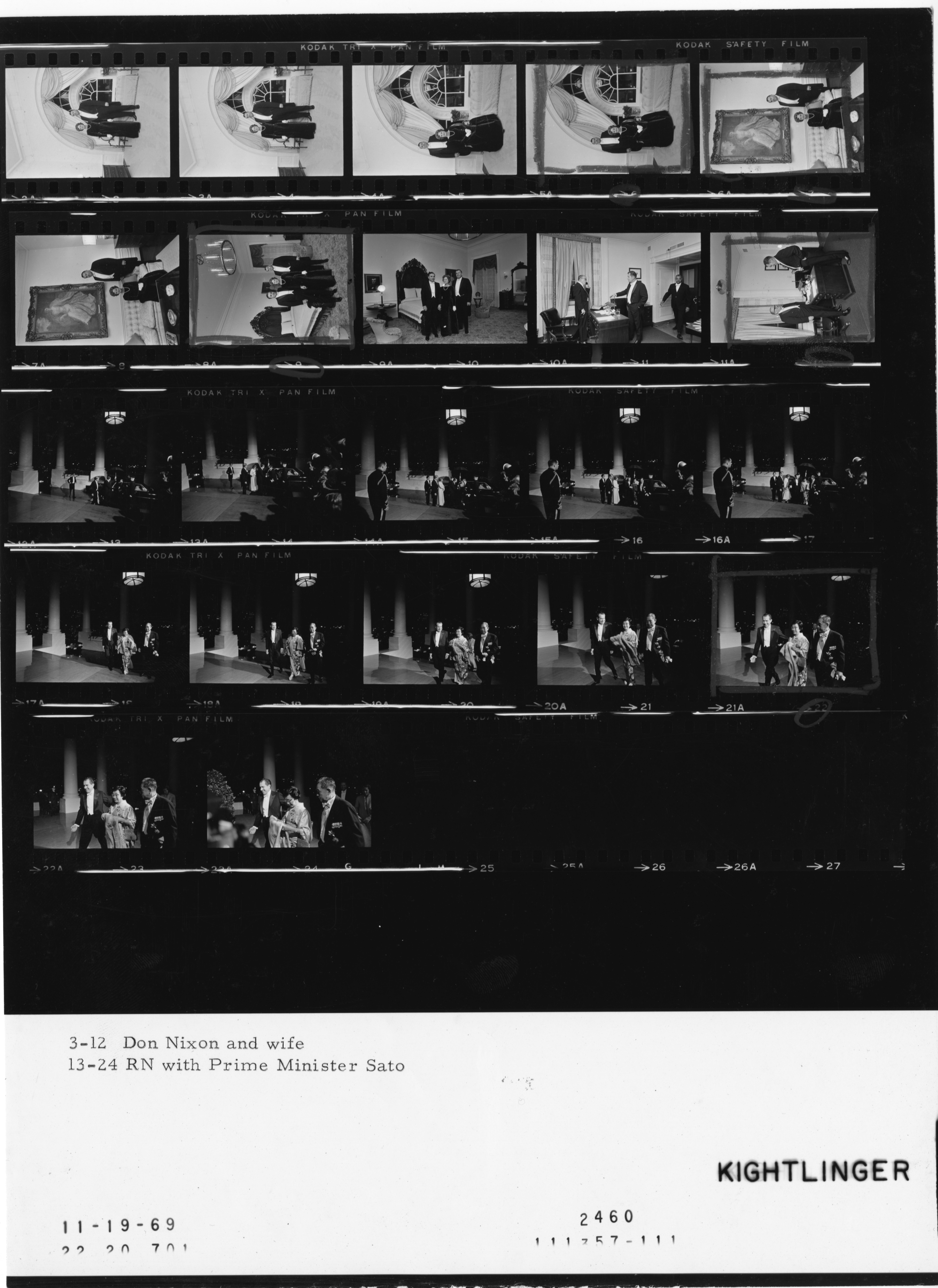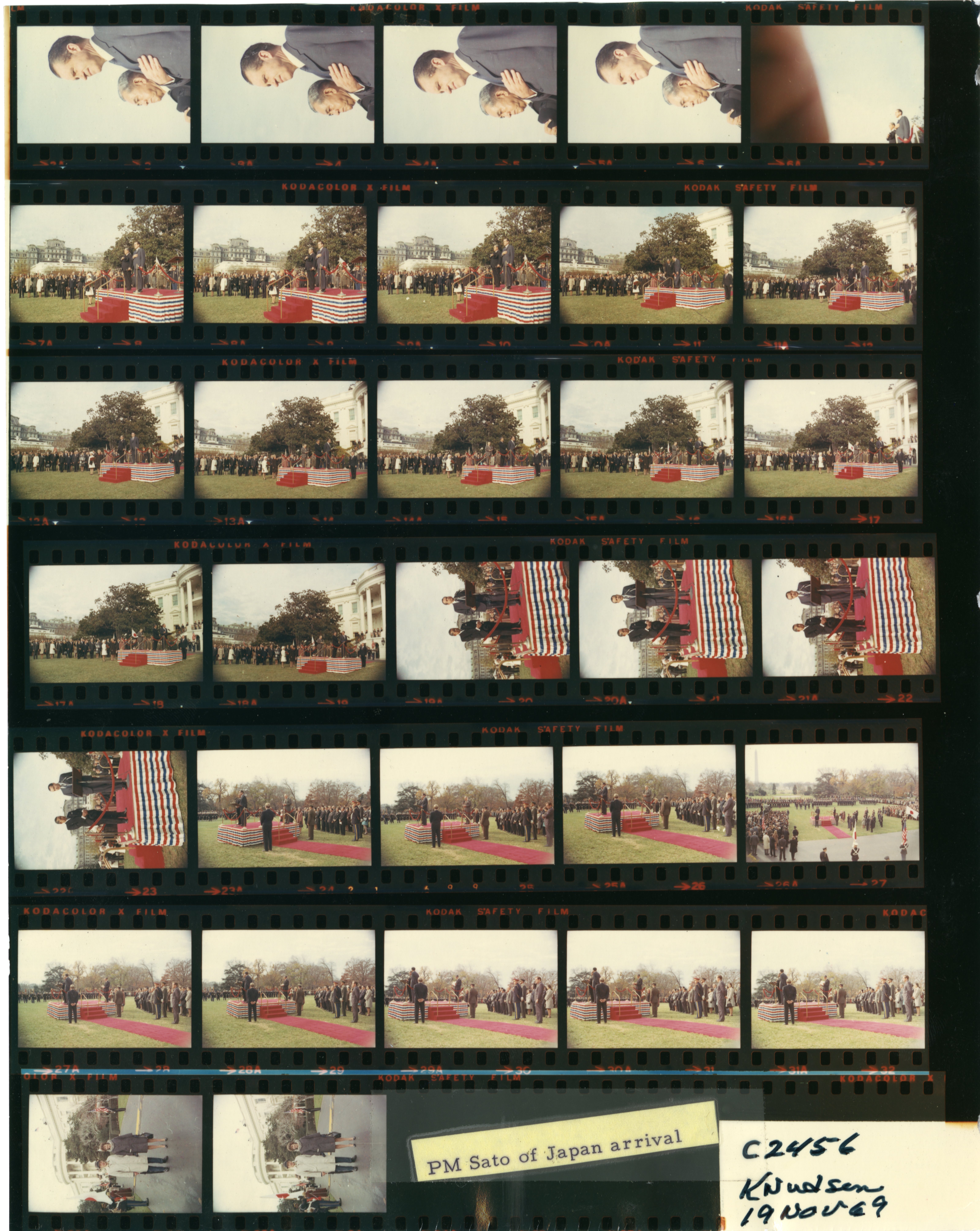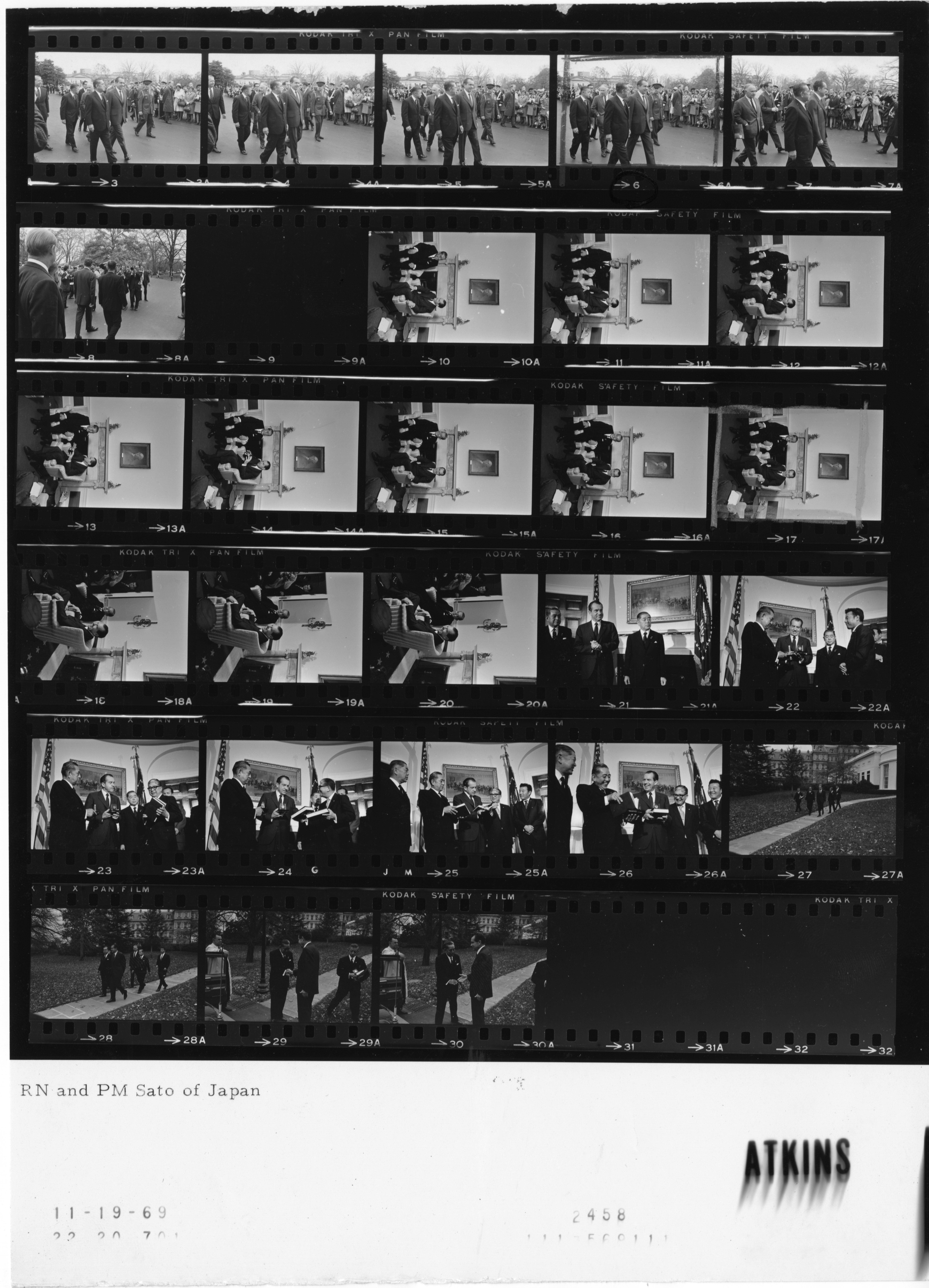 - Frame(s): WHPO-2458-02-08, President Nixon walking with Japanese Prime Minister Eisaku Satō past a crowd that attending Satō's arrival ceremony. 11/19/1969, Washington, D.C. White House, Oval Office. President Nixon, Eisaku Satō, Jerry Enomoto, Mike Masaoka, Kiichi Aichi, officials, guests.