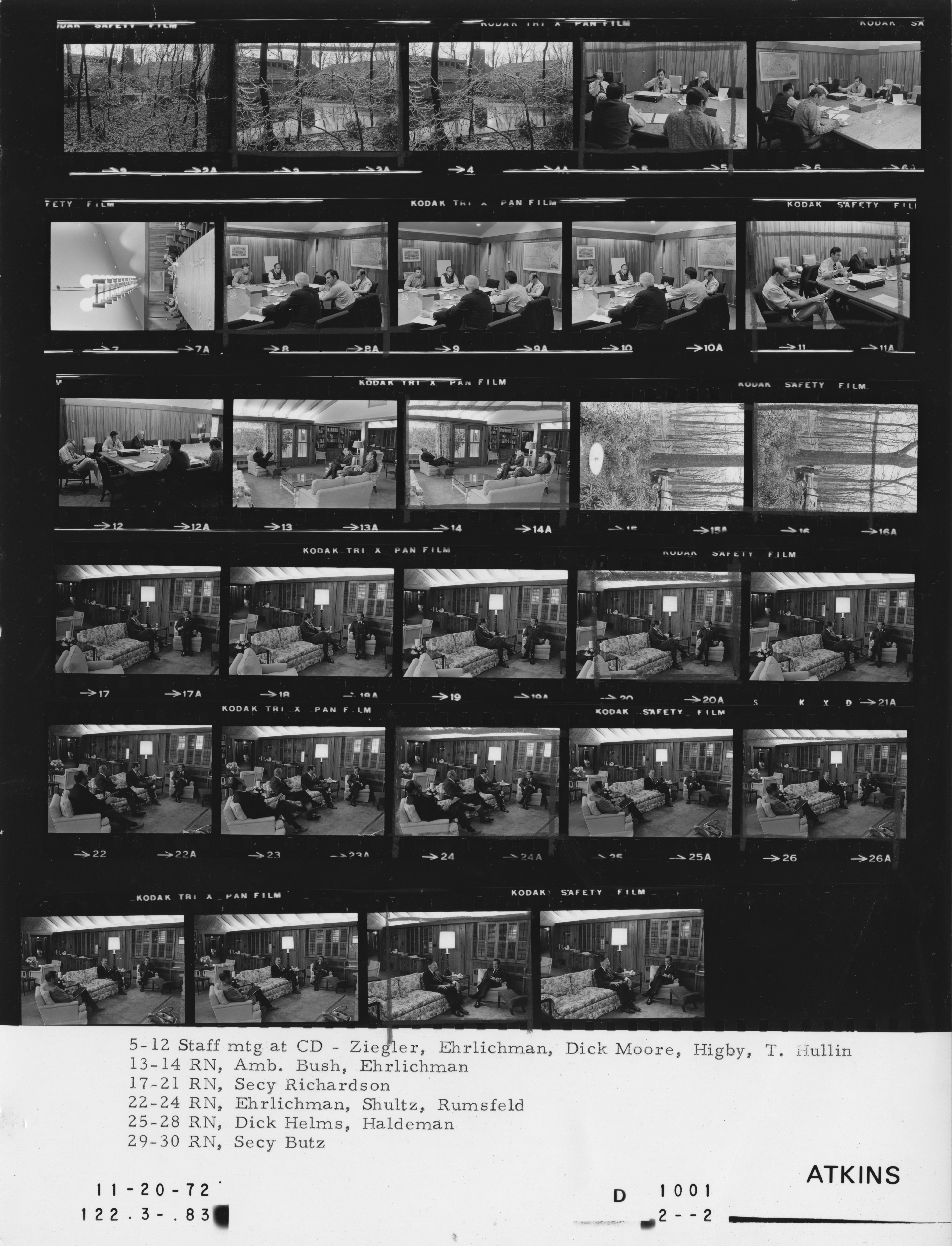 - Frame(s): WHPO-D1001-05-12, President Nixon and staff members during a meeting in the Aspen Lodge at Camp David. 11/20/1972, Camp David, Maryland Aspen Lodge, unidentified room. President Nixon, John Ehrlichman, George Bush, Elliott Richardson, Shultz, Rumsfeld, Richard Helms, Haldeman, Butz, unidentified uniformed man, Ronald Ziegler, Richard Moore, Larry Higby, Tom Hullin.