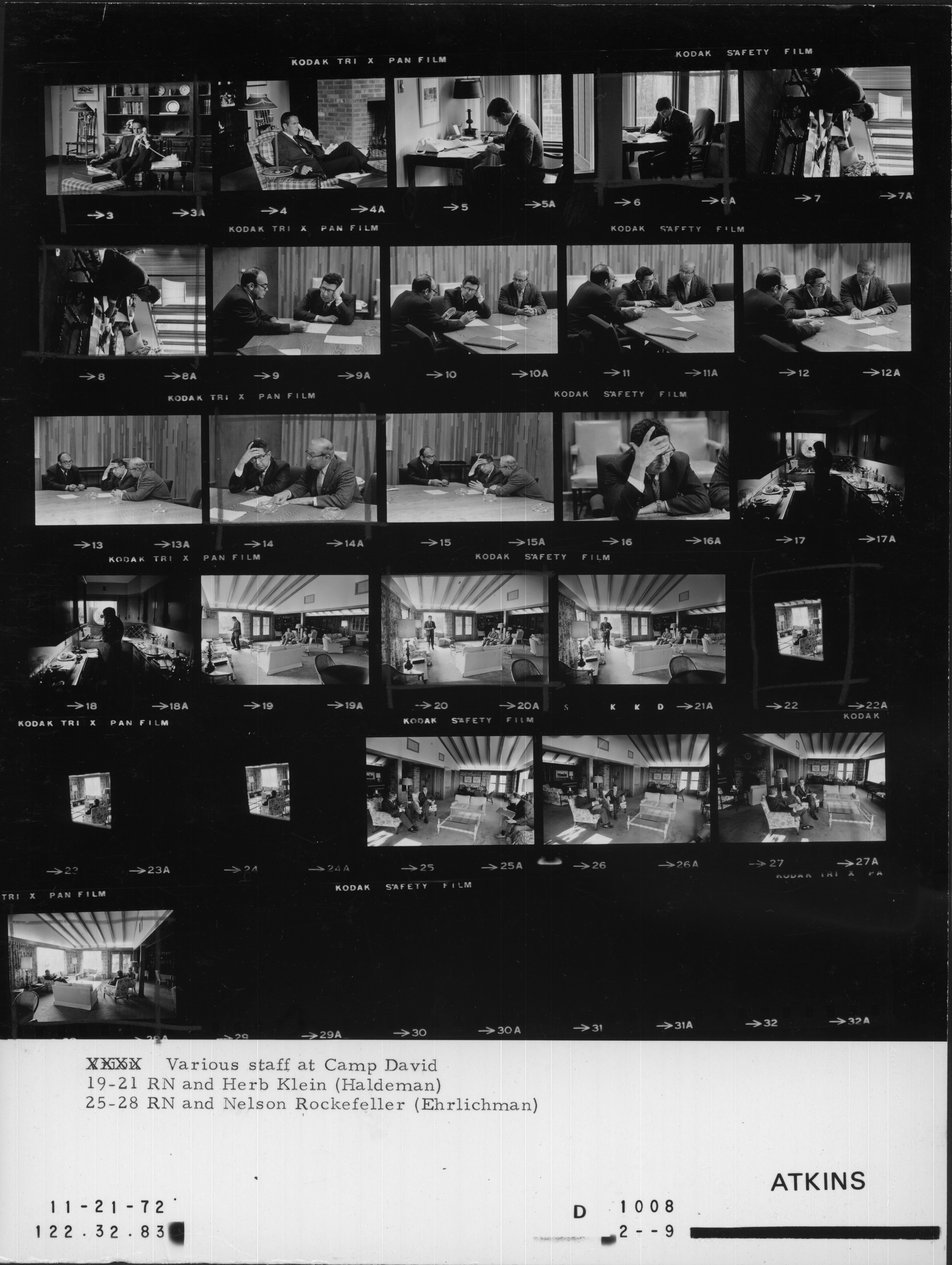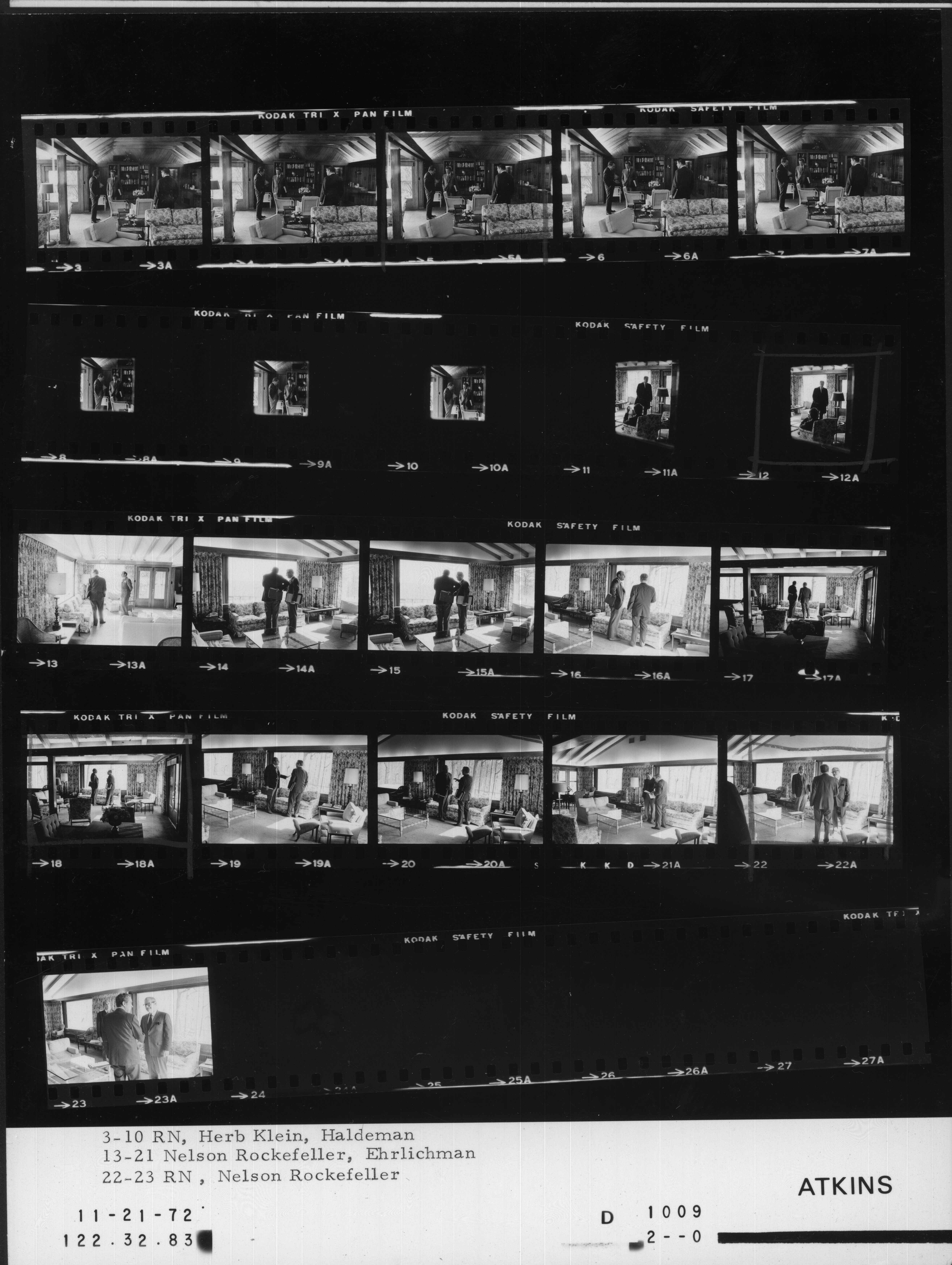 - Frame(s): WHPO-D1009-03-12, President Nixon at Camp David standing in the living room speaking with HR Haldeman, Herb Klein, Gov. Rockefeller Ehrlichman. 11/21/1972, Camp David, Maryland Aspen Lodge Den. President Nixon, Herb Klein, H.R. Haldeman, John Ehrlichman, Nelson Rockefeller.