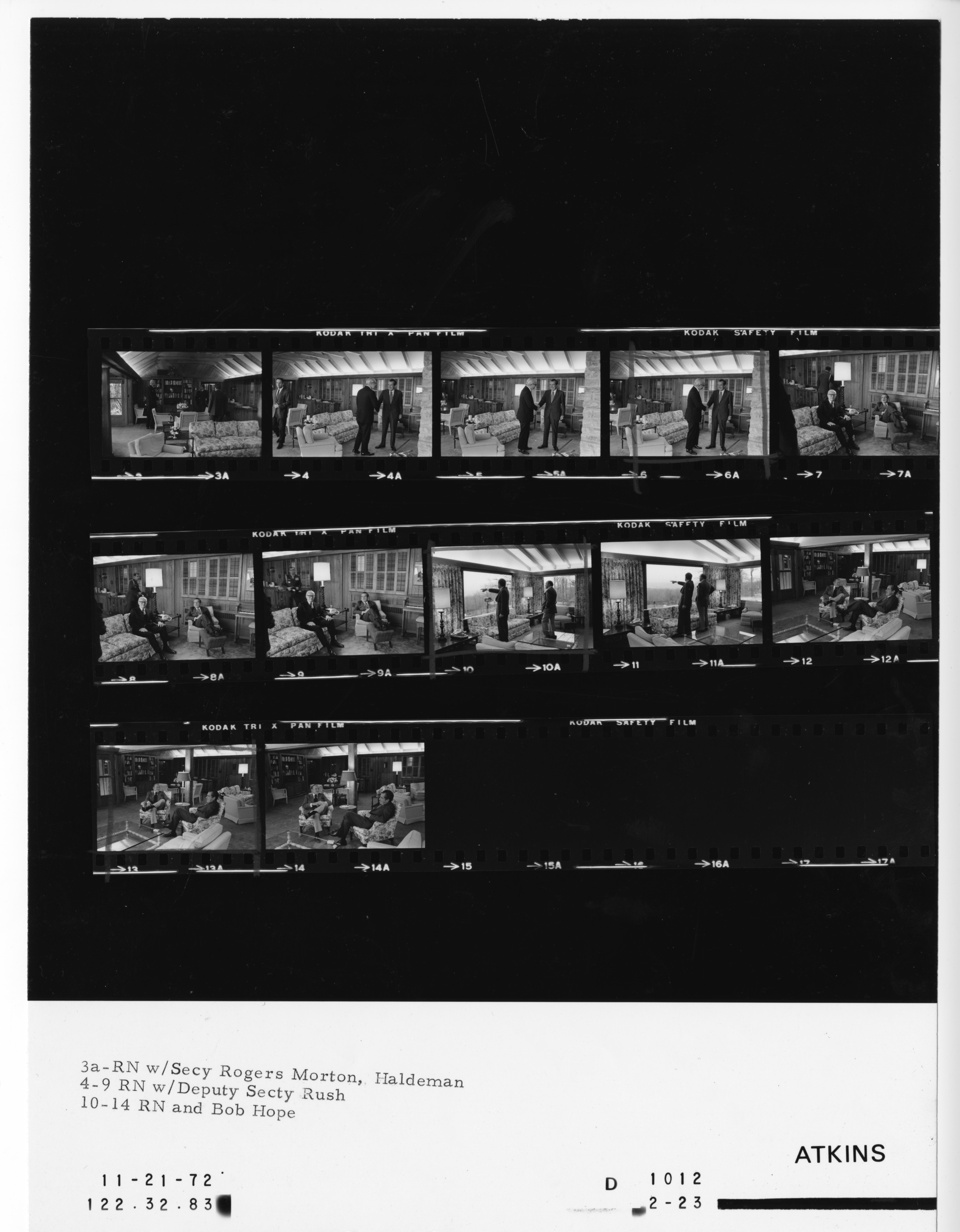 - Frame(s): WHPO-D1012-04-09, President Nixon greeting and seated with Deputy Secretary of Defense Kenneth Rush. President Nixon informs Kenneth Rush that he will soon replace William Rogers as Secretary of State. 11/21/1972, Camp David, Maryland Aspen Lodge Den. President Nixon, Kenneth Rush, Maj. John V. Brennan (AKA) Jack Brennan.