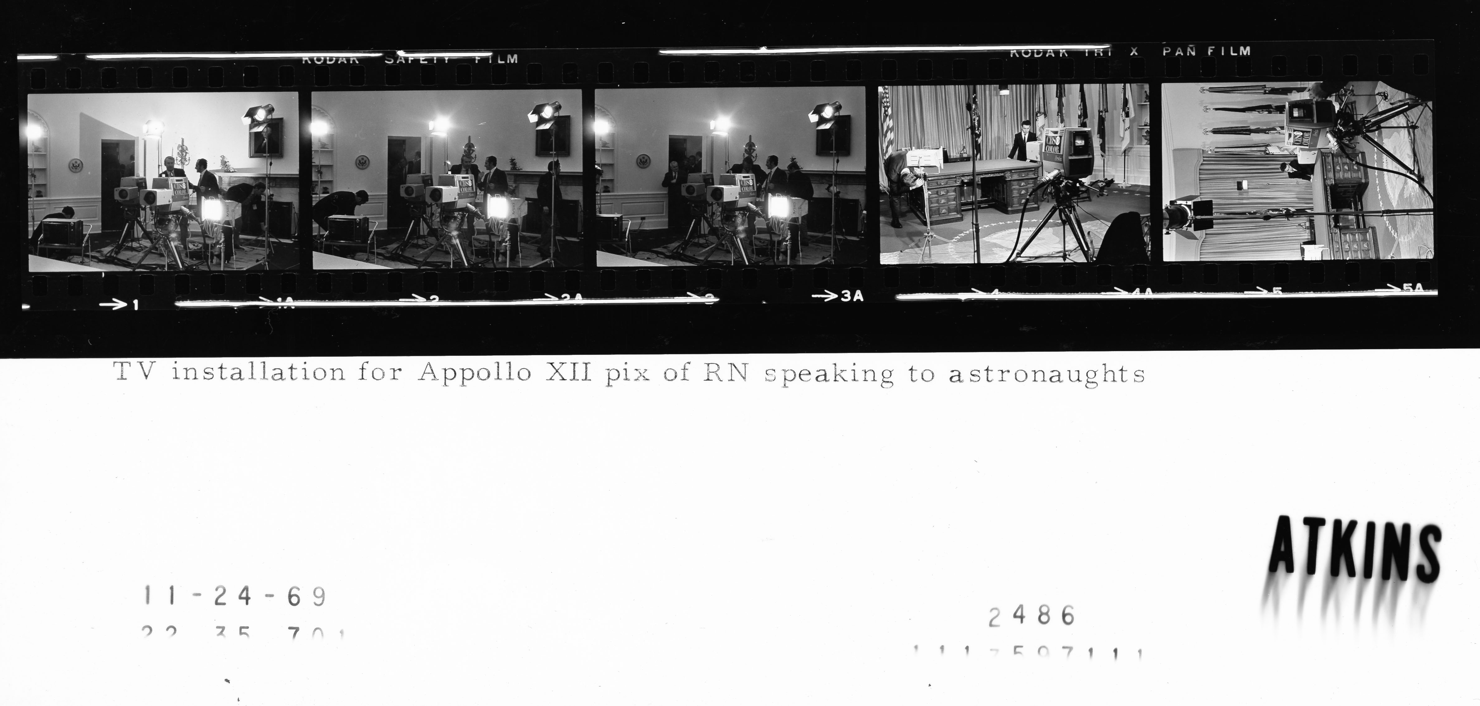- Frame(s): WHPO-2486-01-05, Cameramen setting up broadcasting equipment in the Oval Office for a television broadcast of President Nixon's phone call to the Apollo 12 astronauts. 11/24/1969, Washington, D.C. White House, Oval Office. unidentified television technicians.