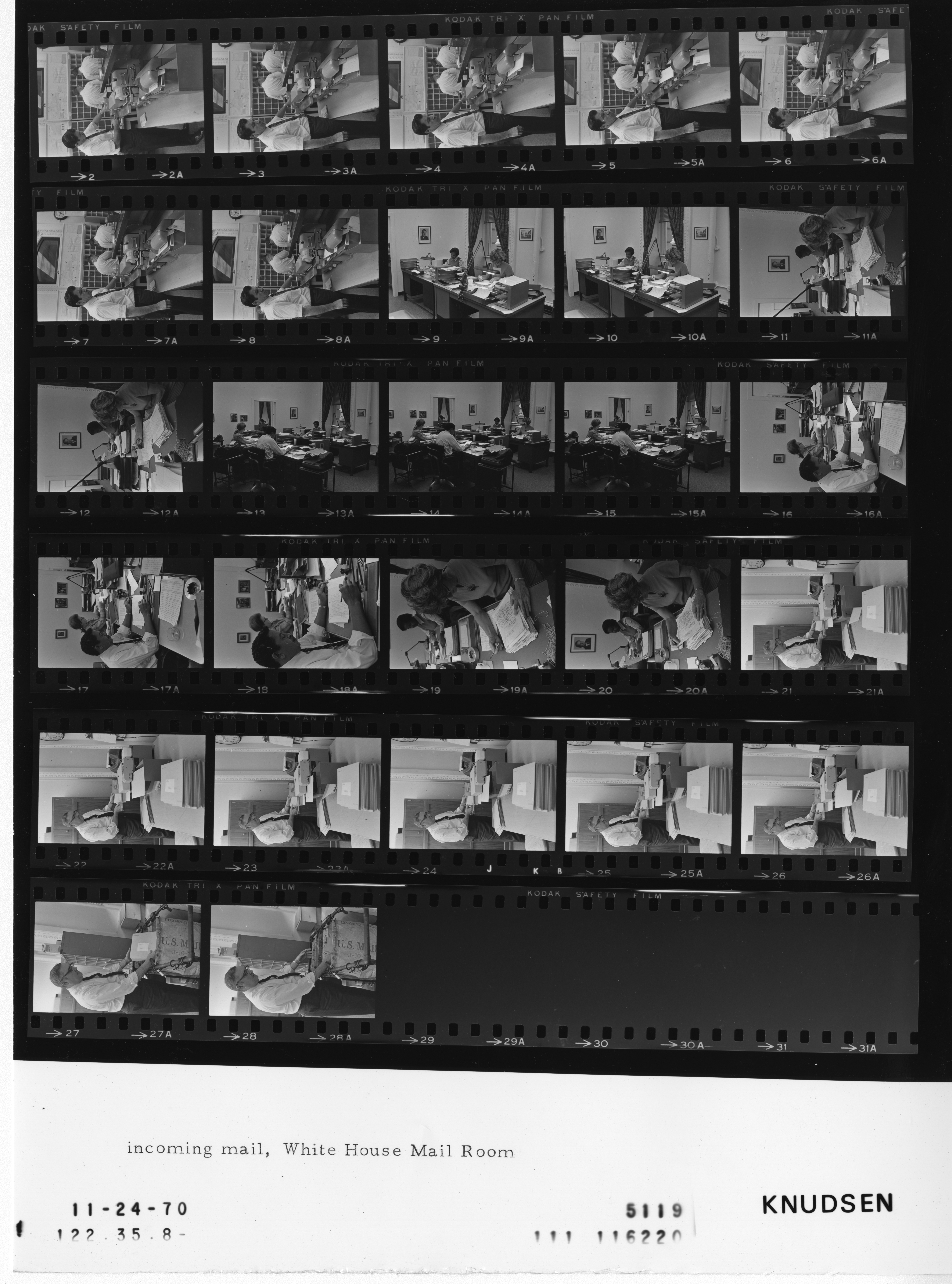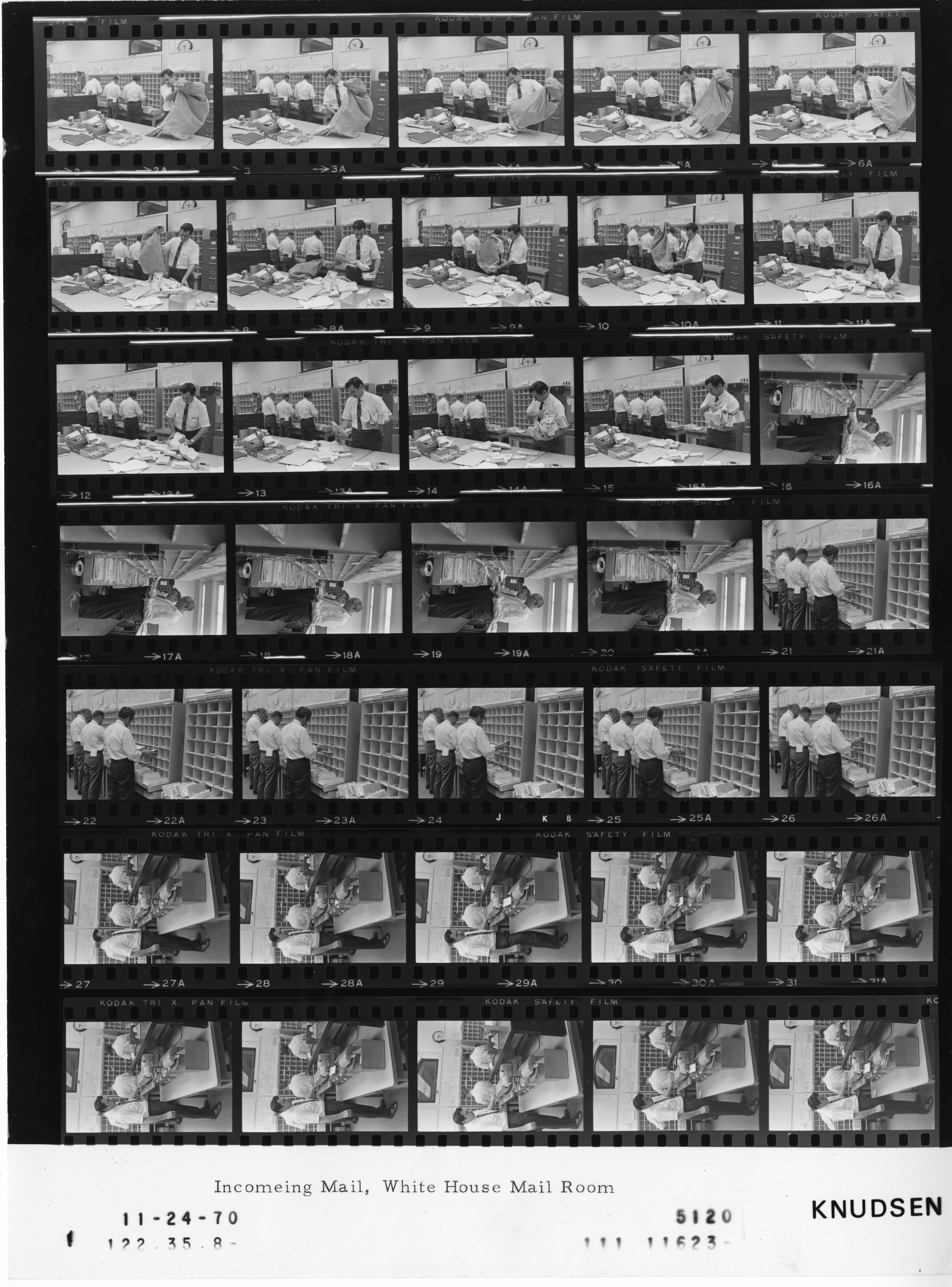 - Frame(s): WHPO-5119-02-28, White House Mail Room staff processing incoming mail. 11/24/1970, Washington, D.C. White House, Mail Room. White House Mail Room staff.