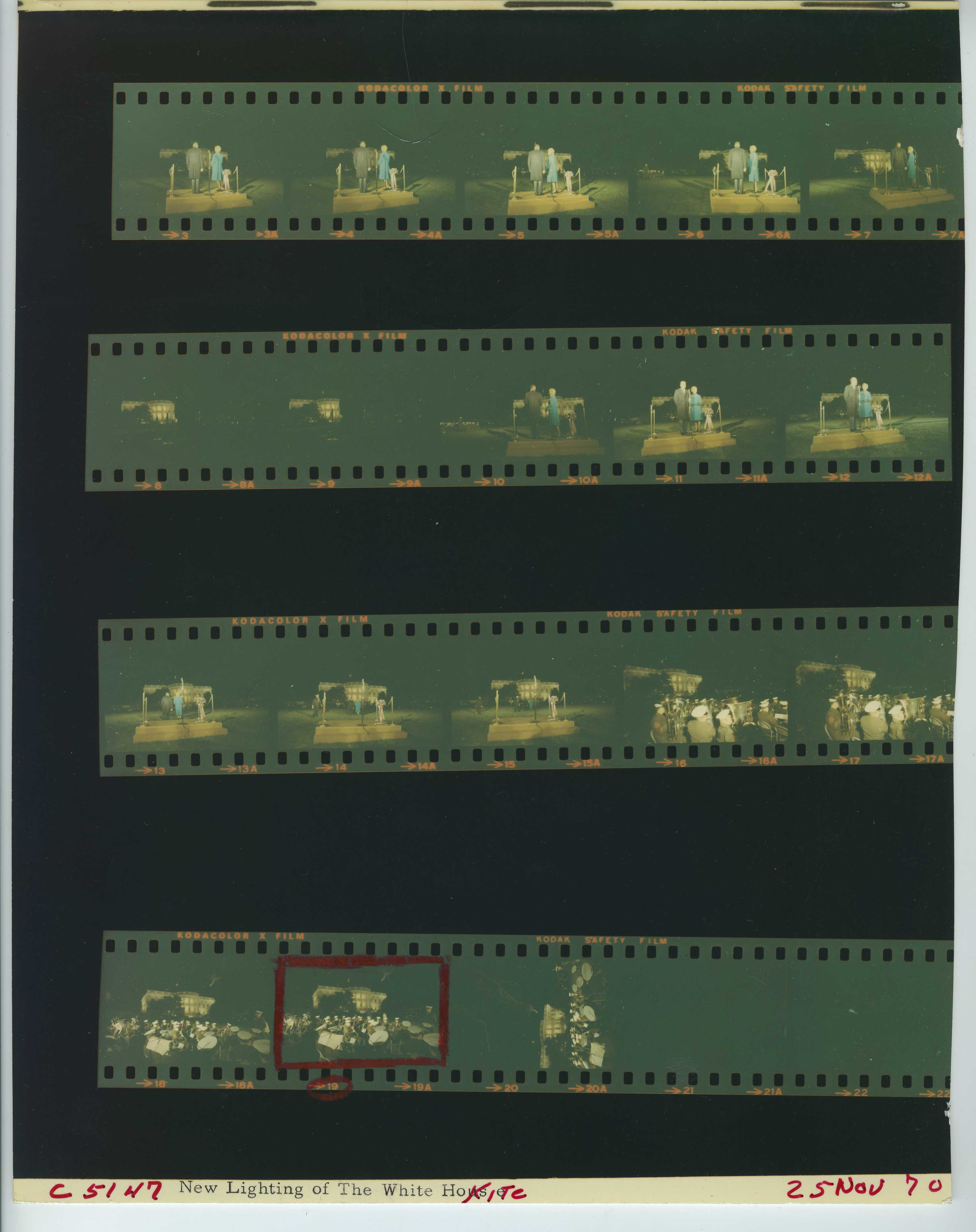 - Frame(s): WHPO-5175-02A-19A, President Nixon and Pat Nixon standing on a podium outside the White House at night during the White House Christmas lighting ceremony. 11/25/1970, Washington, D.C. White House. President Nixon, Pat Nixon.