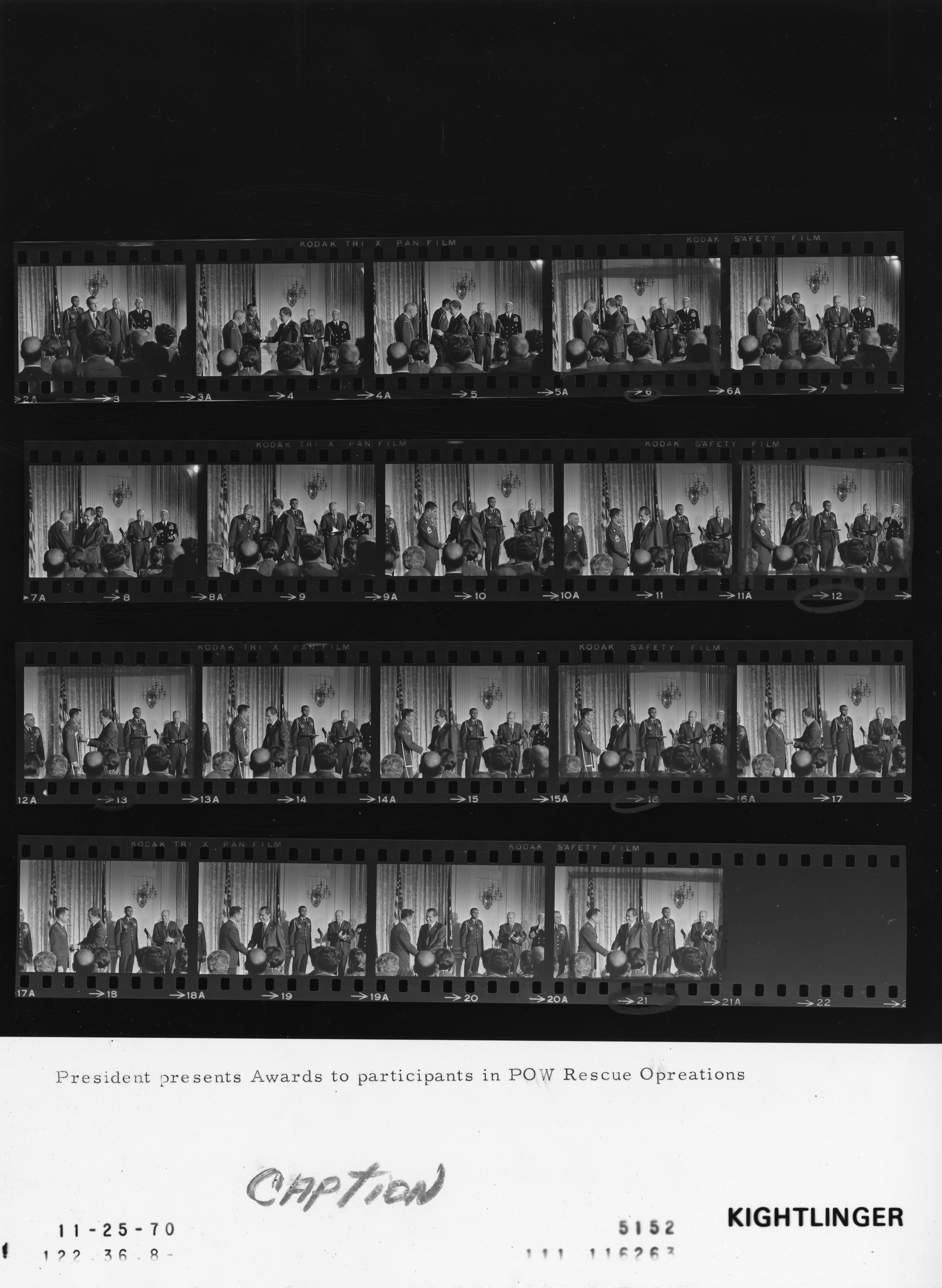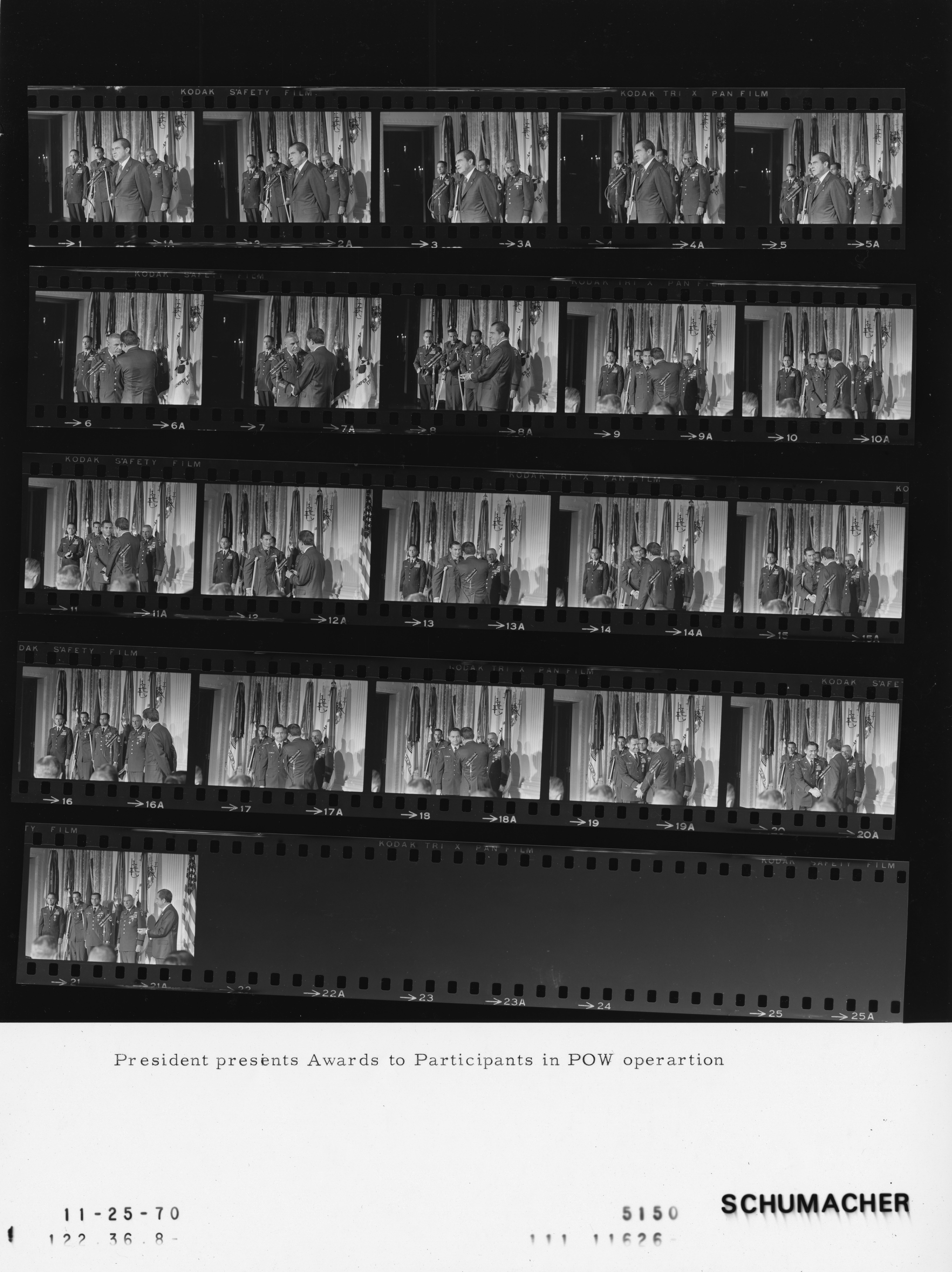 - Frame(s): WHPO-5151-01-22, President Nixon presents awards to participants in the Son Tay POW (Vietnam Prisoner of War) Rescue Mission, including President Nixon, Col. Arthur D. Simons, SFC Tyrone J. Adderly, T/Sgt. LeRoy M. Wright, Brig. Gen. Leroy J. Manor. 11/25/1970, Washington, D.C. White House, State Dining Room. President Nixon, Arthur D. Simons, Tyrone J. Adderly, LeRoy M. Wright, Leroy J. Manor.