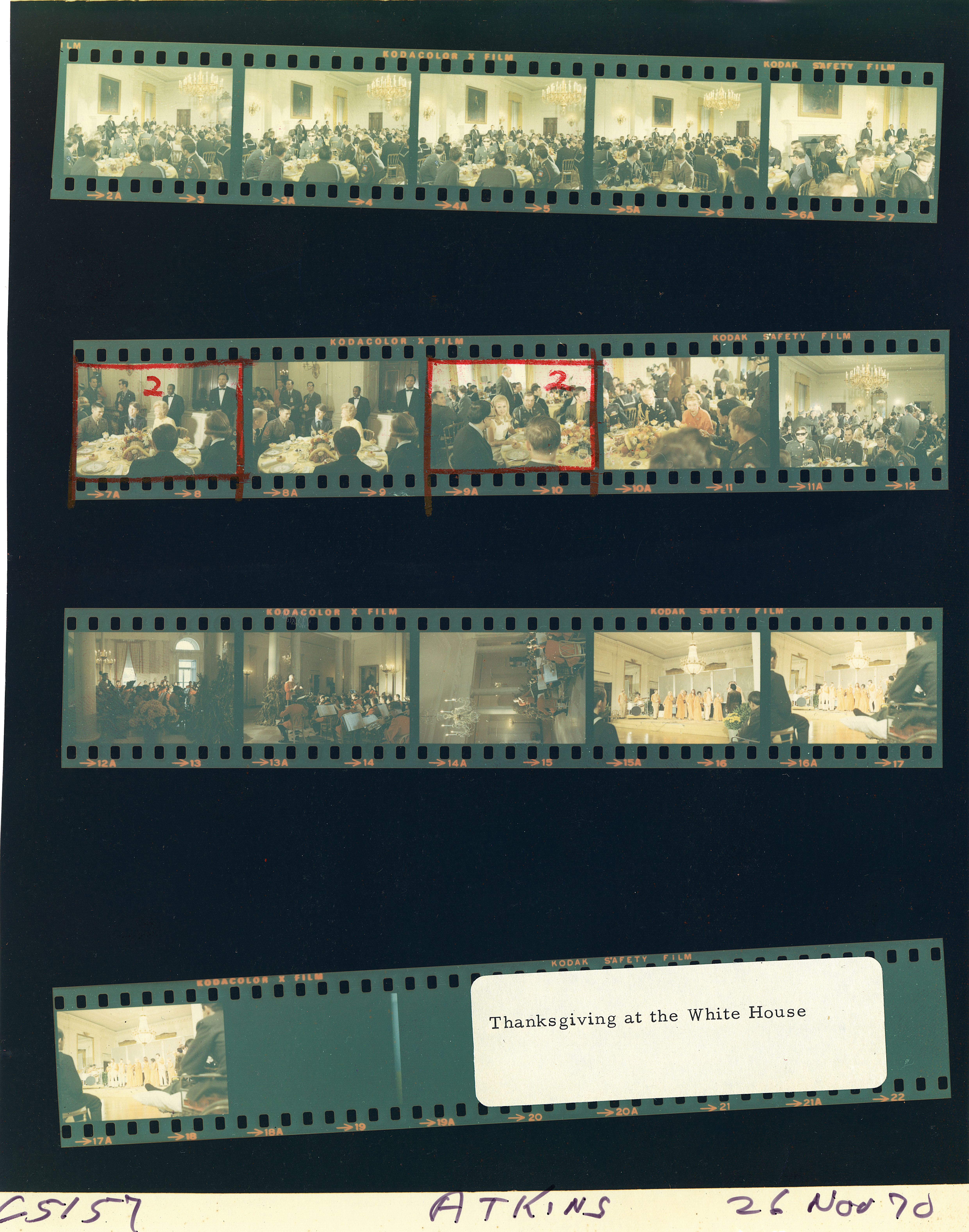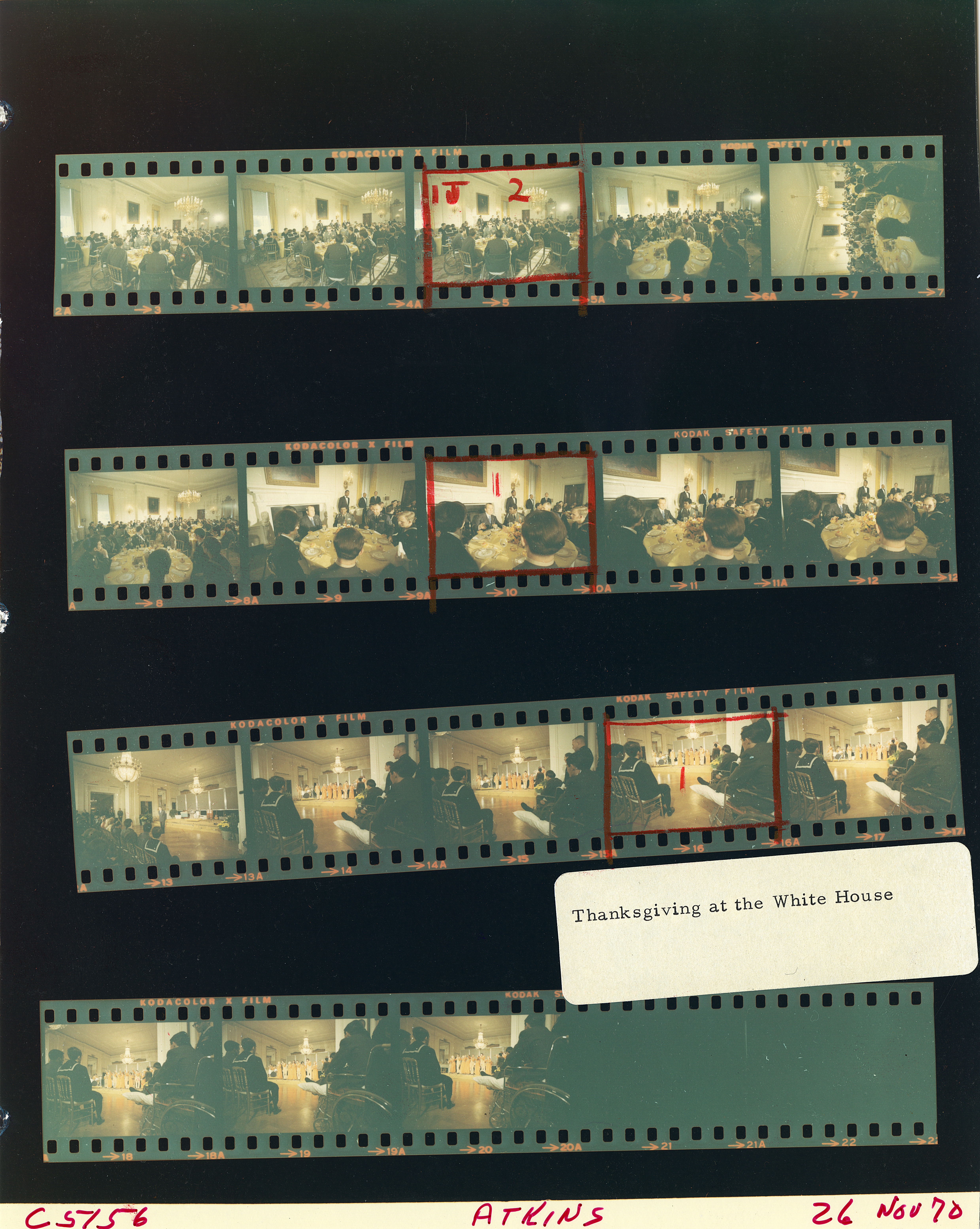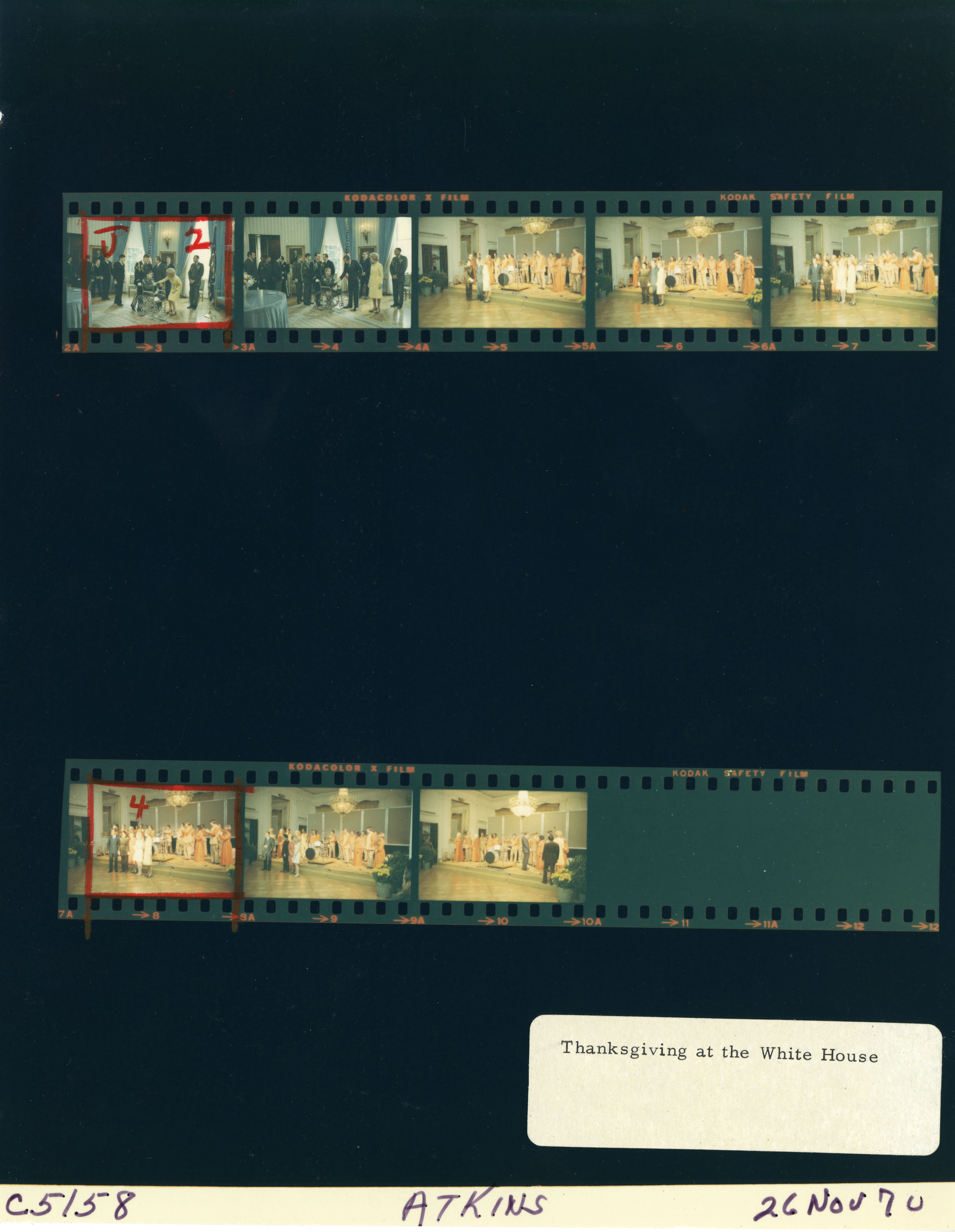 - Frame(s): WHPO-5157-02A-17A, President Nixon and Pat Nixon hosting a Thanksgiving luncheon for military servicemen and servicewomen veterans from Walter Reed Hospital. 11/26/1970, Washington, D.C. White House, Blue Room. President Nixon, Pat Nixon, guests.
