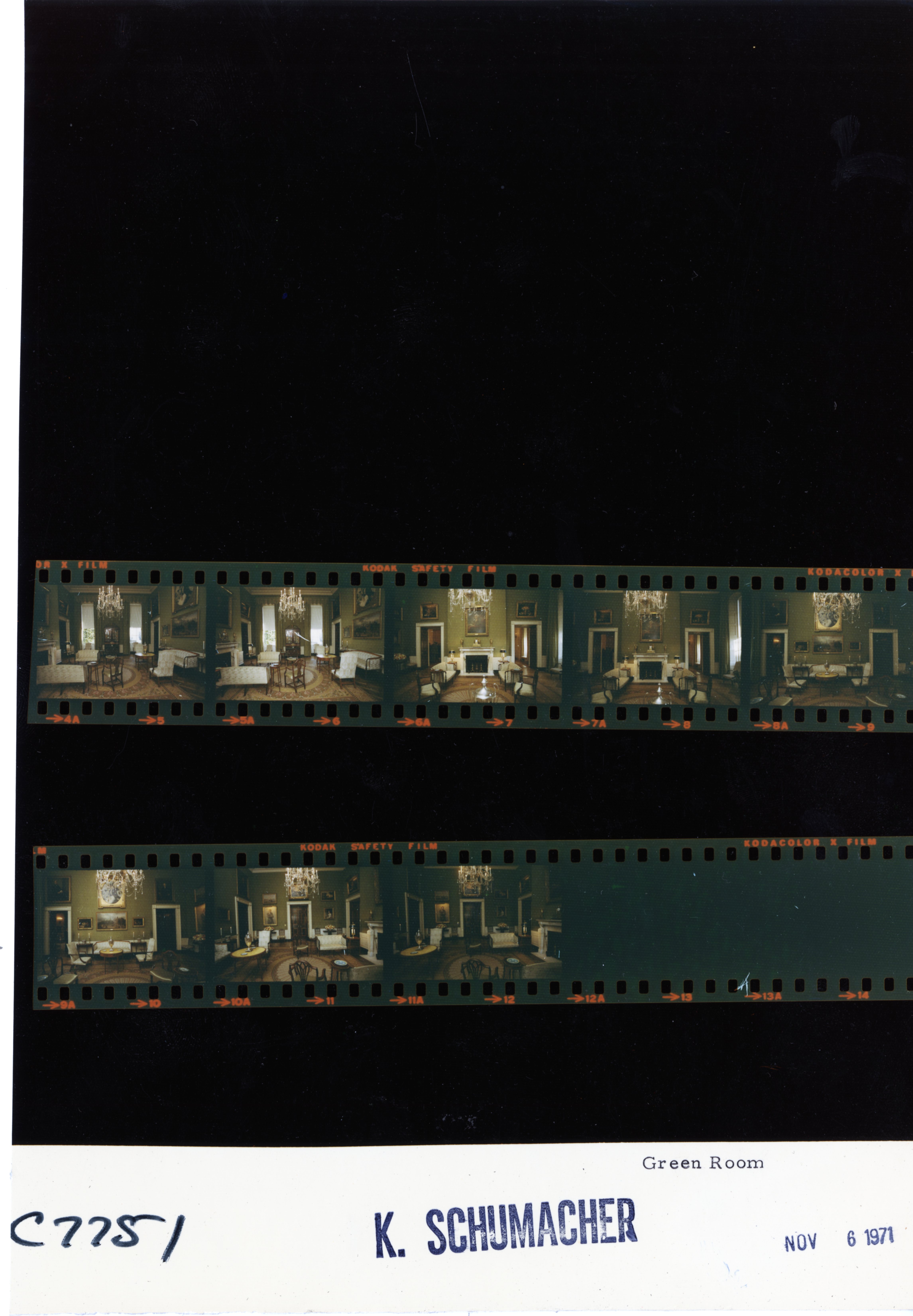 - Frame(s): WHPO-7751-04A-11A, Green Room, interior, including chandelier, couches, tables, fireplace and paintings. 11/6/1971, Washington, D.C. White House, Green Room.