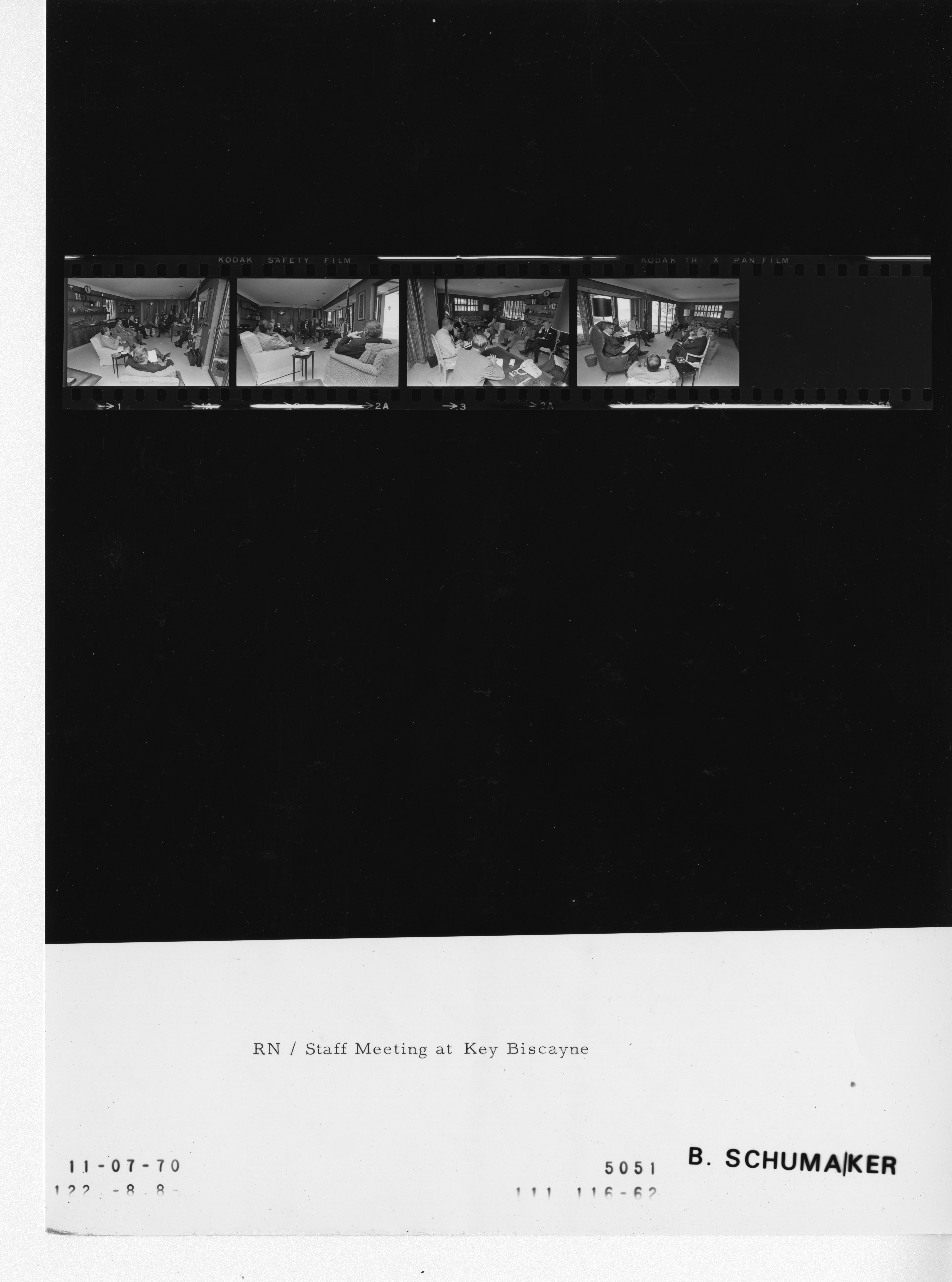 - Frame(s): WHPO-5051-01A, President Nixon attending a staff meeting at the Key Biscayne compound sitting beside John N. Mitchell, Donald Rumsfeld, Robert Finch, John D. Ehrlichman, Charles Colson, Bryce Harlow, and H.R. Haldeman. They are having a brainstorming session in the aftermath of the 1970 Congressional election. 11/7/1970, Key Biscayne, Florida Key Biscayne Compound, Presidential Residence. President Nixon, John N. Mitchell, Donald Rumsfeld, Robert Finch, John D. Ehrlichman, Charles Colson, Bryce Harlow, H.R. Haldeman.