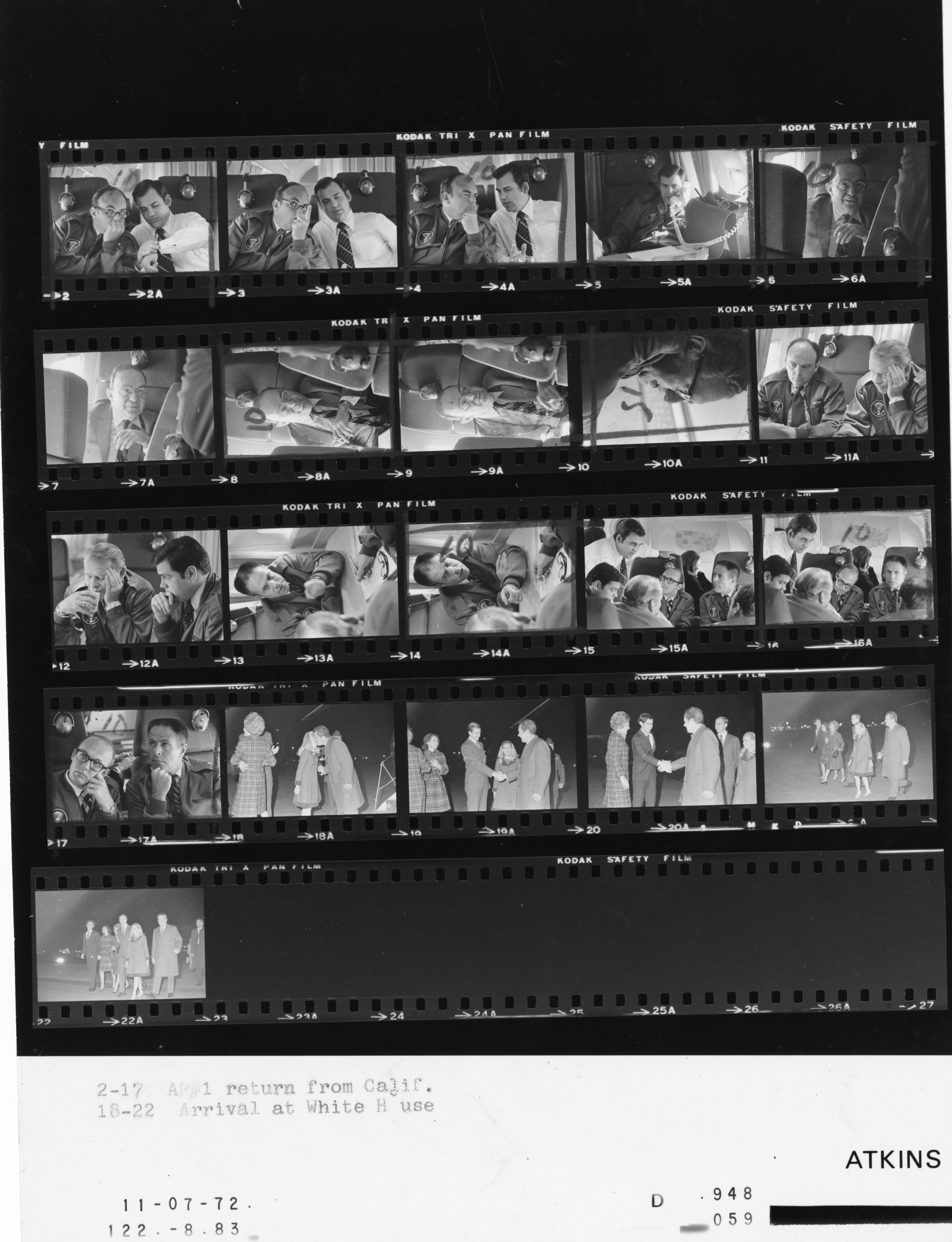 - Frame(s): WHPO-D0948-02A-17A, President Nixon's staff members traveling on Air force One plane flying to D.C. from California. 11/7/1972, Washington, D.C., enroute Air force One. President Nixon, Pat Nixon, Ehrlichman, Ronald Ziegler, Haldeman, staff members, David Eisenhower, Julie Eisenhower, Tricia Nixon Cox, Ed Cox, Henry Kissinger.