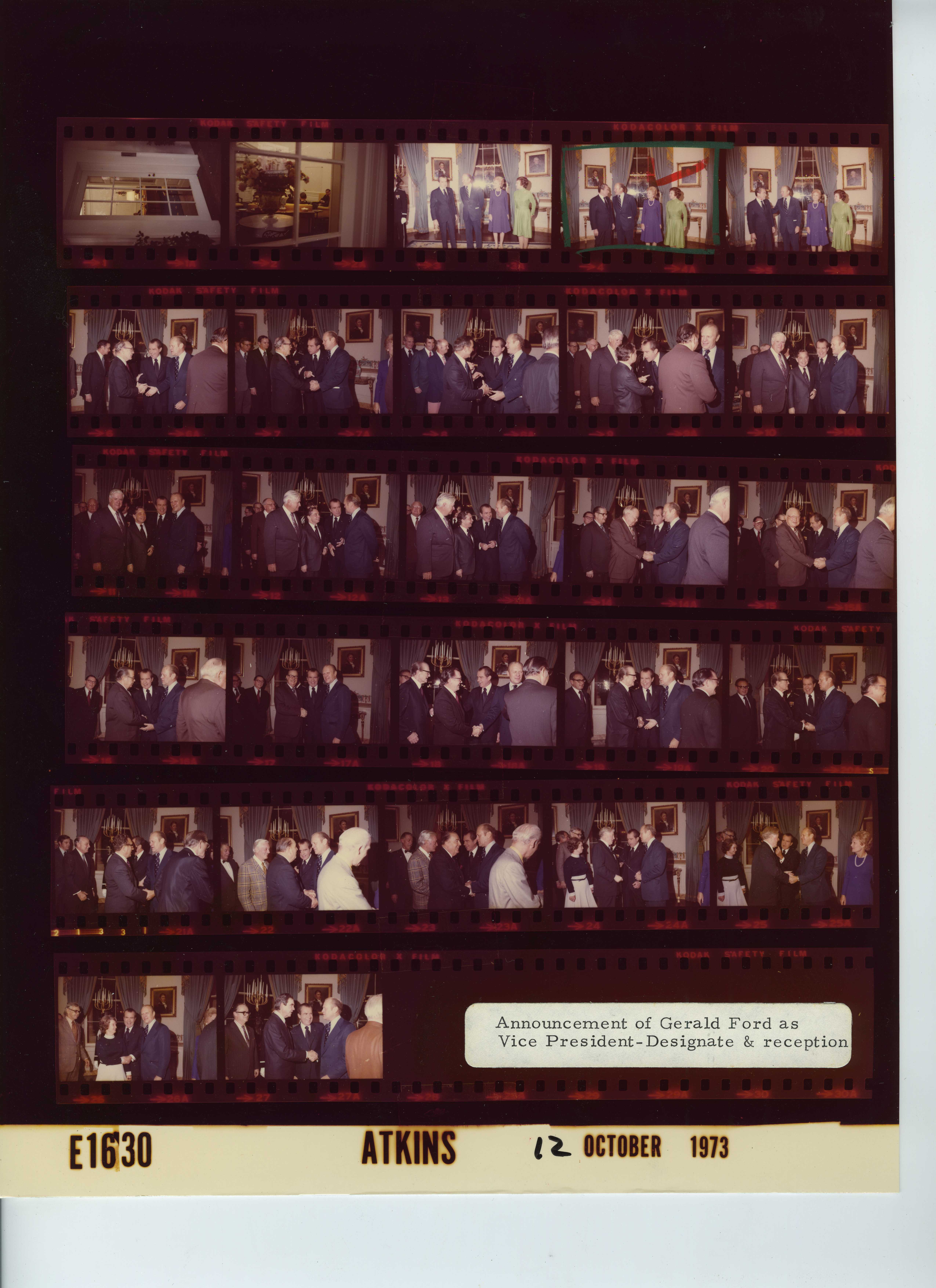 - Frame(s): WHPO-E1632-, Announcment of Gerald Ford as Vice President-Designate. 10/12/1973, Washington, D.C. White House, East Room. President Nixon, Gerald Ford, unidentified officials, members of the press, television cameramen.
