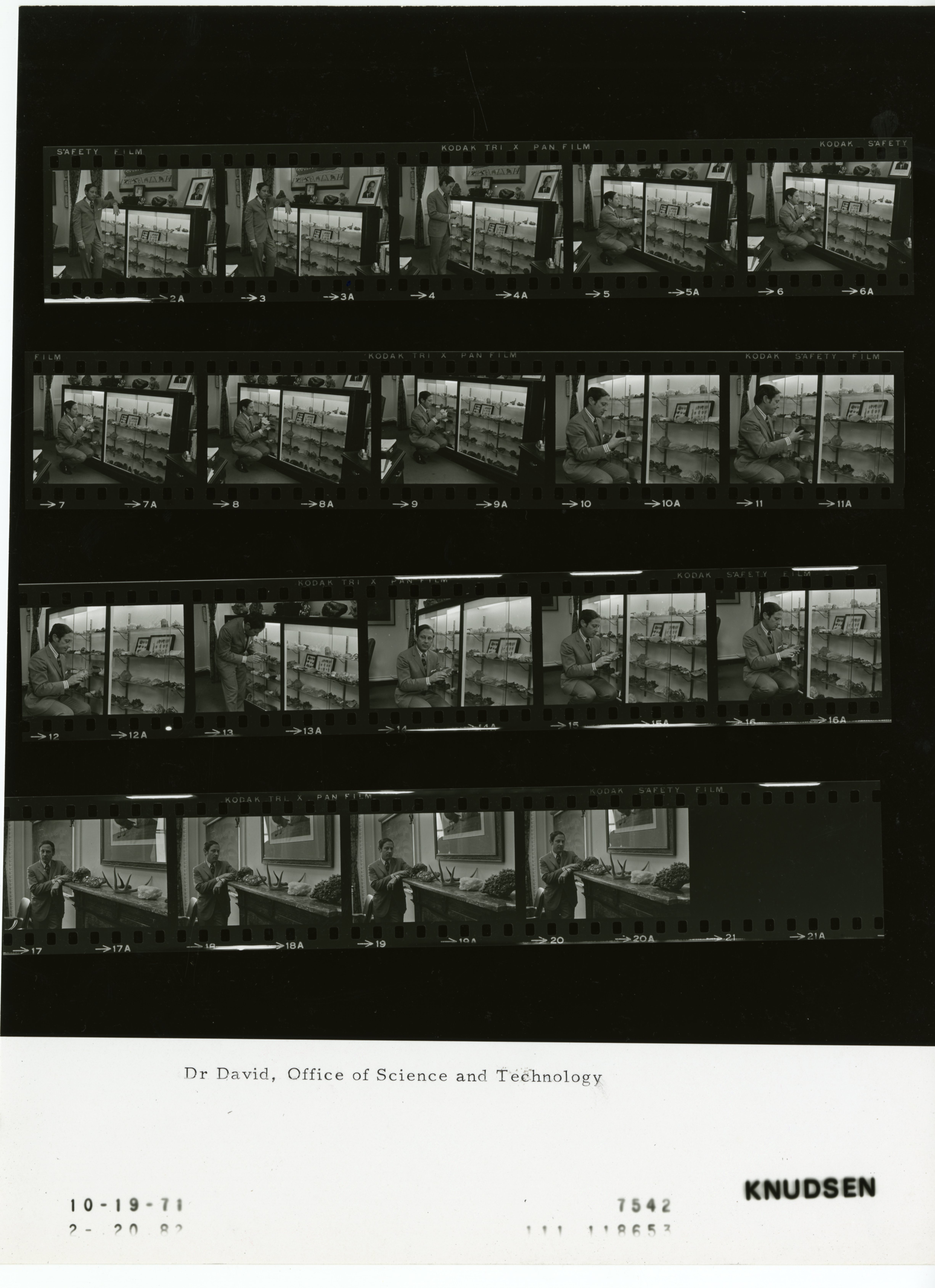 - Frame(s): WHPO-7542-02-20, Dr. Edward David, Jr., Presidential Science Advisor, in front of display cases and pointing out items on display. 10/19/1971, Washington, D.C. unknown. Edward David, Jr.