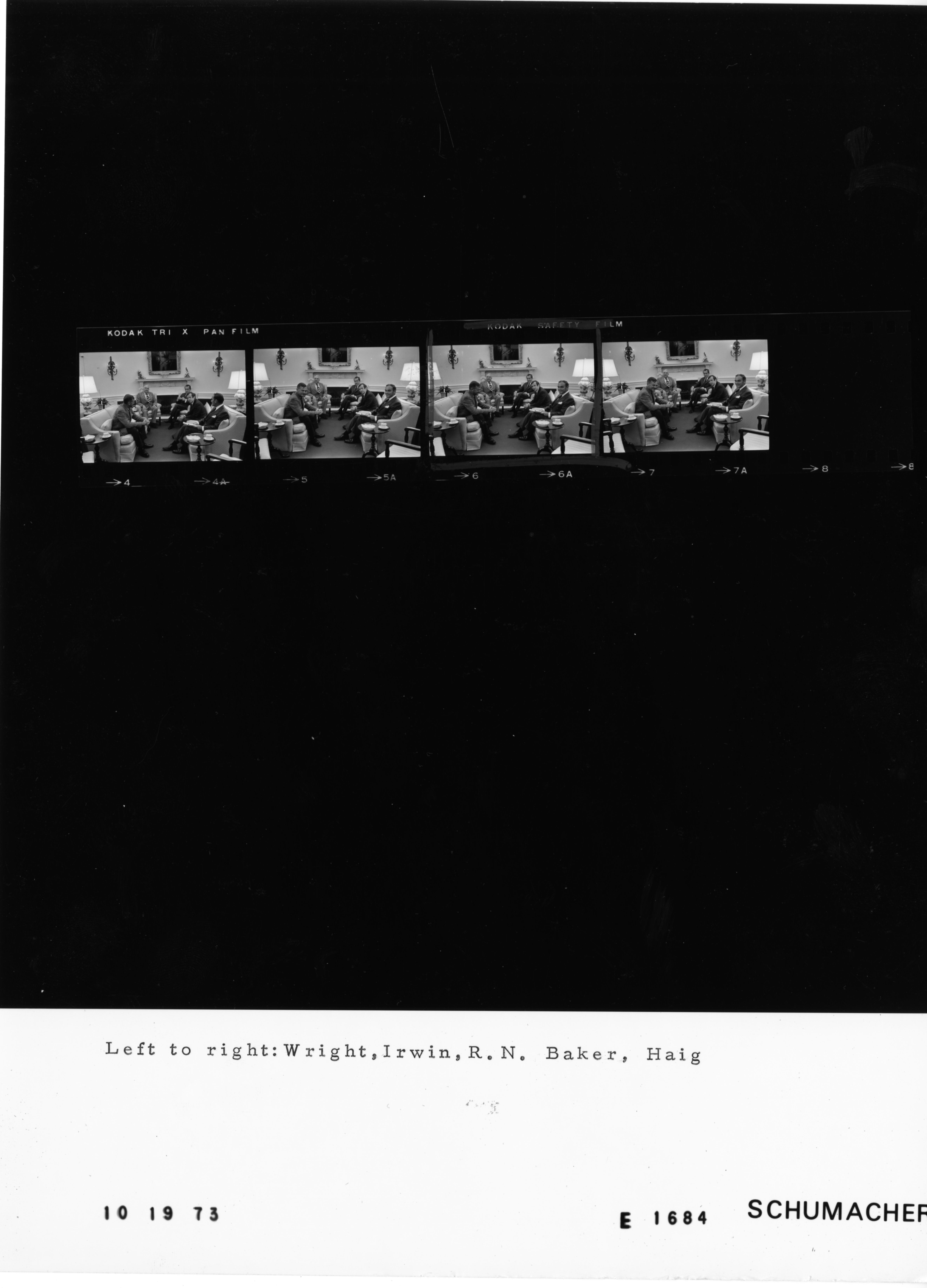 - Frame(s): WHPO-E1684-05, President Nixon seated in the Oval Office with Chairman of the Senate Select Committee on Presidential Campaign Activities Senator Sam Ervin, Jr. (D-North Carolina), Vice Chairman of the Senate Select Committee on Presidential Campaign Activities Senator Howard H. Baker, Jr. (R-Tennessee), Consultant Charles A. Wright, and staff member Gen. Alexander Haig. 10/19/1973, Washington D.C. White House, Oval Office. President Nixon, Sam J. Ervin, Jr., Howard H. Baker, Jr., Charles A. Wright, General Alexander Haig.